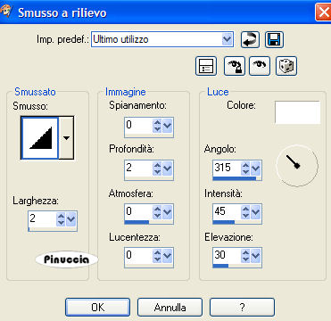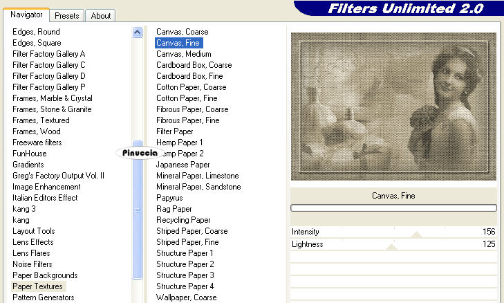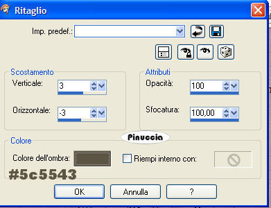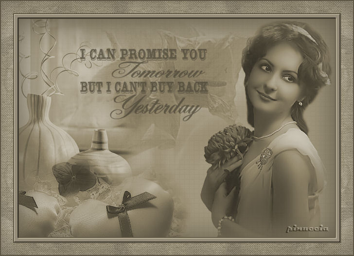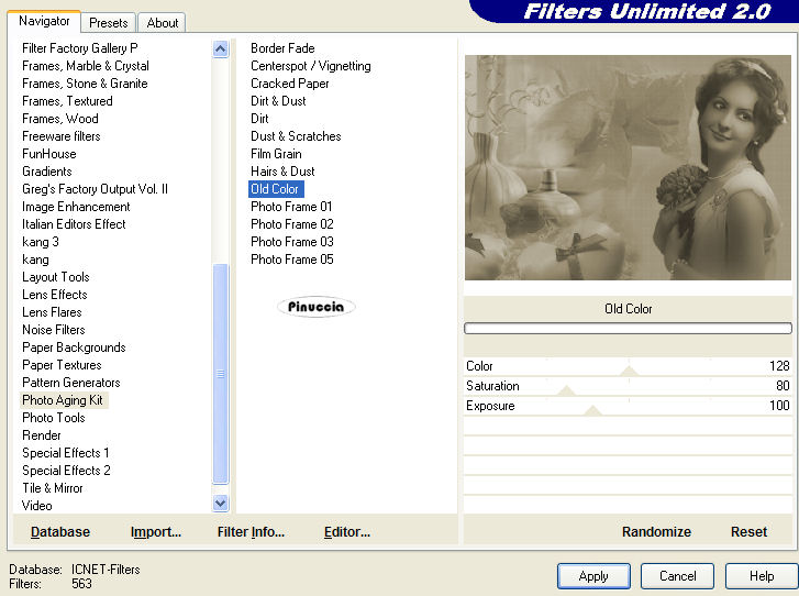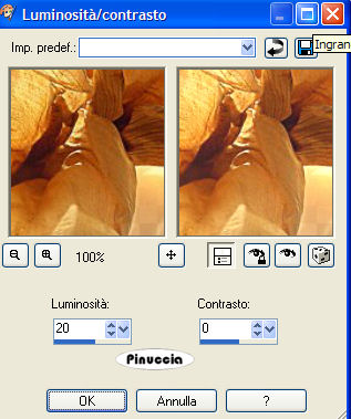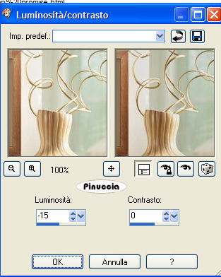 qui puoi trovare qualche risposta ai tuoi dubbi. Se l'argomento che ti interessa non è presente, ti prego di segnalarmelo. Questo tutorial è stato scritto in PSP 9, ma può essere eseguito con qualsiasi versione del programma. Occorrente: Materiale qui Se vuoi condividere i tubes, per favore rispetta il lavoro degli autori, e lascia intatto il livello del watermark. Filtro: Penta.com qui Simple qui Filters Unlimited 2.0 qui Photo Aging Kit qui Per usare il filtro Photo Aging Kit, devi importarlo nel Filters Unlimited. Come fare vedi qui Apri una nuova immagine trasparente 650 x 450 pixels. Imposta il colore di primo piano con #b1a897, e il colore di sfondo con #5c5543. Riempi l'immagine con il colore di primo piano.Livelli>Duplica. Effetti>Plugins>Penta.com - Dot and Cross, con i settaggi standard. ![]() Abbassa l'opacità di questo livello al 16%. Apri il tube Mallu.misted.flower e vai a Modifica>Copia. Torna al tuo lavoro e vai a Modifica>Incolla>Incolla come nuovo livello. Con lo strumento Deformazione ,"tira" il fiore a destra e in alto per circa 30 pixels, vedi il mio esempio. Cambia la modalità di miscelatura di questo livello in Luminanza, e abbassa l'opacità al 30%. Apri il tube mc 3071 e vai a Modifica>Copia. Torna al tuo lavoro e vai a Modifica>Incolla>Incolla come nuovo livello. Immagine>Rifletti. Immagine>Ridimensiona, al 75%, ricampionamento bicubica, tutti i livelli non selezionato. ![]() Regola>Correzione fotografica>Rimozione disturbo fotocamera digitale. Regola>Luminosità e contrasto>Luminosità e contrasto: ![]() Spostalo a destra, un po' in basso.Cambia la modalità di miscelatura di questo livello in Luminanza (esistente), e abbassa l'opacità all'82%. Attiva la copia del livello Raster 1 (dot and cross). Attiva lo strumento Gomma ,(dimensione 35, durezza 50, opacità 80), e cancella dal tube della donna i segni dell'effetto Dot and cross. Attiva il livello superiore. Apri il tube Kara T1511 e vai a Modifica>Copia. Torna al tuo lavoro e vai a Modifica>Incolla>Incolla come nuovo livello. Immagine>Rifletti. Regola>Luminosità e contrasto>Luminosità e contrasto: ![]() Sposta il tube a sinistra, un po' in alto.Cambia la modalità di miscelatura di questo livello in Luminanza, e abbassa l'opacità al 68%. Apri il tube SS_1810 e vai a Modifica>Copia. Torna al tuo lavoro e vai a Modifica>Incolla>Incolla come nuovo livello. Immagine>Ridimensiona, al 90%, tutti i livelli non selezionato. Cambia la modalità di miscelatura di questo livello in Luminanza, e abbassa l'opacità all'80%. Spostalo in basso a sinistra.Livelli>Unisci>Unisci tutto. Effetti>Plugins>Filters Unlimited 2.0 - Photo Aging Kit - Old Color: ![]() Selezione>Seleziona tutto. Effetti>Effetti 3d>Ritaglio: ![]() Selezione>Nessuna selezione. Modifica>Copia. Immagine>Aggiungi bordatura, 2 pixels, simmetriche, con il colore #5c5543. Immagine>Aggiungi bordatura, 8 pixels, simmetriche, con il colore #a69d88. Seleziona il bordo con la bacchetta magica ![]() ![]() Effetti>Effetti 3D>Smusso a rilievo: ![]() Selezione>Nessuna selezione. Immagine>Aggiungi bordatura, 2 pixels, simmetriche, con il colore #5c5543. Immagine>Aggiungi bordatura, 25 pixels, simmetriche, con il colore bianco. Seleziona il bordo con la bacchetta magica ![]() Modifica>Incolla>Incolla nella selezione. Effetti>Plugins>Simple - 4 Way Average. Effetti>Plugins>Filters Unlimited 2.0 - Paper Texture - Canvas fine: ![]() Selezione>nessuna selezione. Immagine>Aggiungi bordatura, 2 pixels, simmetriche, con il colore #5c5543. Livelli>Nuovo livello raster. Attiva lo strumento Pennello ![]() Cerca e seleziona il pennello ML 2 (i can promise you), dimensione 275, e applicalo sull'immagine con il tasto destro del mouse, per usare il colore di sfondo. Effetti>Effetti 3D>Sfalsa ombra: ![]() Aggiungi il tuo nome, se vuoi, in un nuovo livello. Livelli>Unisci>Unisci tutto. Salva in formato jpg. ![]() Se hai problemi o dubbi, o trovi un link non funzionante, o anche soltanto per dirmi che ti è piaciuto, scrivimi Le mie traduzioni sono regolarmente registrate 17 Maggio 2007 |