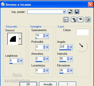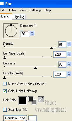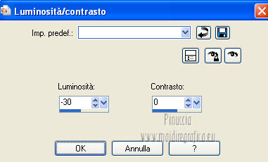 qui puoi trovare qualche risposta ai tuoi dubbi. Se l'argomento che ti interessa non è presente, ti prego di segnalarmelo. Questo tutorial è stato scritto con PSP 9. Per tradurlo, ho usato PSP X. Occorrente: Materiale qui I tubes sono di Guismo, Nikita, Jet, Marcio e Silke. (in questa pagina trovi i links ai loro siti). Se vuoi condividere i tubes, per favore rispetta il lavoro degli autori, e lascia intatto il livello del watermark. Filtri Eye Candy 4000 qui ![]() Apri una nuova immagine trasparente 700 x 500 pixels. Imposta il colore di primo piano con #202020, e il colore di sfondo con #808080. Riempi l'immagine trasparente con il colore di primo piano.Apri il tube calguismistedseasun5710 e vai a Modifica>Copia. Torna al tuo lavoro e vai a Modifica>Incolla come nuovo livello. Immagine>Rifletti. Spostalo a destra.Cambia la modalità di miscelatura di questo livello in Luminanza (esistente). Apri il tube 1293040178_paysages e vai a Modifica>Copia. Torna al tuo lavoro e vai a Modifica>Incolla come nuovo livello. Immagine>Rifletti. Spostalo un po' più in basso a sinistra.Cambia la modalità di miscelatura di questo livello in Luminanza (esistente). ![]() Apri il tube SKF_Landscape224 e vai a Modifica>Copia. Torna al tuo lavoro e vai a Modifica>Incolla come nuovo livello. Immagine>Rifletti. Immagine>Ridimensiona, al 45%, tutti i livelli non selezionato. ![]() Regola>Luminosità e contrasto>Luminosità e contrasto. ![]() Spostalo in basso a sinistra.Cambia la modalità di miscelatura di questo livello in Luminanza (esistente). Apri il tube mc2653 e vai a Modifica>Copia. Torna al tuo lavoro e vai a Modifica>Incolla come nuovo livello. Immagine>Ridimensiona, 2 volte al 45%, tutti i livelli non selezionato. Regola>Messa a fuoco>Maschera di contrasto. ![]() Spostalo in alto a destra.Effetti>Effetti 3D>Sfalsa ombra. ![]() Cambia la modalità di miscelatura di questo livello in Luminanza (esistente), e abbassa l'opacità all'88%. ![]() Apri il tube jet-woman3 e vai a Modifica>Copia. Torna al tuo lavoro e vai a Modifica>Incolla come nuovo livello. Immagine>Rifletti. Immagine>Ridimensiona, all'80%, tutti i livelli non selezionato. Regola>Messa a fuoco>Maschera di contrasto, con i settaggi precedenti. Effetti>Effetti 3D>Sfalsa ombra, con i settaggi precedenti. Sposta come nel mio esempio.Cambia la modalità di miscelatura di questo livello in Luminanza (esistente). ![]() Immagine>Aggiungi bordatura, 1 pixel, simmetriche, con il colore #808080, Immagine>Aggiungi bordatura, 10 pixels, simmetriche, con il colore #000000. Immagine>Aggiungi bordatura, 25 pixels, simmetriche, con il colore #808080. Immagine>Aggiungi bordatura, 10 pixels, simmetriche, con il colore #000000. Immagine>Aggiungi bordatura, 1 pixel, simmetriche, con il colore #808080. Attiva lo strumento Bacchetta magica ![]() ![]() e clicca nel bordo da 25 pixels per selezionarlo. Effetti>Plugins>Eye Candy 4000 - Fur. ![]() Regola>Messa a fuoco>Accentua messa a fuoco. Effetti>Effetti 3D>Smusso a incasso. ![]() Selezione>Deseleziona. Apri il file di testo I don't wanna hurt, e vai a Modifica>Copia. Torna al tuo lavoro e vai a Modifica>Incolla come nuovo livello. Posiziona il testo dove preferisci, o vedi il mio esempio.Aggiungi il tuo nome e/o il tuo watermark su un nuovo livello. Livelli>Unisci>Unisci tutto e salva in formato jpg. ![]() Se hai problemi o dubbi, o trovi un link non funzionante, o anche soltanto per dirmi che ti è piaciuto, scrivimi 3 Gennaio 2013 |