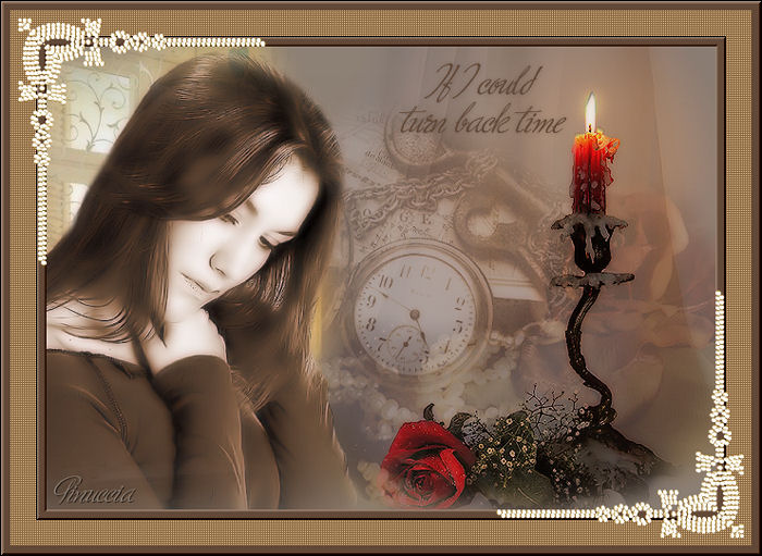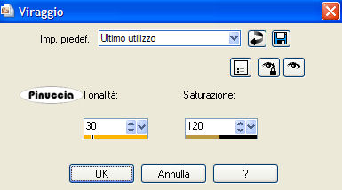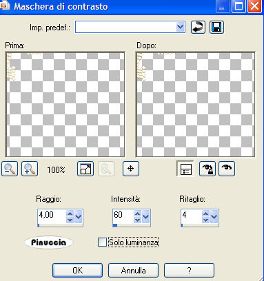 (tolleranza 0, antialias, interno).Effetti>Plugins>Bordermania - Frame #2: ![]() Selezione>Nessuna selezione. Apri il tube Pearls e vai a Modifica>Copia. Torna al tuo lavoro e vai a Modifica>Incolla>Incolla come nuovo livello. Immagine>Ridimensiona, all'80%. Regola>Saturazione e Tonalità>Viraggio: ![]() Regola>Messa a fuoco>Maschera di contrasto: ![]() Spostalo nell'angolo in alto a sinistra.Livelli>Duplica. Immagine>Rifletti. Immagine>Capovolgi. Livelli>Unisci>Unisci giù. Attiva lo strumento Testo , mobile.Chiudi il colore di primo piano, il colore di sfondo è già impostato correttamente. Scegli un font (io ho usato Ministry Script), per la dimensione dovrai regolarti, a seconda del testo e della versione di PSP che stai usando. Su questo argomento, vedi in fondo a questa pagina Scrivi If I could turn back time; oppure, in italiano, Se potessi tornare indietro, o quello che preferisci. Selezione>Innalza selezione a livello. Selezione>Nessuna selezione. Livelli>Duplica. Livelli>Unisci>Unisci giù. Effetti>Effetti 3D>Sfalsa ombra, con i seguenti settaggi, colore nero: ![]() Posiziona il testo come preferisci. Aggiungi, se vuoi, il tuo watermark con un nuovo livello. Livelli>Unisci>Unisci tutto. Salva in formato jpeg ottimizzato. ![]() ![]() Se hai problemi o dubbi, o trovi un link non funzionante, o anche soltanto per dirmi che ti è piaciuto, scrivimi