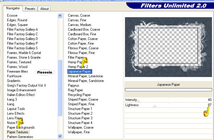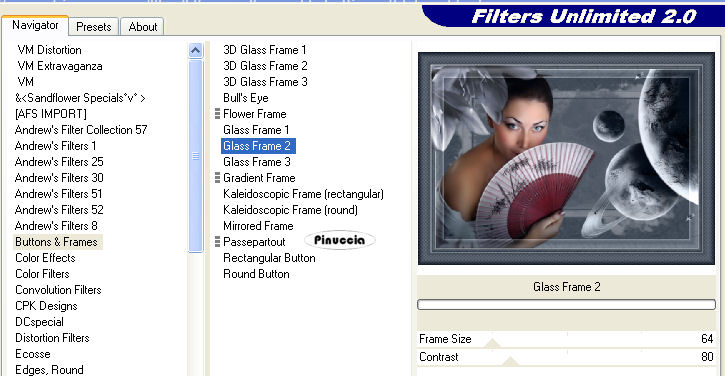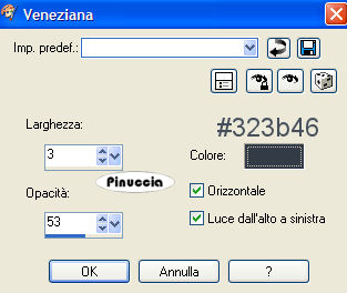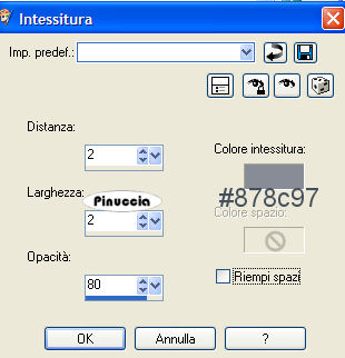 qui puoi trovare qualche risposta ai tuoi dubbi. Se l'argomento che ti interessa non è presente, ti prego di segnalarmelo. Questo tutorial è stato scritto in PSP 9, ma può essere eseguito con qualsiasi versione del programma. Occorrente: Materiale qui Se vuoi condividere i tubes, per favore rispetta il lavoro degli autori, e lascia intatto il livello del watermark. Metti la maschera nella cartella Maschere di PSP. Metti i pennelli nella cartella Pennelli di PSP. Se hai problemi con i pennelli, vedi alcuni appunti in questa pagina Filtro: Filters Unlimited 2.0 qui Xero qui Apri una nuova immagine trasparente 650 x 450 pixels. Imposta il colore di primo piano con #878c97, e il colore di sfondo con #444f5b. Riempi l'immagine trasparente con il colore di primo piano.Effetti>Effetti di trama>Veneziana: ![]() Livelli>Nuovo livello raster. Riempi il nuovo livello con il colore di sfondo.per riempire con il colore di sfondo, devi cliccare con il tasto destro del mouse. Livelli>Carica/salva maschera>Carica maschera da disco. Cerca e carica la maschera gh_grungeframe 3: ![]() Livelli>Unisci>Unisci gruppo. Effetti>Plugins>Filters Unlimited 2.0 - Paper Texture - Japanese Paper: ![]() Livelli>Nuovo livello raster. Attiva lo strumento Pennello ![]() cerca e seleziona il pennello hjr_haunted house 2, e applicalo al centro dell'immagine, cliccando con il tasto destro del mouse per usare il colore di sfondo. Attiva il tube F-M2007-31 e vai a Modifica>Copia. Torna al tuo lavoro e vai a Modifica>Incolla>Incolla come nuovo livello. Regola>Correzione fotografica>Rimozione disturbo fotocamera digitale. Sposta il tube a sinistra un po' in basso, vedi l'esempio.![]() Apri il tube SKF_Planets 215 e vai a Modifica>Copia. Torna al tuo lavoro e vai a Modifica>Incolla>Incolla come nuovo livello. Immagine>Capovolgi. Immagine>Rifletti. Immagine>Ridimensiona, all'80%, ricampionamento bicubica, tutti i livelli non selezionato. ![]() Sposta il tube in alto, a destra: deve uscire un po' dall'immagine, vedi l'esempio sotto.Cambia la modalità di miscelatura di questo livello in Luminanza (esistente). ![]() Livelli>Unisci>Unisci tutto. Effetti>Plugins>Xero - Porcelain: ![]() Selezione>Seleziona tutto. Selezione>Modifica>Contrai di 10 pixels. Selezione>Inverti. Livelli>Nuovo livello raster. Riempi con il colore di sfondo.Effetti>Effetti di bordo>Aumenta di più, due volte. Effetti>Plugins>Filters Unlimited 2.0 - Paper Texture - Japanese Paper, con i settaggi precedenti. Selezione>Nessuna selezione. Apri il tube mc3167 e vai a Modifica>Copia. Torna al tuo lavoro e vai a Modifica>Incolla>Incolla come nuovo livello. Regola>Saturazione e tonalità>Viraggio: ![]() Sposta il tube in alto a sinistra,in modo che rimanga visibile soltanto l'ultima parte dell'immagine: vedi l'esempio sotto. Abbassa l'opacità di questo livello al 90%. ![]() Livelli>Unisci>Unisci tutto. Immagine>Aggiungi bordatura, 1 pixel, simmetriche, con il colore bianco. Immagine>Aggiungi bordatura, 30 pixels, simmetriche, con il colore #444f5b. Seleziona il bordo con la bacchetta magica ![]() ![]() Effetti>Effetti di trama>Intessitura: ![]() Immagine>Ruota>ruota di 90 gradi in senso orario. Se stai usando PSP X: Immagine>Ruota a destra. Ripeti Effetti>Effetti di trama>Intessitura, con gli stessi settaggi. Immagine>Ruota>Ruota di 90 gradi in senso antiorario. Se stai usando PSP X: Immagine>Ruota a sinistra. Effetti>Plugins>Filters Unlimited 2.0 - Buttons & Frames - Glass Frame 2: ![]() Selezione>Nessuna selezione. Livelli>Nuovo livello raster. Imposta il colore di primo piano con #a6aab2. Attiva lo strumento pennello ![]() cerca e seleziona il pennello agi 11-U2-willfollow, dimensione 275 pixels, e applicalo in basso a sinistra, cliccando con il tasto sinistro del mouse, per usare il colore di primo piano. Effetti>Effetti 3D>Sfalsa ombra: ![]() Aggiungi, se vuoi, il tuo nome in un nuovo livello. Livelli>Unisci>Unisci tutto e salva in formato jpg. ![]() Le vostre versioni. Grazie ![]() ![]() Clovis ![]() Se hai problemi o dubbi, o trovi un link non funzionante, o anche soltanto per dirmi che ti è piaciuto, scrivimi Le mie traduzioni sono regolarmente registrate 29 Maggio 2007 |