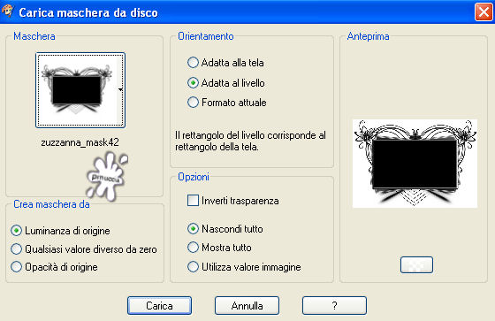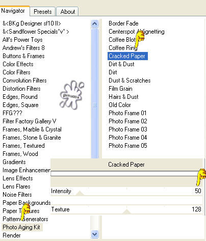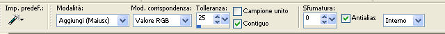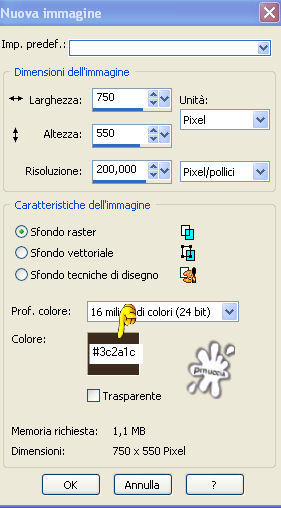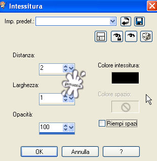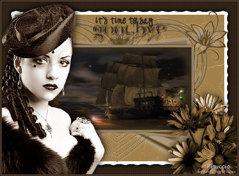 qui puoi trovare qualche risposta ai tuoi dubbi. Se l'argomento che ti interessa non è presente, ti prego di segnalarmelo. Questo tutorial è stato scritto e tradotto con PSP 9. Occorrente: Materiale qui I tubes usati per questo tutorial sono di Jet e Nightangel. Il pennello è di Agi, la maschera di Zuzanna. Se vuoi condividere i tubes, per favore rispetta il lavoro degli autori, e lascia intatto il livello del watermark. (in questa pagina trovi i links ai siti dei creatori di tubes) Filtri: Mura's Meister - Cloud qui Filters Unlimited qui Photo Aging Kit qui Photo Aging Kit si usa importandolo in Filters Unlimited. Come fare vedi qui Imposta il colore di primo piano con #5a4018, e il colore di sfondo con #a17f49. Riempi l'immagine trasparente con il colore di primo piano.Livelli>Nuovo livello raster. Riempi con il colore di sfondo.Livelli>Carica/Salva maschera>Carica maschera da disco. Cerca e carica la maschera zuzzanna_mask42: ![]() Livelli>Unisci>Unisci gruppo. Effetti>Plugins>Filters Unlimited - Photo Aging Kit - Cracked Paper: ![]() Imposta il colore di primo piano con #292218, e il colore di sfondo con #403624. Attiva lo strumento Selezione , rettangolo:![]() e seleziona il riquadro centrale: ![]() Effetti>Plugins>Mura's Meister - Cloud: ![]() Livelli>Nuovo livello raster. Apri il tube BeautifulShip e vai a Modifica>Copia. Torna al tuo lavoro e vai a Modifica>Incolla>Incolla nella selezione. Selezione>Nessuna selezione. Immagine>Ridimensiona, al 105%, tutti i livelli non selezionato. ![]() Attiva il livello sottostante (gruppo maschera). Effetti>Plugins>Filters Unlimited - Photo Aging Kit - Photo Frame 02. Livelli>Unisci>Unisci visibile. Attiva lo strumento bacchetta magica con i seguenti settaggi:![]() e clicca sul bordo nero per selezionarlo. ![]() Selezione>Modifica>Espandi - 1 pixel. Premi sulla tastiera il tasto CANC ![]() Selezione>Nessuna selezione. Metti da parte l'immagine per il momento. Apri una nuova immagine trasparente 750 x 550 pixels, con il colore #3c2a1c. ![]() Effetti>Effetti di trama>Intessitura: ![]() Attiva l'immagine che hai messo da parte prima e vai a Modifica>Copia. Torna al tuo lavoro e vai a Modifica>Incolla>Incolla come nuovo livello. ![]() Effetti>Effetti 3D>Sfalsa ombra: ![]() Ripeti l'Effetto Sfalsa ombra cambiando verticale e orizzontale con -3. Apri il tube jet-woman26nov e vai a Modifica>Copia. Torna al tuo lavoro e vai a Modifica>Incolla>Incolla come nuovo livello. Immagine>Rifletti. Immagine>Ridimensiona, all'85%, tutti i livelli non selezionato. Regola>Messa a fuoco>Maschera di contrasto: ![]() Sposta il tube a sinistra contro il bordo e un po' più in basso.Effetti>Effetti 3D>sfalsa ombra: ![]() Apri il tube Blue_and_White e vai a Modifica>copia. Torna al tuo lavoro e vai a Modifica>Incolla>Incolla come nuovo livello. Immagine>Ridimensiona, al 75%, tutti i livelli non selezionato. Regola>Tonalità e Saturazione>Viraggio: ![]() Regola>Luminosità e contrasto>Luminosità e contrasto: ![]() Effetti>Effetti 3D>Sfalsa ombra: ![]() Sposta il tube in basso a destra.Immagine>Aggiungi bordatura, 1 pixel, simmetriche, con il colore nero. Immagine>Aggiungi bordatura, 4 pixels, simmetriche, con il colore #5a4530. Immagine>Aggiungi bordatura, 1 pixel, simmetriche, con il colore nero. Imposta il colore di primo piano con #211913. Livelli>Nuovo livello raster. Attiva lo strumento Pennello ![]() cerca e seleziona il pennello agiBrush38_wb-saygoodbye (dimensione 250), e applicalo cliccando due volte con il tasto sinistro del mouse per usare il colore di primo piano. Posiziona il pennello come nel mio esempio.Aggiungi il tuo nome e/o il tuo watermark su un nuovo livello. Livelli>Unisci>Unisci tutto e salva in formato jpg. ![]() Se hai problemi o dubbi, o trovi un link non funzionante, o anche soltanto per dirmi che ti è piaciuto, scrivimi