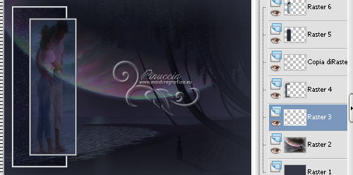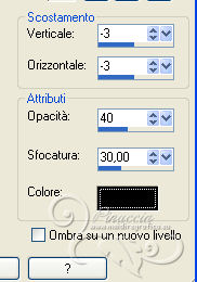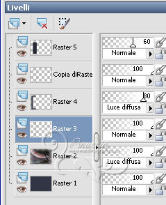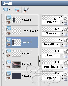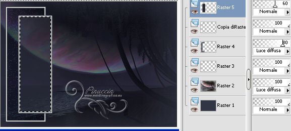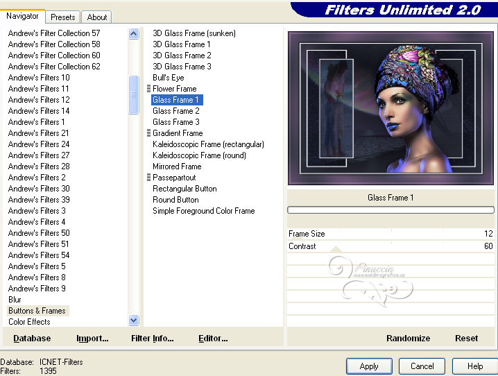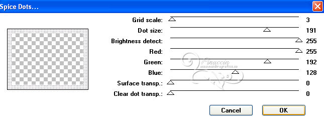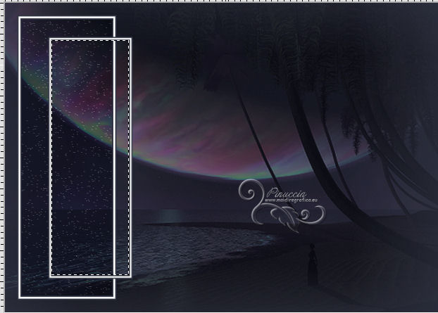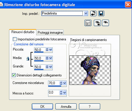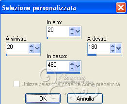 qui puoi trovare qualche risposta ai tuoi dubbi. Se l'argomento che ti interessa non è presente, ti prego di segnalarmelo. Questo tutorial è stato scritto con PSP 9, ma può essere eseguito anche con le altre versioni di PSP, a volte con qualche aggiustamento. Per chi usa X4 e X5 vedi la scheda sulla funzione Rifletti/Capovolgi qui Per tradurre il tutorial, ho usato PSP X. Occorrente: Materiale qui I tubes sono di Kitty, Suzi e Marcio. (in questa pagina trovi i links ai loro siti). Se vuoi condividere i tubes, per favore rispetta il lavoro degli autori, e lascia intatto il livello del watermark. Filtri se hai problemi con i Filtri consulta la mia sezione Filtri qui Filters Unlimited 2.0 qui Unplugged Tools qui I filtri Unplugged si possono usare da soli o importati in Filters Unlimited. (come fare vedi qui) Se un filtro fornito appare con questa icona ![]() Imposta il colore di primo piano con #333645, e il colore di sfondo con #ffffff. Apri una nuova immagine trasparente 700 x 500 pixels, e riempila con il colore di primo piano.Apri il tube mc2770 e vai a Modifica>Copia. Torna al tuo lavoro e vai a Modifica>Incolla come nuovo livello. Immagine>Ridimensiona, al 135%, tutti i livelli non selezionato. ![]() Cambia la modalità di miscelatura di questo livello in Luce diffusa. Livelli>Nuovo livello raster. Attiva lo strumento Selezione ,clicca sull'icona Selezione personalizzata ![]() e imposta i seguenti settaggi: ![]() Riempi la selezione con il colore di primo piano.Selezione>Modifica>Contrai - 2 pixels. Riempi con il colore di sfondo.Selezione>Modifica>Contrai - 3 pixels. Riempi con il colore di primo piano.Selezione>Modifica>Contrai - 2 pixels. Premi sulla tastiera il tasto CANC ![]() Mantieni selezionato. Livelli>Nuovo livello raster. Riempi con il colore di primo piano.Effetti>Effetti di trama>Nappa. ![]() Selezione>Deseleziona. Cambia la modalità di miscelatura di questo livello in Luce diffusa, e abbassa l'opacità all'80%. Attiva il livello sottostante. Livelli>Duplica. Immagine>Ridimensiona, all'85%, tutti i livelli non selezionato. Livelli>Disponi>Porta in alto. Attiva lo strumento Bacchetta magica ![]() ![]() Clicca nel riquadro per selezionarlo. ![]() Livelli>Nuovo livello raster. Riempi con il colore di primo piano.Effetti>Effetti di trama>Veneziana. ![]() Abbassa l'opacità di questo livello al 60%. Mantieni ancora selezionato. attiva il livello Raster 4 (il livello con l'Effetto Nappa). ![]() Premi sulla tastiera il tasto CANC ![]() Attiva il livello Raster 3 (il bordo) ![]() Premi sulla tastiera il tasto CANC. Mantieni sempre selezionato e attiva il livello superiore. ![]() Livelli>Nuovo livello raster. Apri il tube SS_1806. Immagine>Rifletti. Attiva lo strumento Selezione , rettangolo,e traccia una selezione intorno al tube, come nell'esempio. ![]() Modifica>Copia. Torna al tuo lavoro e vai a Modifica>Incolla nella selezione. Selezione>Deseleziona. Cambia la modalità di miscelatura di questo livello in Sovrapponi, e abbassa l'opacità al 66%. Attiva il livello Raster 3 (il livello del primo bordo). ![]() Livelli>Duplica. Immagine>Rifletti. Attiva il livello Raster 4 (effetto nappa). ![]() Livelli>Duplica. Immagine>Rifletti. Attiva il livello copia di Raster 3 (il bordo piccolo). Livelli>Duplica. Immagine>Rifletti. Attiva il livello Raster 5 (Effetto Veneziana). Livelli>Duplica. Immagine>Rifletti. Attiva il livello superiore. Apri il tube Kitty.S-Summerfasion e vai a Modifica>Copia. Torna al tuo lavoro e vai a Modifica>Incolla come nuovo livello. Immagine>Rifletti. Immagine>Ridimensiona, al 76%, tutti i livelli non selezionato. Regola>Rimozione disturbo fotocamera digitale. ![]() Regola>Messa a fuoco>Maschera di contrasto. ![]() Sposta il tube a destra e un po' più in basso.(Vedi il mio esempio). Effetti>Effetti 3D>Sfalsa ombra. ![]() Immagine>Aggiungi bordatura, 2 pixels, simmetriche, con il colore #333645. Immagine>Aggiungi bordatura, 3 pixels, simmetriche, con il colore #ffffff. Immagine>Aggiungi bordatura, 45 pixels, simmetriche, con il colore #333645. Attiva lo strumento Bacchetta magica ![]() ![]() Clicca nel bordo da 45 pixels per selezionarlo. Imposta il colore di sfondo con #7d6084. Passa il colore di primo piano a Gradiente, stile Sprazzo di luce. ![]() Riempi la selezione con il gradiente.Regola>Sfocatura>Sfocatura gaussiana - raggio 20. ![]() Livelli>Nuovo livello raster. Riempi nuovamente con il gradiente.Regola>Sfocatura>Sfocatura gaussiana - raggio 20, con i settaggi precedenti. Effetti>Plugins>Unplugged Tools - Spice Dots. ![]() Cambia la modalità di miscelatura di questo livello in Moltiplica. Selezione>Inverti. Effetti>Effetti 3D>Sfalsa ombra. ![]() Ripeti l'Effetto Sfalsa ombra, cambiando verticale e orizzontale con -3. Selezione>Deseleziona. Livelli>Unisci>Unisci tutto. Effetti>Plugins>Filters Unlimited 2.0 - Buttons & Frames, Glass Frame 1. ![]() Aggiungi il tuo nome e/o il tuo watermark su un nuovo livello. Livelli>Unisci>Unisci tutto e salva in formato jpg. ![]() Se hai problemi o dubbi, o trovi un link non funzionante, o anche soltanto per dirmi che ti è piaciuto, scrivimi 20 Giugno 2013 |