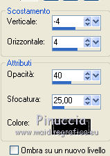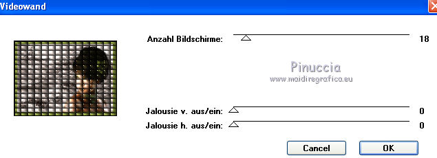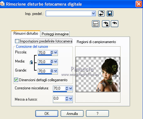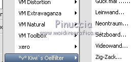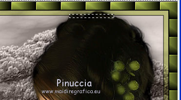 qui puoi trovare qualche risposta ai tuoi dubbi. Se l'argomento che ti interessa non è presente, ti prego di segnalarmelo. Questo tutorial è stato scritto con PSP 9. Per tradurlo, ho usato PSP X. Occorrente: Materiale qui I tubes usati per questo tutorial sono di Kitty, Farouche, Marif e Patries. Se vuoi condividere i tubes, per favore rispetta il lavoro degli autori, e lascia intatto il livello del watermark. Filtri FM Tile Tools qui Kiwi Oelfilters qui ![]() Apri una nuova immagine trasparente 700 x 500 pixels. Imposta il colore di primo piano con #dbd0cb, e il colore di sfondo con #616b2b. Riempi l'immagine trasparente con il colore di primo piano.Apri il tube Scenery Cristal e vai a Modifica>Copia. Torna al tuo lavoro e vai a Modifica>Incolla come nuovo livello. Immagine>Ridimensiona, al 120%, tutti i livelli non selezionato. ![]() Sposta il tube in alto a sinistra.![]() Cambia la modalità di miscelatura di questo livello in Luminanza (Esistente), e abbassa l'opacità al 90%. Livelli>Duplica, e riporta l'opacità di questo livello a 100. Immagine>Rifletti. Posiziona il tube come nell'esempio.![]() Su entrambi i livelli: Effetti>Plugins>FM Tile Tools - Blend Emboss, con i settaggi standard. ![]() Apri il tube 1Patries bonzai e vai a Modifica>Copia. Torna al tuo lavoro e vai a Modifica>Incolla come nuovo livello. Immagine>Ridimensiona, al 110%, tutti i livelli non selezionato. Effetti>Plugins>FM Tile Tools - Blend Emboss, con i settaggi precedenti. Sposta il tube in alto a destra.Cambia la modalità di miscelatura di questo livello in Luminanza (esistente), e abbassa l'opacità al 90%. Attiva lo strumento Gomma e cancella la base dell'albero. ![]() Apri il tube Marif_misted_fleurs e vai a Modifica>Copia. Torna al tuo lavoro e vai a Modifica>Incolla come nuovo livello. Immagine>Ridimensiona, al 90%, tutti i livelli non selezionato. Immagine>Rifletti. Sposta il tube in basso a sinistra.Cambia la modalità di miscelatura di questo livello in Luminanza (Esistente). Effetti>Plugins>FM Tile Tools - Blend Emboss, con i settaggi standard. Apri il tube Kitty-Dewie e vai a Modifica>Copia. Torna al tuo lavoro e vai a Modifica>Incolla come nuovo livello. Immagine>Ridimensiona, all'85%, tutti i livelli non selezionato. Regola>Rimozione disturbo fotocamera digitale - 2 volte. ![]() Regola>Messa a fuoco>Maschera di contrasto. ![]() Sposta il tube in basso a destra.Effetti>Effetti 3D>Sfalsa ombra. ![]() Immagine>Aggiungi bordatura, 20 pixels, simmetriche, con il colore 616b2b. Seleziona questo bordo con la bacchetta magica ![]() ![]() Effetti>Plugins>Kiwi's Oelfilter - Videowand. attenzione, a causa della denominazione del filtro, lo troverai in fondo alla lista. ![]() ![]() Effetti>Effetti di bordo>Aumenta. Imposta il colore di primo piano con #000000. Selezione>Seleziona tutto. Selezione>Modifica>Contrai - 18 pixels. Livelli>Nuovo livello raster. Riempi con il colore nero di primo piano.Selezione>Modifica>Contrai - 2 pixels. Premi sulla tastiera il tasto CANC. Livelli>Nuovo livello raster. Riempi con il colore di sfondo.Selezione>Modifica>Contrai - 10 pixels. Premi sulla tastiera il tasto CANC. Cambia la modalità di miscelatura di questo livello in Luce netta, e abbassa l'opacità al 60%. Livelli>Nuovo livello raster. Riempi con il colore di primo piano.Selezione>Modifica>Contrai - 1 pixel. Premi sulla tastiera il tasto CANC. Selezione>Deseleziona. Attiva lo strumento Gomma e cancella la parte del bordo che copre il tube della donna.![]() Immagine>Aggiungi bordatura 1 pixel, simmetriche, con il colore nero. Aggiungi il tuo nome e/o il tuo watermark su un nuovo livello. Livelli>Unisci>Unisci tutto e salva in formato jpg. ![]() Se hai problemi o dubbi, o trovi un link non funzionante, o anche soltanto per dirmi che ti è piaciuto, scrivimi 18 Gennaio 2012 |