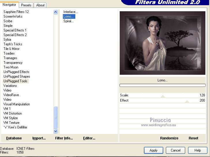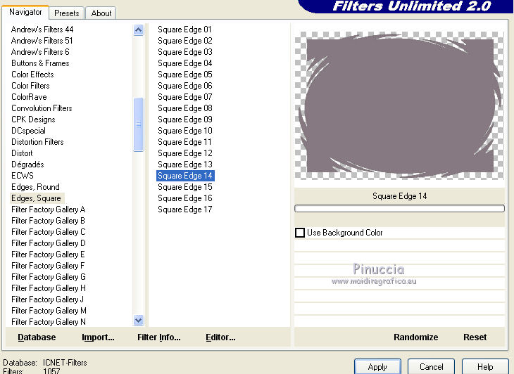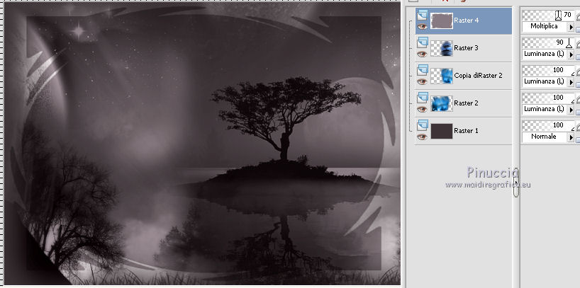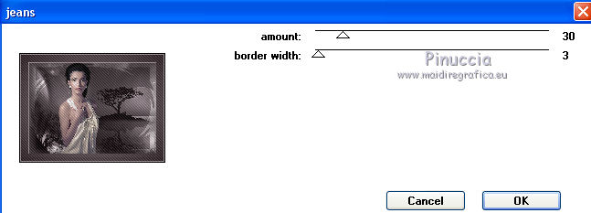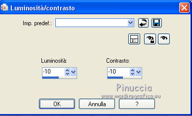 qui puoi trovare qualche risposta ai tuoi dubbi. Se l'argomento che ti interessa non è presente, ti prego di segnalarmelo. Questo tutorial è stato scritto con PSP 9. Dalla versione X4, il comando Immagine>Rifletti è stato sostituito con Immagine>Capovolgi in orizzontale, e il comando Immagine>Capovolgi con Immagine>Capovolgi in verticale. Nelle versioni X5 e X6, le funzioni sono state migliorate rendendo disponibile il menu Oggetti. Vedi la scheda sull'argomento qui Per tradurre questo tutorial ho usato PSP X. Occorrente: Materiale qui Per i tubes grazie Jet, Syl e Nikita. (in questa pagina trovi i links ai loro siti). Se vuoi condividere i tubes, per favore rispetta il lavoro degli autori, e lascia intatto il livello del watermark. Filtri: in caso di dubbi, ricorda di consultare la mia sezione filtri qui Filters Unlimited 2.0 qui Unplugged Tools qui Penta.com - Jeans qui I filtri Unplugged Tools e Penta si possono usare da soli o importati in Filters Unlimited (come fare vedi qui) Se un filtro fornito appare con questa icona ![]() Apri la maschera in PSP e minimizzala con il resto del materiale. 1. Imposta il colore di primo piano con #3e3538, e il colore di sfondo con #877981. Apri una nuova immagine trasparente 700 x 500 pixels, e riempila con il colore di primo piano.2. Apri il tube 1293039994_paysages_nikita, e vai a Modifica>Copia. Torna al tuo lavoro e vai a Modifica>Incolla come nuovo livello. Immagine>Rifletti. Sposta il tube a sinistra (vedi il mio esempio).Cambia la modalità di miscelatura di questo livello in Luminanza (esistente). 3. Livelli>Duplica. Immagine>Rifletti. Sposta il duplicato a destra.4. Apri il tube SvB Zee2 misted, e vai a Modifica>Copia. Torna al tuo lavoro e vai a Modifica>Incolla come nuovo livello. Sposta il tube a destra e un po' più in basso.Cambia la modalità di miscelatura di questo livello in Luminanza (esistente), e abbassa l'opacità al 90%. ![]() 5. Livelli>Nuovo livello raster. Riempi con il colore di sfondo.6. Effetti>Plugins>Filters Unlimited - Square Edges - Edge square 14. ![]() Cambia la modalità di miscelatura di questo livello in Moltiplica, e abbassa l'opacità al 70%. ![]() 7. Apri il tube jet-woman 6, e vai a Modifica>Copia. Torna al tuo lavoro e vai a Modifica>Incolla come nuovo livello. 8. Regola>Luminosità e contrasto>Luminosità e contrasto. ![]() 9. Regola>Messa a fuoco>Maschera di contrasto. ![]() 10. Sposta il tube a sinistra e un po' più in basso.![]() 11. Immagine>Aggiungi bordatura, 1 pixel, simmetriche, colore #8f8188. Immagine>Aggiungi bordatura, 40 pixels, simmetriche, colore #4c4044. Immagine>Aggiungi bordatura, 5 pixels, simmetriche, colore #8f8188. 12. Attiva lo strumento Bacchetta magica ![]() ![]() Clicca nel bordo da 40 pixels per selezionarlo. 13. Effetti>Plugins>Filters Unlimited 2.0 - Unplugged Tools - Lomo. ![]() Effetti>Effetti di bordo>Aumenta di più. Selezione>Deseleziona. 14. Seleziona il bordo da 5 pixels con la bacchetta magica ![]() Effetti>Plugins>Penta.com - Jeans. ![]() Effetti>Effetti di bordo>Aumenta. Selezione>Deseleziona. 15. Firma il tuo lavoro su un nuovo livello. Livelli>Unisci>Unisci tutto e salva in formato jpg. ![]() Se hai problemi o dubbi, o trovi un link non funzionante, o anche soltanto per dirmi che ti è piaciuto, scrivimi 25 Maggio 2014 |
