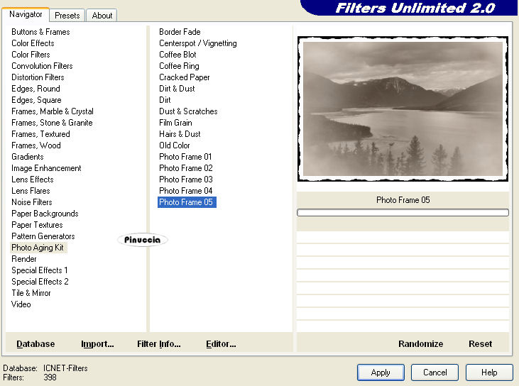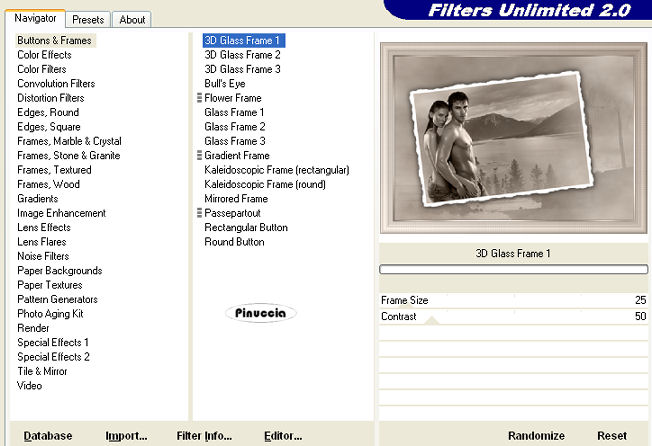 qui puoi trovare qualche risposta ai tuoi dubbi. Se l'argomento che ti interessa non è presente, ti prego di segnalarmelo. Questo tutorial è stato scritto in PSP 9, ma può essere eseguito con qualsiasi versione del programma. Occorrente: Materiale qui I tubes usati per questo tutorial sono di Angie, Suzi, e Jet Se vuoi condividere i tubes, per favore rispetta il lavoro degli autori, e lascia intatto il livello del watermark. (in questa pagina trovi i links ai siti dei creatori di tubes) Filtri: Mura's Meister qui Graphics Plus qui Xero qui Filters Unlimited qui Photo Aging Kit qui Photo Aging Kit si usa importato in Filters Unlimited. Come fare vedi qui Apri una nuova immagine trasparente 650 x 450 pixels. Imposta il colore di primo piano con #e0d6cc, e il colore di sfondo con #aa9b8e. Effetti>Plugins>Mura's Meister - Cloud ![]() Apri il tube PAY-Jll2007-25, e vai a Modifica>Copia. Torna al tuo lavoro e vai a Modifica>Incolla>Incolla come nuovo livello. Immagine>Ridimensiona, al 135%, tutti i livelli non selezionato. ![]() Adesso l'immagine coprirà tutta l'area di lavoro. Cambia la modalità di miscelatura di questo livello in Luminanza (esistente), e abbassa l'opacità al 74%. ![]() Livelli>Unisci>Unisci visibile. Effetti>Plugins>Filters Unlimited - Photo Aging Kit - Photo Frame 5. ![]() Seleziona il bordo nero con la bacchetta magica ![]() ![]() Selezione>Modifica>Espandi, di 1 pixel. Premi sulla tastiera il tasto canc ![]() Selezione>Nessuna selezione. Apri il tube CPL-S2007-10, e vai a Modifica>Copia. Torna al tuo lavoro e vai a Modifica>Incolla>Incolla come nuovo livello. Immagine>Ridimensiona, all'80%, tutti i livelli non selezionato. ![]() Sposta il tube in basso a sinistra, contro il bordo, vedi il mio esempio.Cambia la modalità di miscelatura di questo livello in Luminanza (Esistente). Livelli>Unisci>Unisci visibile. Immagine>Ridimensiona, al 75%, tutti i livelli selezionato. ![]() Metti da parte l'immagine per il momento. Apri una nuova immagine trasparente 670 x 460 pixels. Effetti>Plugins>Mura's Meister: Cloud. Apri il tube SS_283, e vai a Modifica>Copia. Torna al tuo lavoro e vai a Modifica>Incolla>Incolla come nuovo livello. Immagine>Ridimensiona, al 135%, tutti i livelli non selezionato. Cambia la modalità di miscelatura di questo livello in Luminanza (esistente), e abbassa l'opacità al 30%. Attiva l'immagine che hai messo da parte prima e vai a Modifica>Copia. Ritorna al nuovo lavoro (670x460) e vai a Modifica>Incolla>Incolla come nuovo livello. ![]() Immagine>Ruota>Ruota per gradi, 7 gradi a sinistra: ![]() Regola>Messa a fuoco>Maschera di contrasto. ![]() Effetti>effetti 3D>Sfalsa ombra: ![]() Ripeti l'Effetto Sfalsa ombra, ma cambiando verticale e orizzontale a -2. Sposta l'immagine a sinistra.![]() Apri il tube jet-woman 16-juni-2007, e vai a Modifica>Copia. Torna al tuo lavoro e vai a Modifica>Incolla>Incolla come nuovo livello. Immagine>Ridimensiona, al 90%, tutti i livelli non selezionato. Regola>Messa a fuoco>Maschera di contrasto, con i settaggi precedenti. Sposta il tube in basso a destra.Immagine>Aggiungi bordatura, 1 pixel, simmetriche, con il colore #837162. Immagine>Aggiungi bordatura, 3 pixels, simmetriche, con il colore bianco. Seleziona il bordo bianco con la bacchetta magica ,attenzione, riporta la sfumatura a 0. ![]() Riempi la selezione con il colore di primo piano.Effetti>Plugins>Graphics Plus - Cross Shadow: ![]() Selezione>Nessuna selezione. Immagine>Aggiungi bordatura, 1 pixel, simmetriche, con il colore #837162. Passa il colore di primo piano a Gradiente di primo piano/sfondo: ![]() Immagine>Aggiungi bordatura, 35 pixels, simmetriche, con il colore bianco. Seleziona il bordo con la bacchetta magica ![]() ![]() Riempi la selezione con il gradiente.Effetti>Plugins>Xero - Fritillary, con i settaggi standard. ![]() Effetti>Plugins>Filters Unlimited - Buttons & Frames: ![]() Selezione>Nessuna selezione. Apri il file con il testo "Love is..." e vai a Modifica>Copia. Torna al tuo lavoro e vai a Modifica>Incolla>Incolla come nuovo livello. Posiziona il testo come nel mio esempio, o dove preferisci.Se vuoi, in un nuovo livello, aggiungi il tuo nome e/o il tuo watermark. Livelli>Unisci>Unisci tutto e salva in formato jpg. ![]() Se hai problemi o dubbi, o trovi un link non funzionante, o anche soltanto per dirmi che ti è piaciuto, scrivimi