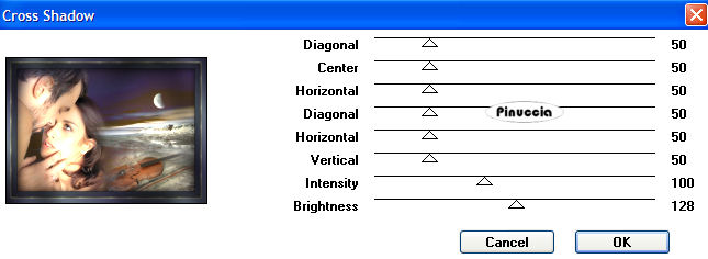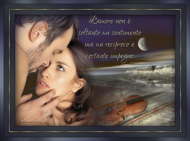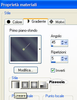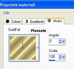 qui puoi trovare qualche risposta ai tuoi dubbi. Se l'argomento che ti interessa non è presente, ti prego di segnalarmelo. Questo tutorial è stato scritto in PSP 9, ma può essere eseguito con qualsiasi versione del programma. Occorrente: Materiale qui Se vuoi condividere i tubes, per favore rispetta il lavoro degli autori, e lascia intatto il livello del watermark. Filtri: Graphics Plus qui Xero qui Cybia qui Apri una nuova immagine trasparente 650 x 450 pixels. Imposta il colore di primo piano con #bb8823, e il colore di sfondo con #3a3852. Riempi l'immagine con il colore di primo piano.Livelli>Nuovo livello raster. Selezione>Seleziona tutto. Apri il tube Moonlight e vai a Modifica>Copia. Torna al tuo lavoro e vai a Modifica>Incolla>Incolla nella selezione. Abbassa l'opacità di questo livello al 70%. Selezione>Deseleziona. Apri il tube hjr_misted_violin e vai a Modifica>Copia. Torna al tuo lavoro e vai a Modifica>Incolla>Incolla come nuovo livello. Immagine>Ridimensiona, al 75%, ricampionamento bicubica, tutti i livelli non selezionato. ![]() Ripeti ancora una volta Immagine>Ridimensiona, al 75%, tutti i livelli non selezionato. Sposta l'immagine in basso a destra.Abbassa l'opacità di questo livello al 90%. ![]() Apri il tube mc2336 e vai a Modifica>Copia. Torna al tuo lavoro e vai a Modifica>Incolla>Incolla come nuovo livello. Immagine>Ridimensiona, al 90%, bicubica, tutti i livelli non selezionato. Regola>Correzione fotografica>Rimozione disturbo fotocamera digitale. Sposta il tube a sinistra, un po' più in basso, vedi il mio esempio.Livelli>Unisci>Unisci tutto. Effetti>Plugins>Xero - Porcelain. ![]() Selezione>Seleziona tutto. Effetti>Effetti 3D>Ritaglio: ![]() Selezione>Nessuna selezione. Imposta il colore di primo piano su #545e68, e passa il colore di primo piano a Gradiente di primo piano/sfondo, con i seguenti settaggi: ![]() Immagine>Aggiungi bordatura, 1 pixel, simmetriche, con il colore nero. Immagine>Aggiungi bordatura, 20 pixels, simmetriche, con il colore bianco. Seleziona il bordo con la bacchetta magica ![]() ![]() Riempi la selezione con il gradiente.Effetti>Plugins>Cybia - Screenworks - Light Gauze. ![]() Selezione>Nessuna selezione. Immagine>Aggiungi bordatura, 1 pixel, simmetriche, con il colore nero. Apri il Motivo oro che hai trovato con il materiale e minimizzalo nella tua area di lavoro. Imposta il colore di primo piano su Motivi, e seleziona il motivo con i seguenti settaggi: ![]() Immagine>Aggiungi bordatura, 2 pixels, simmetriche, con il colore bianco. Seleziona il bordo con la bacchetta magica ![]() Riempi la selezione con il motivo oro.Riporta nuovamente il colore di primo piano sul Gradiente. Immagine>Aggiungi bordatura, 1 pixel, simmetriche, con il colore nero. Immagine>Aggiungi bordatura, 20 pixels, simmetriche, con il colore bianco. Seleziona il bordo con la bacchetta magica ,