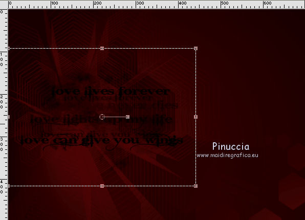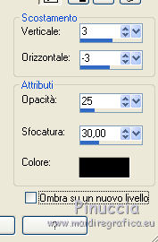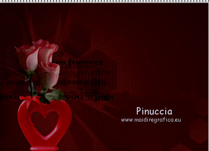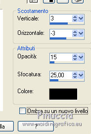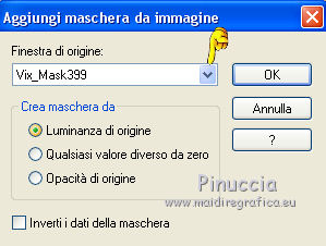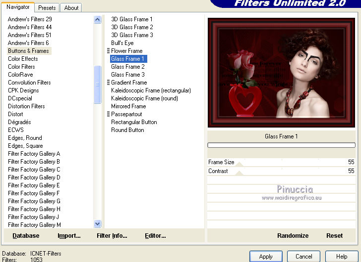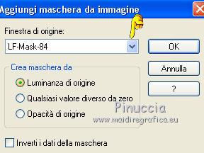qui puoi trovare qualche risposta ai tuoi dubbi. Se l'argomento che ti interessa non è presente, ti prego di segnalarmelo. Questo tutorial è stato scritto con PSP 9. Dalla versione X4, il comando Immagine>Rifletti è stato sostituito con Immagine>Capovolgi in orizzontale, e il comando Immagine>Capovolgi con Immagine>Capovolgi in verticale. Nelle versioni X5 e X6, le funzioni sono state migliorate rendendo disponibile il menu Oggetti. Vedi la scheda sull'argomento qui Per tradurre questo tutorial ho usato PSP X. Occorrente: Materiale qui Per i tubes grazie Kitty e Jeanne. Per le maschere grazie Linda e Vix. (in questa pagina trovi i links ai loro siti). Se vuoi condividere i tubes, per favore rispetta il lavoro degli autori, e lascia intatto il livello del watermark. Filtri: in caso di dubbi, ricorda di consultare la mia sezione filtri qui Filters Unlimited 2.0 qui ![]() Apri le maschere in PSP e minimizzale con il resto del materiale. 1. Imposta il colore di primo piano con #0f0000, e il colore di sfondo con #520606. Apri una nuova immagine trasparente 700 x 500 pixels, e riempila con il colore di primo piano.2. Livelli>Nuovo livello raster. Riempi con il colore di sfondo.3. Livelli>Nuovo livello maschera>Da immagine. Apri il menu sotto la finestra di origine e vedrai la lista dei files aperti. Seleziona la maschera LF-Mask-84, con i seguenti settaggi. ![]() Livelli>Unisci>Unisci gruppo. 4. Imposta il colore di primo piano con il colore nero #000000. Livelli>Nuovo livello raster. Riempi con il colore nero di primo piano.5. Livelli>Nuovo livello maschera>Da immagine. Apri il menu sotto la finestra di origine e vedrai la lista dei files aperti. Seleziona la maschera Vix_Mask399, con i seguenti settaggi. ![]() Livelli>Unisci>Unisci gruppo. 6. Immagine>Ridimensiona, al 65%, tutti i livelli non selezionato. ![]() Sposta la maschera a sinistra.![]() 7. Apri il tube Hart_Rozen e vai a Modifica>Copia. Torna al tuo lavoro e vai a Modifica>Incolla come nuovo livello. Immagine>Ridimensiona, al 70%, tutti i livelli non selezionato. 8. Regola>Luminosità e contrasto>Luminosità e contrasto. ![]() Sposta il tube in basso a sinistra.![]() 9. Effetti>Effetti 3D>Sfalsa ombra. ![]() 10. Apri il tube kittys-Kristina e vai a Modifica>Copia. Torna al tuo lavoro e vai a Modifica>Incolla come nuovo livello. Immagine>Ridimensiona, all'80%, tutti i livelli non selezionato. 11. Regola>Messa a fuoco>Maschera di contrasto, con i settaggi precedenti. ![]() Sposta il tube a destra e un po' più in basso.12. Effetti>Effetti 3D>Sfalsa ombra. ![]() 13. Immagine>Aggiungi bordatura, 2 pixels, simmetriche, con il colore #000000. Immagine>Aggiungi bordatura, 25 pixels, simmetriche, colore #5a0e0e. Immagine>Aggiungi bordatura, 2 pixels, simmetriche, con il colore #000000. Immagine>Aggiungi bordatura, 15 pixels, simmetriche, colore #5a0e0e. Immagine>Aggiungi bordatura, 2 pixels, simmetriche, con il colore #000000. 14. Attiva lo strumento Bacchetta magica ![]() ![]() Clicca nei bordi da 25 e 15 pixels per selezionarlio. 15. Effetti>Effetti di trama>Intessitura. ![]() Selezione>Deseleziona. 16. Effetti>Plugins>Filters Unlimited 2.0 - Buttons & Frames - Glass Frame 1. ![]() 17. Firma il tuo lavoro su un nuovo livello. Livelli>Unisci>Unisci tutto e salva in formato jpg. ![]() Se hai problemi o dubbi, o trovi un link non funzionante, o anche soltanto per dirmi che ti è piaciuto, scrivimi 16 Maggio 2014 |