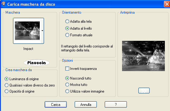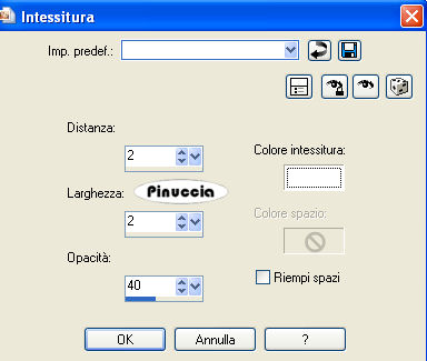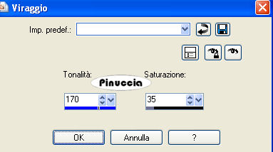 qui puoi trovare qualche risposta ai tuoi dubbi. Se l'argomento che ti interessa non è presente, ti prego di segnalarmelo. Questo tutorial è stato scritto in PSP 9, ma può essere eseguito con qualsiasi versione del programma. Occorrente: Materiale qui I tubes usati per questo tutorial sono di Marcio e Angie. Il materiale scrap è di Scrappy Expressions Se vuoi condividere i tubes, per favore rispetta il lavoro degli autori, e lascia intatto il livello del watermark. (in questa pagina trovi i links ai siti dei creatori di tubes) Non conosco l'autore della maschera. Se lo conoscete, per favore, mandatemi una mail e potrò dargli il giusto credito. Filtro: Bordermania qui Apri una nuova immagine trasparente 700 x 500 pixels. Imposta il colore di primo piano con #3c4c61, e il colore di sfondo con #e6e7ee. Riempi l'immagine trasparente con il colore di primo piano.Livelli>Nuovo livello raster. Riempi questo livello con il colore di sfondo.ricorda che, per riempire con il colore di sfondo, devi cliccare con il tasto destro del mouse. Livelli>Carica/Salva maschera>Carica maschera da disco. Cerca e carica la maschera Impact: ![]() Livelli>Unisci>Unisci gruppo. Immagine>Rifletti. Apri il tube ANI-M2007-01, e vai a Modifica>Copia. Torna al tuo lavoro e vai a Modifica>Incolla>Incolla come nuovo livello. Livelli>Carica/Salva maschera>Carica maschera da disco. Cerca e carica la maschera 20-20: ![]() Livelli>Unisci>Unisci gruppo. Sposta il tube in basso a destra.Cambia la modalità di miscelatura di questo livello in Luminanza (esistente). ![]() Apri il tube "Tekst Lovely_Cirkel_AdrianaDesigns", e vai a Modifica>Copia. Torna al tuo lavoro e vai a Modifica>Incolla>Incolla come nuovo livello. Spostalo a sinistra.Apri il tube mc 3217, e vai a Modifica>Copia. Torna al tuo lavoro e vai a Modifica>Incolla>Incolla come nuovo livello. Immagine>Ridimensiona, al 90%, tutti i livelli non selezionato. ![]() Regola>Correzione fotografica>Rimozione disturbo fotocamera digitale. se stai usando PSP X: Regola>Rimozione disturbo fotocamera digitale. ![]() Livelli>Disponi>Sposta giù. Posiziona il tube nel cerchio.Attiva lo strumento Gomma ![]() e cancella le tracce del tube all'esterno del cerchio. ![]() Attiva il livello superiore. Livelli>Unisci>Unisci giù. Effetti>Effetti 3D>Sfalsa ombra, con i seguenti settaggi. ![]() Ripeti l'Effetto Sfalsa ombra, ma cambiando verticale e orizzontale a -3. Apri LJD_SolarEL20, e vai a Modifica>Copia. Torna al tuo lavoro e vai a Modifica>Incolla>Incolla come nuovo livello. Regola>Saturazione e tonalità>Viraggio: ![]() Immagine>Ruota>Ruota per gradi - 45 gradi a destra: ![]() Sposta il tube in alto a destra.Effetti>Effetti 3D>Sfalsa ombra, con i settaggi precedenti, e la ripetizione a -3. Apri SE_BleuChristmas_Tag_2, e vai a Modifica>Copia. Torna al tuo lavoro e vai a Modifica>Incolla>Incolla come nuovo livello. Regola>Saturazione e tonalità>Viraggio, con i settaggi precedenti: Effetti>Effetti 3D>Sfalsa ombra, con i settaggi precedenti, e la ripetizione a -3. Sposta il tube in alto a destra, sul nastro.![]() Apri SE_FlowerBloom_FloralAccent, e vai a Modifica>Copia. Torna al tuo lavoro e vai a Modifica>Incolla>Incolla come nuovo livello. Regola>Saturazione e tonalità>Viraggio, con i settaggi precedenti. Sposta il fiore sul testo circolare.![]() Attiva lo strumento Gomma e cancella un pezzetto dell'ornamento,per dare l'impressione che stia sotto il bordo. ![]() ![]() Effetti>Effetti 3D>Sfalsa ombra, con i settaggi precedenti, con la ripetizione a -3. Apri nuovamente SE_FlowerBloom_FloralAccent, e vai a Modifica>Copia. Torna al tuo lavoro e vai a Modifica>Incolla>Incolla come nuovo livello. Regola>Saturazione e tonalità>Viraggio, con i settaggi precedenti. Sposta il tube in alto a destra, sulla targhetta.Attiva lo strumento Gomma ,e cancella i tre fiori inferiori ![]() Effetti>Effetti 3D>Sfalsa ombra, con i settaggi precedenti, e la ripetizione a -3. Apri SE_Charms_Hearts_5, e vai a Modifica>Copia. Torna al tuo lavoro e vai a Modifica>Incolla>Incolla come nuovo livello. Immagine>Rifletti. Immagine>Ridimensiona, al 50%, tutti i livelli non selezionato. Sposta il tube sulla targhetta, facendo coincidere il pallino con il cuore del fiore.![]() Effetti>Effetti 3D>Sfalsa ombra, con i settaggi precedenti, ma senza la ripetizione a -3. Apri il file con il testo Lovely, e vai a Modifica>Copia. Torna al tuo lavoro e vai a Modifica>Incolla>Incolla come nuovo livello. Posizionalo sulla nastro sopra la targhetta.Immagine>Aggiungi bordatura, 1 pixel, simmetriche, con il colore bianco. Immagine>Aggiungi bordatura, 10 pixels, simmetriche, con il colore #3c4c61. Immagine>Aggiungi bordatura, 1 pixel, simmetriche, con il colore bianco. Immagine>Aggiungi bordatura, 25 pixels, simmetriche, con il colore #3c4c61. Seleziona questo bordo con la bacchetta magica ![]() ![]() Effetti>Effetti di trama>Intessitura. ![]() Immagine>Ruota>90 gradi in senso antiorario. se stai usando PSP X: Immagine>Ruota a sinistra. Ripeti l'Effetto Intessitura. Immagine>Ruota>90 gradi in senso orario. se stai usando PSP X: Immagine>Ruota a destra. Selezione>Nessuna selezione. Effetti>Plugins>Bordermania - Frame #2. ![]() Se vuoi, aggiungi il tuo nome e/o il tuo watermark su un nuovo livello. Livelli>Unisci>Unisci tutto, e salva in formato jpg. ![]() Se hai problemi o dubbi, o trovi un link non funzionante, o anche soltanto per dirmi che ti è piaciuto, scrivimi