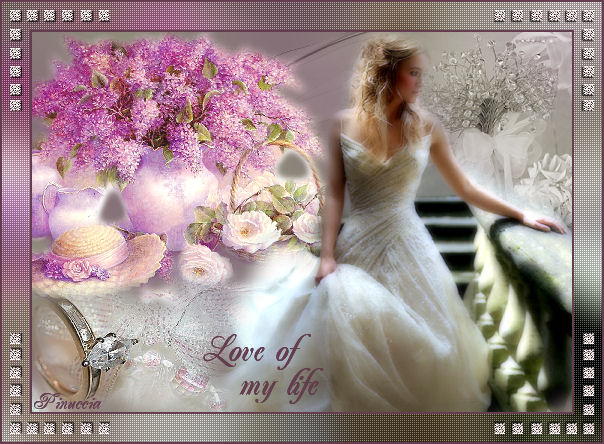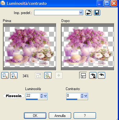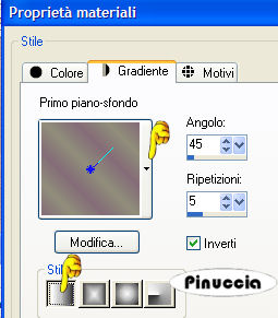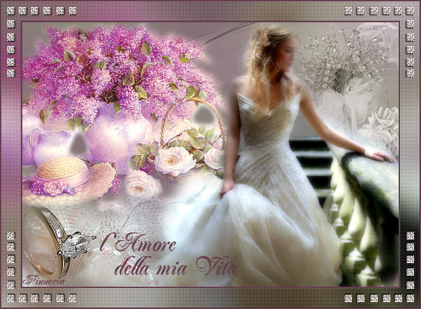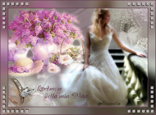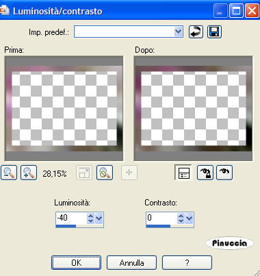 qui puoi trovare qualche risposta ai tuoi dubbi. Se l'argomento che ti interessa non è presente, ti prego di segnalarmelo. Questo tutorial è stato scritto in PSP 9, ma può essere eseguito con tutte le versioni di PSP. Occorrente: Materiale qui Se vuoi condividere i tubes, per favore rispetta il lavoro degli autori e lascia intatto il livello del watermark. Filtro Penta.com qui Apri una nuova immagine trasparente 540 x 380 pixels. Imposta il colore di primo piano con # 908e7a, e il colore di sfondo con # 846c78. Passa il colore di primo piano a Gradiente di primo piano/sfondo, lineare, con i seguenti settaggi: ![]() Riempi l'immagine con questo gradiente.Regola>Sfocatura>Sfocatura gaussiana, raggio 20. ![]() Apri il tube Mariel_2006_Smoke. Immagine>Ridimensiona, al 70%, tutti i livelli selezionato. Modifica>Copia. Torna al tuo lavoro e vai a Modifica>Incolla>Incolla come nuovo livello. Spostalo in alto a destra.Nella paletta dei livelli cambia la modalità di miscelatura in Luminanza (esistente) e abbassa l'opacità al 48%. ![]() ![]() Apri il tube MistedBySorensen_Designs_C2. Posizionati sul livello del tube. Regola>Luminosità e contrasto>Luminosità e contrasto: ![]() Immagine>Ridimensiona, al 75%, tutti i livelli selezionato. Modifica>Copia. Torna al tuo lavoro e vai a Modifica>Incolla>Incolla come nuovo livello. Spostalo in alto a sinistra.Apri il tube Deco1. Immagine>Rifletti. Immagine>Ridimensiona, al 70%, tutti i livelli selezionato. Modifica>Copia. Torna al tuo lavoro e vai a Modifica>Incolla>Incolla come nuovo livello. Spostalo in alto a destra.![]() Cambia la modalità di miscelatura di questo livello in Luminanza. Apri il tube Amestista%SF keira. Immagine>Ridimensiona, al 75%, tutti i livelli selezionato. Modifica>Copia. Torna al tuo lavoro e vai a Modifica>Incolla>Incolla come nuovo livello. Spostalo a destra.Livelli>Duplica. Livelli>Unisci>Unisci giù. Apri il tube Lace Ring_MistedByGini. Immagine>Ridimensiona, al 45%, tutti i livelli selezionato. Modifica>Copia. Torna al tuo lavoro e vai a Modifica>Incolla>Incolla come nuovo livello. Spostalo in basso a sinistra.Io ho aggiunto un passaggio. Se vuoi seguirlo, attiva lo strumento Gomma, posizionati - uno alla volta - sui livelli dei tube indicati dalla manina, e cancella i segni del tube dalle braccia della donna. ![]() E' tutto a posto? Se vuoi, puoi ancora spostare le immagini, per sistemarle meglio. Quando sei soddisfatto: Livelli>Unisci>Unisci tutto. ![]() Modifica>Copia. Immagine>Aggiungi bordatura, 2 pixels, simmetriche, con il colore #643e4f. Immagine>Aggiungi bordatura, 30 pixels, simmetriche, con il colore bianco (#000000). Seleziona il bordo con la bacchetta magica ![]() Modifica>Incolla>Incolla nella selezione. Regola>Sfocatura>Sfocatura gaussiana, raggio 20. Regola>Luminosità e contrasto>Luminosità e contrasto: ![]() Effetti>Plugins>Penta.com - Color dot, con i settaggi standard. ![]() Imposta il colore di sfondo con # 643e4f. Selezione>Seleziona tutto. Selezione>Modifica>Contrai, di 2 pixels. Selezione>Inverti. Riempi con il colore di sfondo.(Ricorda: essendo colore di sfondo devi cliccare con il tasto destro del mouse). Selezione>Nessuna selezione. Apri il tube Corner 1 e vai a Modifica>Copia. Torna al tuo lavoro e vai a Modifica>Incolla>Incolla come nuovo livello. Spostalo nell'angolo in alto a sinistra.Livelli>Duplica. Immagine>Rifletti. Livelli>Duplica. Immagine>Capovolgi. Livelli>Duplica. Immagine>Rifletti. Attiva lo strumento Testo , mobile.Chiudi il colore di primo piano e lascia il colore di sfondo impostato con #643e4f. Scegli un font (io ho usato Jacoba qui, dimensione 26) e scrivi "Love of my life" o, se vuoi, in italiano "L'amore della mia vita" o quello che preferisci). Se stai usando PSP X, dovrai regolare le dimensioni, perchè le dimensioni in pixels di questa versione non corrispondono alle versioni precedenti. Vedi qui Selezione>Innalza selezione a livello. Selezione>Nessuna selezione. Effetti>Effetti 3D>Sfalsa ombra, con i seguenti settaggi, colore #400a16. ![]() Posiziona il testo ed eventualmente aggiungi il tuo watermark. Livelli>Unisci>Unisci tutto. Salva in formato jpg. ![]() ![]() Gli esempi delle mie amiche. Grazie Marinella per aver testato la mia traduzione. ![]() Grazie Chiara. ![]() Se hai problemi o dubbi, o trovi un link non funzionante, o anche soltanto per dirmi che ti è piaciuto, scrivimi Gennaio 2007 |