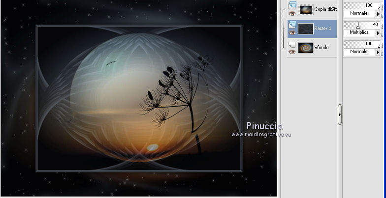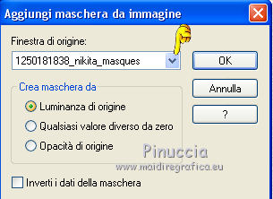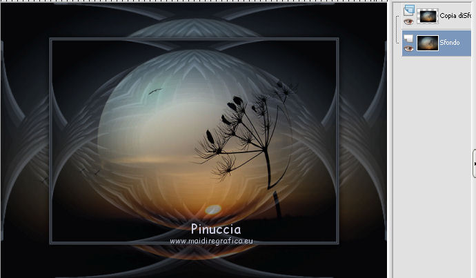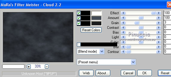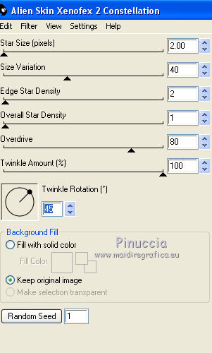 qui puoi trovare qualche risposta ai tuoi dubbi. Se l'argomento che ti interessa non è presente, ti prego di segnalarmelo. Questo tutorial è stato scritto con PSP 9. Per tradurlo, ho usato PSP X. Occorrente: Materiale qui Il tube è di Liza. La maschera è di Nikita. (in questa pagina trovi i links ai loro siti). Se vuoi condividere i tubes, per favore rispetta il lavoro degli autori, e lascia intatto il livello del watermark. Filtri: Alien skin Xenofex 2.0 - Constellation qui Mura's Meister - Cloud qui Penta.com - Color dot qui Imposta il colore di primo piano con #444b55, e il colore di sfondo con #1b1c1e. Apri una nuova immagine trasparente 700 x 500 pixels, e riempila con il colore di primo piano.Livelli>Nuovo livello raster. Riempi con il colore di sfondo.Livelli>Nuovo livello maschera>Da immagine. Apri il menu sotto la finestra di origine e vedrai la lista dei files aperti. Seleziona la maschera 1250181838_nikita_masques, con i seguenti settaggi. ![]() Livelli>Unisci>Unisci gruppo. Cambia la modalità di miscelatura di questo livello in Moltiplica. Apri il tube Liza misted Sundown e vai a Modifica>Copia. Torna al tuo lavoro e vai a Modifica>Incolla come nuovo livello. Livelli>Unisci>Unisci tutto. Livelli>Duplica. Immagine>Ridimensiona, al 75%, tutti i livelli non selezionato. ![]() Selezione>Seleziona tutto. Selezione>Mobile. Selezione>Immobilizza. Livelli>Nuovo livello raster. Riempi con il colore di primo piano.Selezione>Modifica>Contrai - 2 pixels. Riempi con il colore di sfondo.Selezione>Modifica>Contrai - 1 pixel. Riempi con il colore di primo piano.Selezione>Modifica>Contrai - 2 pixels. Premi sulla tastiera il tasto CANC ![]() Selezione>Deseleziona. Livelli>Unisci>Unisci giù. Effetti>Effetti 3D>Sfalsa ombra. ![]() Ripeti l'Effetto Sfalsa ombra, cambiando verticale e orizzontale con -2. Attiva il livello inferiore di sfondo. ![]() Regola>Sfocatura>Sfocatura gaussiana - raggio 10. ![]() Effetti>Effetti di distorsione>Mulinello. ![]() Effetti>Plugins>Alien Skin Xenofex 2.0 - Constellation. ![]() Livelli>Nuovo livello raster. Effetti>Plugins>Mura's Meister - Cloud. ![]()