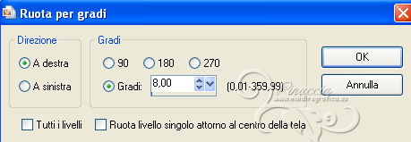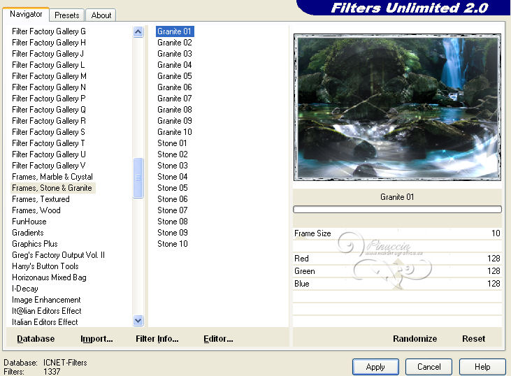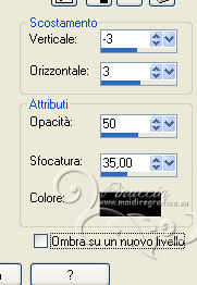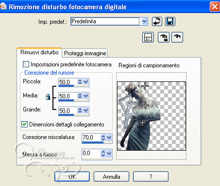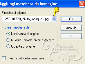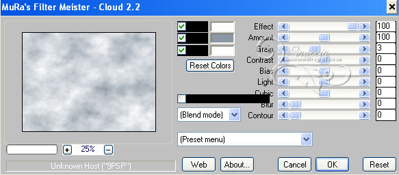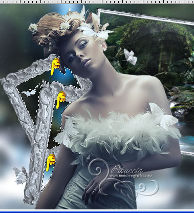 qui puoi trovare qualche risposta ai tuoi dubbi. Se l'argomento che ti interessa non è presente, ti prego di segnalarmelo. Questo tutorial è stato scritto con PSP 9. Per tradurlo, ho usato PSP X. Occorrente: Materiale qui Il tube è di Gina. La maschera è di Nikita. (in questa pagina trovi i links ai loro siti). Se vuoi condividere i tubes, per favore rispetta il lavoro degli autori, e lascia intatto il livello del watermark. Filtri se hai problemi con i Filtri consulta la mia sezione Filtri qui Filters Unlimited 2.0 qui Mura's Meister - Cloud qui ![]() Apri la maschera in PSP e minimizzala con il resto del materiale. Imposta il colore di primo piano con #8b98a4, e il colore di sfondo con #c0c0c0. Apri una nuova immagine trasparente 700 x 500 pixels, e riempila con il colore di primo piano.Apri il tube Gina Divers 297 e vai a Modifica>Copia. Torna al tuo lavoro e vai a Modifica>Incolla come nuovo livello. Spostalo a destra.Livelli>Duplica. Immagine>Rifletti. Sposta il duplicato a sinistra.![]() Livelli>Nuovo livello raster. Riempi con il colore di sfondo.Livelli>Nuovo livello maschera>Da immagine. Apri il menu sotto la finestra di origine e vedrai la lista dei files aperti. Seleziona la maschera 1250181728_nikita-masque, con seguenti settaggi. ![]() Livelli>Unisci>Unisci gruppo. Cambia la modalità di miscelatura di questo livello in Indebolisci. Livelli>Unisci>Unisci tutto. Duplica l'immagine, usando la combinazione di tasti maiuscola+D, e minimizza la copia. Torna al tuo lavoro. Immagine>Rifletti. Regola>Sfocatura>Sfocatura gaussiana - raggio 10. ![]() Livelli>Duplica. Effetti>Effetti artistici>Sfere e bolle. ![]() Cambia la modalità di miscelatura di questo livello in Luce diffusa, e abbassa l'opacità al 50%. Imposta il colore di sfondo con il colore #ffffff. Attiva l'immagine che hai minimizzato prima e vai a Modifica>Copia. minimizza nuovamente l'immagine perchè ti servirà ancora Torna al tuo lavoro e vai a Modifica>Incolla come nuovo livello. Immagine>Ridimensiona, al 65%, tutti i livelli non selezionato. ![]() Selezione>Seleziona tutto. Selezione>Mobile. Selezione>Immobilizza. Livelli>Nuovo livello raster. Riempi con il colore di primo piano.Selezione>Modifica>Contrai - 1 pixel. Riempi con il colore di sfondo.Selezione>Modifica>Contrai - 8 pixels. Riempi con il colore di primo piano.Selezione>Modifica>Contrai - 1 pixel. Premi sulla tastiera il tasto CANC ![]() Selezione>Deseleziona. Livelli>Unisci>Unisci giù. Dovresti aver questo. ![]() Attiva lo strumento Bacchetta magica ![]() ![]() e clicca nel bordo bianco per selezionarlo. Effetti>Plugins>Filters Unlimited 2.0 - Frames Stones & Granite - Granite 01. ![]() Selezione>Deseleziona. Immagine>Ruota per gradi - 8 gradi a destra. ![]() Regola>Messa a fuoco>Maschera di contrasto. ![]() Sposta l'immagine in alto a destra.Effetti>Effetti 3D>Sfalsa ombra. ![]() Ripeti l'Effetto Sfalsa ombra, cambiando verticale e orizzontale con -2. Apri il tube Gina Femme 2461 e vai a Modifica>Copia. Torna al tuo lavoro e vai a Modifica>Incolla come nuovo livello. Immagine>Ridimensiona, all'80%, tutti i livelli non selezionato. Regola>Rimozione disturbo fotocamera digitale, con i settaggi standard. ![]() Regola>Messa a fuoco>Maschera di contrasto. ![]() Sposta il tube in basso a sinistra.Attiva lo strumento Bacchetta magica ![]() e clicca negli spazi della cornice per selezionarli. ![]() Livelli>Nuovo livello raster. Selezione>Modifica>Espandi - 2 pixels. Attiva nuovamente il duplicato che hai minimizzato in precedenza. Modifica>Copia. Torna al tuo lavoro e vai a Modifica>Incolla nella selezione. Selezione>Deseleziona. Livelli>Disponi>Sposta giù. Attiva il livello superiore. Livelli>Unisci>Unisci giù. Effetti>Effetti 3D>Sfalsa ombra. ![]() Immagine>Aggiungi bordatura, 1 pixel, simmetriche, con il colore #ffffff. Immagine>Aggiungi bordatura, 45 pixels, simmetriche, con il colore #000000. Immagine>Aggiungi bordatura, 1 pixel, simmetriche, con il colore #ffffff. Seleziona il bordo da 45 pixels con la bacchetta magica ![]() Effetti>Plugins>Mura's Meister - Cloud. ![]() Selezione>Seleziona tutto. Selezione>Modifica>Contrai - 45 pixels. Effetti>Effetti 3D>Sfalsa ombra. ![]() Ripeti l'Effetto Sfalsa ombra, cambiando verticale e orizzontale con -2. Selezione>Deseleziona. Apri il file di testo magical moments e vai a Modifica>Copia. Torna al tuo lavoro e vai a Modifica>Incolla come nuovo livello. Spostalo dove preferisci o vedi il mio esempio.Aggiungi il tuo nome e/o il tuo watermark su un nuovo livello. Livelli>Unisci>Unisci tutto e salva in formato jpg. ![]() Se hai problemi o dubbi, o trovi un link non funzionante, o anche soltanto per dirmi che ti è piaciuto, scrivimi 7 Maggio 2013 |