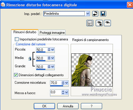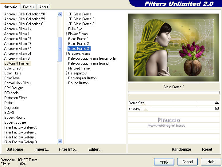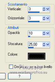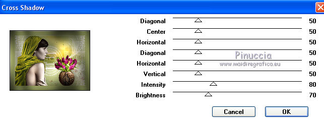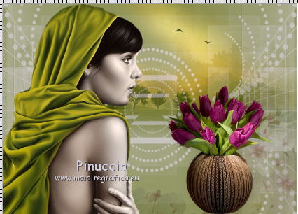 qui puoi trovare qualche risposta ai tuoi dubbi. Se l'argomento che ti interessa non è presente, ti prego di segnalarmelo. Questo tutorial è stato scritto con PSP 9. Dalla versione X4, il comando Immagine>Rifletti è stato sostituito con Immagine>Capovolgi in orizzontale, e il comando Immagine>Capovolgi con Immagine>Capovolgi in verticale. Nelle versioni X5 e X6, le funzioni sono state migliorate rendendo disponibile il menu Oggetti. Vedi la scheda sull'argomento qui Per tradurre questo tutorial ho usato PSP X. Occorrente: Materiale qui Per i tubes grazie Liza, Syl e Nikita. Per la maschera grazie Nikita. (in questa pagina trovi i links ai loro siti). Se vuoi condividere i tubes, per favore rispetta il lavoro degli autori, e lascia intatto il livello del watermark. Filtri: Filters Unlimited 2.0 qui Graphics Plus - Cross Shadow qui ![]() Apri la maschera in PSP e minimizzala con il resto del materiale. 1. Imposta il colore di primo piano con #c7c4bf, e il colore di sfondo con #8b9159. ![]() Apri una nuova immagine trasparente 700 x 500 pixels, e riempila con il colore di primo piano.2. Livelli>Nuovo livello raster. Riempi con il colore di sfondo.3. Livelli>Nuovo livello maschera>Da immagine. Apri il menu sotto la finestra di origine e vedrai la lista dei files aperti. Seleziona la maschera 1250181869_nikita_masques, con i seguenti settaggi. ![]() Livelli>Unisci>Unisci gruppo. 3. Apri il tube 1293040019_paysages_nikita e e vai a Modifica>Copia. Torna al tuo lavoro e vai a Modifica>Incolla come nuovo livello. Spostalo in alto a destra.![]() Cambia la modalità di miscelatura di questo livello in Sovrapponi. 4. Apri il tube 12930417542_fleurs_nikita e vai a Modifica>Copia. Torna al tuo lavoro e vai a Modifica>Incolla come nuovo livello. Elimina il watermark. Immagine>Ridimensiona, al 70%, tutti i livelli non selezionato. ![]() Spostalo in basso a destra.![]() Cambia la modalità di miscelatura di questo livello in Moltiplica, e abbassa l'opacità al 40%. ![]() 5. Apri il tube SvB Vaas met tulpen, e vai a Modifica>Copia. Torna al tuo lavoro e vai a Modifica>Incolla come nuovo livello. Immagine>Ridimensiona, al 65%, tutti i livelli non selezionato. Spostalo in basso a destra.![]() Effetti>Effetti 3D>Sfalsa ombra. ![]() 6. Apri il tube Liza lady in green 22-11-201, e vai a Modifica>Copia. Torna al tuo lavoro e vai a Modifica>Incolla come nuovo livello. Immagine>Ridimensiona, al 70%, tutti i livelli non selezionato. Regola>Rimozione disturbo fotocamera digitale. ![]() Regola>Messa a fuoco>Maschera di contrasto. ![]() Sposta il tube a sinistra.![]() Effetti>Effetti 3D>Sfalsa ombra, con i settaggi precedenti. 7. Immagine>Aggiungi bordatura, 1 pixel, simmetriche, con il colore di primo piano #c7c4bf. Immagine>Aggiungi bordatura, 45 pixels, simmetriche, con il colore di sfondo #8b9159. Immagine>Aggiungi bordatura, 1 pixel, simmetriche, con il colore di primo piano #c7c4bf. 8. Attiva lo strumento Bacchetta magica ![]() ![]() 9. Effetti>Plugins>Graphics Plus - Cross Shadow. ![]() Selezione>Deseleziona. 10. Effetti>Plugins>Filters Unlimited 2.0 - Buttons &Frames - Glass Frame 3. ![]() 11. Firma il tuo lavoro su un nuovo livello. Livelli>Unisci>Unisci tutto e salva in formato jpg. ![]() Le vostre versioni ![]() ![]() Se hai problemi o dubbi, o trovi un link non funzionante, o anche soltanto per dirmi che ti è piaciuto, scrivimi