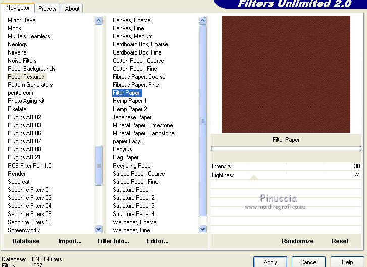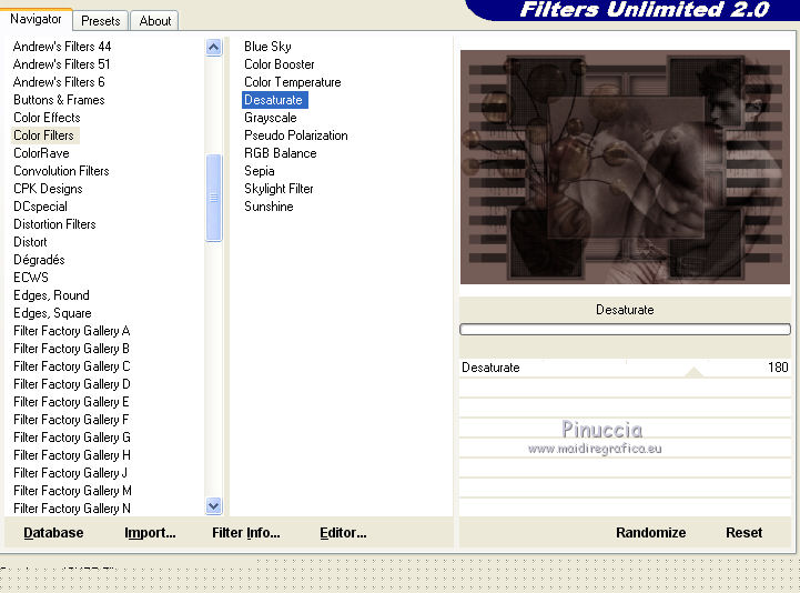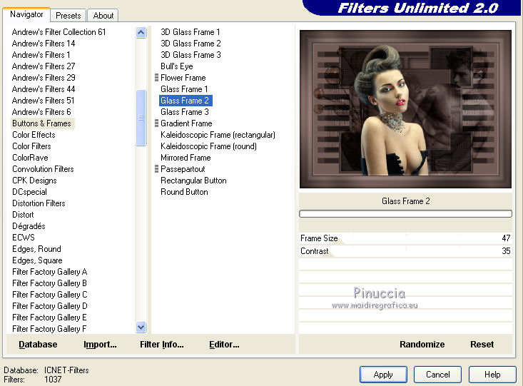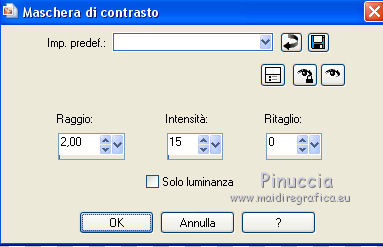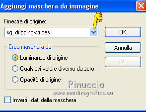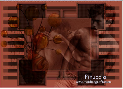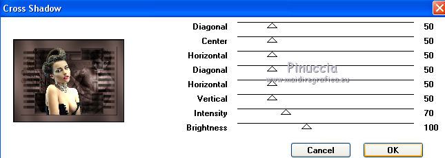 qui puoi trovare qualche risposta ai tuoi dubbi. Se l'argomento che ti interessa non è presente, ti prego di segnalarmelo. Questo tutorial è stato scritto con PSP 9. Dalla versione X4, il comando Immagine>Rifletti è stato sostituito con Immagine>Capovolgi in orizzontale, e il comando Immagine>Capovolgi con Immagine>Capovolgi in verticale. Nelle versioni X5 e X6, le funzioni sono state migliorate rendendo disponibile il menu Oggetti. Vedi la scheda sull'argomento qui Per tradurre questo tutorial ho usato PSP X. Occorrente: Materiale qui Per i tubes grazie Syl, Kitty e Angie. Per la maschera grazie EssexGirl. (in questa pagina trovi i links ai loro siti). Se vuoi condividere i tubes, per favore rispetta il lavoro degli autori, e lascia intatto il livello del watermark. Filtri: in caso di dubbi, ricorda di consultare la mia sezione filtri qui Filters Unlimited 2.0 qui Graphics Plus - Cross Shadow qui I filtri Graphics Plus si possono usare da soli o importati in Filters Unlimited (come fare vedi qui) Se un filtro fornito appare con questa icona ![]() Apri la maschera in PSP e minimizzala con il resto del materiale. 1. Imposta il colore di primo piano con #a14f3c, e il colore di sfondo con #000000. Apri una nuova immagine trasparente 700 x 500 pixels, e riempila con il colore di primo piano.2. Livelli>Nuovo livello raster. Riempi con il colore di sfondo.3. Livelli>Nuovo livello maschera>Da immagine. Apri il menu sotto la finestra di origine e vedrai la lista dei files aperti. Seleziona la maschera sg_dripping-stripes, con i seguenti settaggi. ![]() Livelli>Unisci>Unisci gruppo. 4. Imposta il colore di primo piano con #612c1f. Attiva lo strumento Selezione , rettangolo,![]() Traccia un rettangolo della parte centrale nera. ![]() 5. Livelli>Nuovo livello raster. Riempi con il colore di primo piano.6. Effetti>Plugins>Filters Unlimited 2.0 - Paper Textures - Filter Paper. ![]() Selezione>Deseleziona. 7. Apri il tube T2009_angie140 e vai a Modifica>Copia. Torna al tuo lavoro e vai a Modifica>Incolla come nuovo livello. Immagine>Ridimensiona, al 70%, tutti i livelli non selezionato. ![]() Cambia la modalità di miscelatura di questo livello in Luminanza (esistente), e abbassa l'opacità al 62%. 8. Apri il tube Kittys-Oliver Cheshirex e vai a Modifica>Copia. Torna al tuo lavoro e vai a Modifica>Incolla come nuovo livello. Immagine>Ridimensiona, al 90%, tutti i livelli non selezionato. Spostalo a destra e un po' più in basso.(vedi il mio esempio). Cambia la modalità di miscelatura di questo livello in Luce diffusa. 9. Apri il tube Kittys-flowerbals e vai a Modifica>Copia. Torna al tuo lavoro e vai a Modifica>Incolla come nuovo livello. Immagine>Ridimensiona, al 65%, tutti i livelli non selezionato. Spostalo a sinistra.![]() Cambia la modalità di miscelatura di questo livello in Luce diffusa. 10. Livelli>Unisci>Unisci tutto. Effetti>Plugins>Filters Unlimited 2.0 - Color Filters - Desaturate. ![]() 11. Apri il tube SvB(457)Beauty, e vai a Modifica>Copia. Torna al tuo lavoro e vai a Modifica>Incolla come nuovo livello. Immagine>Ridimensiona, al 65%, tutti i livelli non selezionato. Regola>Messa a fuoco>Maschera di contrasto. ![]() Spostalo a sinistra e un po' più in basso.Effetti>Effetti 3D>Sfalsa ombra. ![]() 12. Immagine>Aggiungi bordatura, 2 pixels, simmetriche, con il colore #28201e. Immagine>Aggiungi bordatura, 45 pixels, simmetriche, con il colore di #715d58. Immagine>Aggiungi bordatura, 2 pixels, simmetriche, colore #28201e. 13. Attiva lo strumento Bacchetta magica , tolleranza 0![]() Clicca nel bordo da 45 pixels per selezionarlo. 14. Effetti>Plugins>Graphics Plus - Cross Shadow. ![]() Selezione>Deseleziona. 15. Effetti>Plugins>Filters Unlimited 2.0 - Buttons &Frames - Glass Frame 2. ![]() 16. Firma il tuo lavoro su un nuovo livello. Livelli>Unisci>Unisci tutto e salva in formato jpg. Le vostre versioni. ![]() Olimpia ![]() Se hai problemi o dubbi, o trovi un link non funzionante, o anche soltanto per dirmi che ti è piaciuto, scrivimi