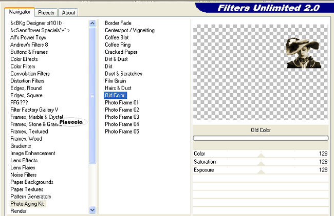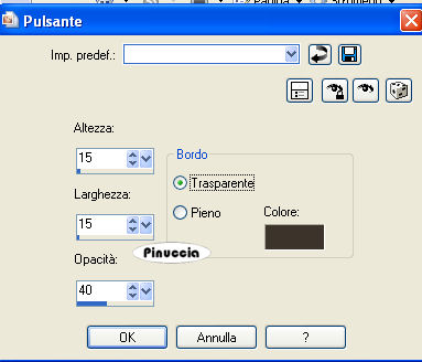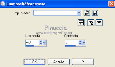 qui puoi trovare qualche risposta ai tuoi dubbi. Se l'argomento che ti interessa non è presente, ti prego di segnalarmelo. Questo tutorial è stato scritto con PSP 9. Per tradurlo, ho usato PSP X. Occorrente: Materiale qui I tubes usati per questo tutorial sono di Sandi, Jet, @nn, Mou e Marif. L'immagine di sfondo è di Azyzam. Se vuoi condividere i tubes, per favore rispetta il lavoro degli autori, e lascia intatto il livello del watermark. Filtri: Filters Unlimited 2.0 qui Cybia qui Apri una nuova immagine trasparente 700 x 500 pixels. Imposta il colore di primo piano con #3d352b. Apri l'immagine Azyzam bg 18 e vai a Modifica>Copia. Torna all'immagine trasparente e via a Modifica>Incolla>Incolla come nuovo livello. Immagine>Ridimensiona, al 125%, tutti i livelli non selezionato. ![]() Sposta l'immagine in alto e un po' più a sinistra.![]() Apri il tube Marif5F misted decor018, e vai a Modifica>Copia. Torna al tuo lavoro e vai a Modifica>Incolla>Incolla come nuovo livello. Sposta il tube in basso a destra.Cambia la modalità di miscelatura di questo livello in Moltiplica, e abbassa l'opacità al 34%. ![]() Apri il tube Scrapframes9m-sandi. E' già attivo il livello che ti interessa: Modifica>Copia. Torna al tuo lavoro e vai a Modifica>Incolla>Incolla come nuovo livello. Immagine>Ridimensiona, all'85%, tutti i livelli non selezionato. Regola>Messa a fuoco>Metti a fuoco. Regola>Luminosità e contrasto>Luminosità e Contrasto: ![]() Effetti>Effetti 3D>Sfalsa ombra: ![]() Sposta le cornici in alto.Livelli>Nuovo livello raster. Attiva lo strumento Selezione ![]() ![]() e seleziona le cornici come nell'esempio: ![]() Riempi la selezione con il colore di primo piano.Selezione>Nessuna selezione. Livelli>Disponi>Sposta giù. Apri il tube @nn_aspiritwoman e vai a Modifica>Copia. Torna al tuo lavoro e vai a Modifica>Incolla>Incolla come nuovo livello. Immagine>Ridimensiona, al 38%, tutti i livelli non selezionato. Posiziona il tube nella cornice destra.Effetti>Plugins>Filters Unlimited - Photo Aging Kit - Old Color, con i settaggi standard: ![]() Effetti>Effetti 3D>Sfalsa ombra, con i settaggi precedenti. Apri il tube mou_casablanca, e vai a Modifica>Copia. Torna al tuo lavoro e vai a Modifica>Incolla>Incolla come nuovo livello. Immagine>Ridimensiona, al 40%, tutti i livelli non selezionato. Posiziona il tube nella cornice al centro.Attiva lo strumento Gomma ![]() e cancella la parte del tube che esce dalla cornice: ![]() Effetti>Plugins>Filters Unlimited - Photo Aging Kit - Old Color, con i settaggi precedenti. Effetti>Effetti 3D>Sfalsa ombra, con i settaggi precedenti. Attiva il livello superiore (la cornice). Apri il tube jet-woman01 e vai a Modifica>Copia. Torna al tuo lavoro e vai a Modifica>Incolla>Incolla come nuovo livello. Immagine>Rifletti. Immagine>Ridimensiona, al 90%, tutti i livelli non selezionato. Regola>Luminosità e Contrasto>Luminosità e contrasto: ![]() Sposta il tube in basso a sinistra.Effetti>Plugins>Filters Unlimited - Photo Aging Kit - Old Color, con i settaggi precedenti. Effetti>Effetti 3D>Sfalsa ombra, con i settaggi precedenti. Apri il tube doubleheart06-sandi e vai a Modifica>Copia. Torna al tuo lavoro e vai a Modifica>Incolla>Incolla come nuovo livello. Immagine>Rifletti. Immagine>Ridimensiona, al 40%, tutti i livelli non selezionato. Immagine>Ruota>Ruota per gradi - 20 gradi a destra: ![]() Regola>Messa a fuoco>Metti a fuoco. Effetti>Effetti 3D>sfalsa ombra, con i settaggi precedenti. Posiziona i cuori a destra, come nel mio esempio.Immagine>Aggiungi bordatura, 1 pixel, simmetriche, con il colore #b6af9f. Immagine>Aggiungi bordatura, 2 pixels, simmetriche, con il colore #827857. Immagine>Aggiungi bordatura, 1 pixel, simmetriche, con il colore #b6af9f. Immagine>Aggiungi bordatura, 25 pixels, simmetriche, con il colore nero. Seleziona questo bordo con la bacchetta magica ![]() ![]() Riempi la selezione con il colore di primo piano.Effetti>Plugins>Cybia - Screenwork: seleziona Regular Glyph, con i seguenti settaggi: ![]() Selezione>Inverti. Effetti>Effetti 3D>Pulsante: ![]() Selezione>Nessuna selezione. Immagine>Aggiungi bordatura, 1 pixel, simmetriche, con il colore #b6af9f. Immagine>Aggiungi bordatura, 2 pixels, simmetriche, con il colore #827857. Immagine>Aggiungi bordatura, 1 pixel, simmetriche, con il colore #b6af9f. Apri il file di testo: Memories of the past e vai a Modifica>Copia. Torna al tuo lavoro e vai a Modifica>Incolla>Incolla come nuovo livello. Posiziona il testo in basso a destra.Cambia la modalità di miscelatura di questo livello in Luminanza (Esistente). Aggiungi il tuo nome e/o il tuo watermark su un nuovo livello. Livelli>Unisci>Unisci tutto e salva in formato jpg. ![]() Se hai problemi o dubbi, o trovi un link non funzionante, o anche soltanto per dirmi che ti è piaciuto, scrivimi 31 Agosto 2008 |