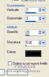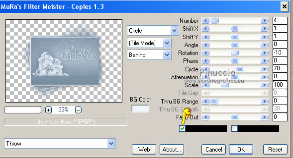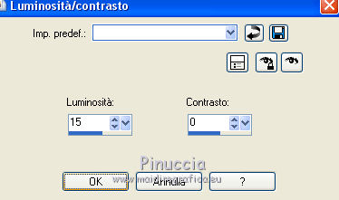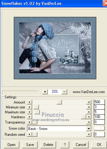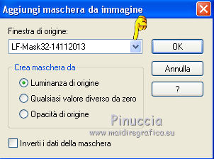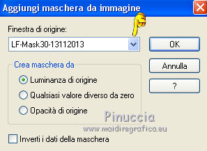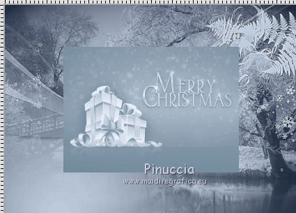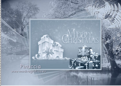qui puoi trovare qualche risposta ai tuoi dubbi. Se l'argomento che ti interessa non è presente, ti prego di segnalarmelo. Questo tutorial è stato scritto con PSP 9. Dalla versione X4, il comando Immagine>Rifletti è stato sostituito con Immagine>Capovolgi in orizzontale, e il comando Immagine>Capovolgi con Immagine>Capovolgi in verticale. Nelle versioni X5 e X6, le funzioni sono state migliorate rendendo disponibile il menu Oggetti. Vedi la scheda sull'argomento qui Per tradurre questo tutorial ho usato PSP X. Occorrente: Materiale qui Per i tubes grazie Liza, Syl e Gerry Per le maschere grazie Linda. (in questa pagina trovi i links ai loro siti). Se vuoi condividere i tubes, per favore rispetta il lavoro degli autori, e lascia intatto il livello del watermark. Filtri: VDL Adrenaline - Snowflakes qui Mura's Meister - Copies qui ![]() Apri le maschere in PSP e minimizzale con il resto del materiale. Imposta il colore di primo piano con #152034, e il colore di sfondo con #c3d0e1. Apri una nuova immagine trasparente 700 x 500 pixels, e riempila con il colore di primo piano.Apri il tube SvB Winters 6 misted e vai a Modifica>Copia. Torna al tuo lavoro e vai a Modifica>Incolla come nuovo livello. Immagine>Ridimensiona, al 120%, tutti i livelli non selezionato. ![]() Spostalo un po' più in alto (vedi il mio esempio).Cambia la modalità di miscelatura di questo livello in Luminanza (esistente), e abbassa l'opacità all'80%. Livelli>Nuovo livello raster. Riempi con il colore di sfondo.Livelli>Nuovo livello maschera>Da immagine. Apri il menu sotto la finestra di origine e vedrai la lista dei files aperti. Seleziona la maschera LF-Mask30-13112013, con i seguenti settaggi. ![]() Livelli>Unisci>Unisci gruppo. Effetti>Effetti di bordo>Aumenta. Imposta il colore di primo piano con #6a8296, e il colore di sfondo con #eff5ff. Livelli>Nuovo livello raster. Riempi con il colore di primo piano.Livelli>Nuovo livello maschera>Da immagine. Apri il menu sotto la finestra di origine e seleziona la maschera LF-Mask32-14112013, con i seguenti settaggi. ![]() Livelli>Unisci>Unisci gruppo. Livelli>Unisci>Unisci giù. Immagine>Ridimensiona, al 60%, tutti i livelli non selezionato. ![]() Selezione>Seleziona tutto. Selezione>Mobile. Selezione>Immobilizza. Livelli>Nuovo livello raster. Riempi con il colore di sfondo.Selezione>Modifica>Contrai - 2 pixels. Riempi con il colore di primo piano.Selezione>Modifica>Contrai - 2 pixels. Riempi con il colore di sfondo.Selezione>Modifica>Contrai - 2 pixels. Premi sulla tastiera il tasto CANC ![]() Selezione>Deseleziona. Livelli>Unisci>Unisci giù. Effetti>Effetti 3D>Sfalsa ombra. ![]() Effetti>Plugins>Mura's Meister - Copies. ![]() Sposta l'immagine un po' più in basso a destra.Apri il tube Gerry-Kerst 65-present e vai a Modifica>Copia. Torna al tuo lavoro e vai a Modifica>Incolla come nuovo livello. Immagine>Rifletti. Immagine>Ridimensiona, al 50%, tutti i livelli non selezionato. Regola>Luminosità e contrasto>Luminosità e contrasto. ![]() Regola>Messa a fuoco>Maschera di contrasto. ![]() Sposta il tube nel riquadro centrale.Cambia la modalità di miscelatura di questo livello in Luminanza (esistente). ![]() Apri il tube Liza 263 e vai a Modifica>Copia. Torna al tuo lavoro e vai a Modifica>Incolla come nuovo livello. Immagine>Ridimensiona, al 65%, tutti i livelli non selezionato. Spostalo a sinistra, e un po' più in basso.Regola>Messa a fuoco>Maschera di contrasto, con i settaggi precedenti. Effetti>Effetti 3D>Sfalsa ombra, con i settaggi precedenti. Immagine>Aggiungi bordatura, 2 pixels, simmetriche, colore #eff5ff. Immagine>Aggiungi bordatura, 50 pixels, simmetriche, colore #6a8296. Immagine>Aggiungi bordatura, 2 pixels, simmetriche, colore #eff5ff. Attiva lo strumento Bacchetta magica ![]() ![]() e clicca nel bordo da 50 pixels per selezionarlo. Effetti>Plugins>VanDerLee - Snowflakes se stai usando la versione precedente del filtro (il risultato non cambia): Effetti>Plugins>VDL Adrenaline - Snowflakes. ![]() Selezione>Seleziona tutto. Selezione>Modifica>Contrai - 52 pixels. Effetti>Effetti 3D>Sfalsa ombra. ![]() Ripeti l'Effetto Sfalsa ombra, cambiando verticale e orizzontale con -3. Selezione>Deseleziona. Aggiungi il tuo nome e/o il tuo watermark su un nuovo livello. Livelli>Unisci>Unisci tutto e salva in formato jpg. ![]() Se hai problemi o dubbi, o trovi un link non funzionante, o anche soltanto per dirmi che ti è piaciuto, scrivimi 11 Dicembre 2013 |