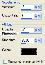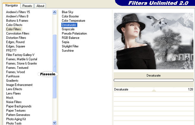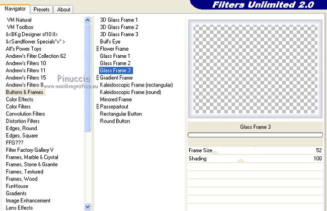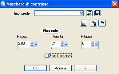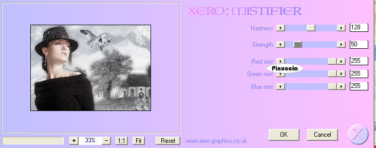 Regola>Rimozione disturbo fotocamera digitale, con i settaggi standard.![]() Regola>Messa a fuoco>Maschera di contrasto: ![]() Effetti>Effetti 3D>Sfalsa ombra: ![]() Livelli>Unisci>Unisci tutto. Effetti>Plugins>Filters Unlimited – Color Filters – Desaturate. ![]() Effetti>Plugins>Xero – Mistifier: ![]() Imposta il colore di primo piano con #c9ccd2. Immagine>Aggiungi bordatura, 1 pixel, simmetriche, con il colore bianco. Immagine>Aggiungi bordatura, 3 pixels, simmetriche, con il colore nero. Seleziona questo bordo con la bacchetta magica ![]() ![]() Riempi la selezione con il colore di primo piano.Selezione>Deseleziona. Immagine>Aggiungi bordatura, 1 pixel, simmetriche, con il colore bianco. Immagine>Aggiungi bordatura, 30 pixels, simmetriche, con il colore nero. Seleziona il bordo con la bacchetta magica ![]() e riempilo con il colore di primo piano.Effetti>Plugins>Funhouse – Maelstrom, con i settaggi standard. ![]() Livelli>Nuovo livello raster. Riempi con il colore di primo piano.Cambia la modalità di miscelatura di questo livello in Schiarisci, e abbassa l’opacità al 70%. Effetti>Plugins>Filters Unlimited – Buttons and Frames – Glass Frame 3: ![]() Selezione>Deseleziona. Apri il testo Morning mist e vai a Modifica>copia. Torna al tuo lavoro e vai a Modifica>Incolla come nuovo livello. Posiziona il testo in alto a destra.Aggiungi il tuo nome e/o il tuo watermark su un nuovo livello. Livelli>Unisci>Unisci tutto e salva in formato jpg. ![]() Se hai problemi o dubbi, o trovi un link non funzionante, o anche soltanto per dirmi che ti è piaciuto, scrivimi 10 Ottobre 2008 |