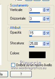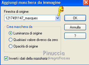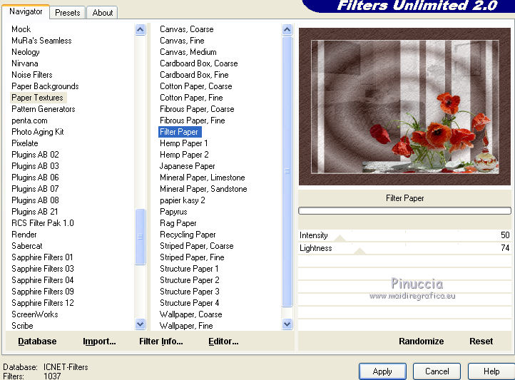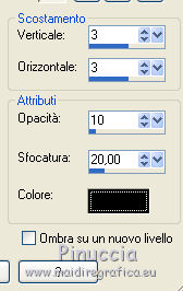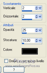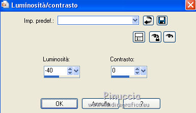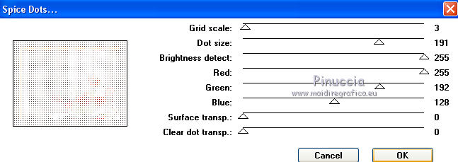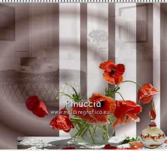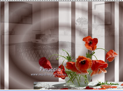 qui puoi trovare qualche risposta ai tuoi dubbi. Se l'argomento che ti interessa non è presente, ti prego di segnalarmelo. Questo tutorial è stato scritto con PSP 9. Dalla versione X4, il comando Immagine>Rifletti è stato sostituito con Immagine>Capovolgi in orizzontale, e il comando Immagine>Capovolgi con Immagine>Capovolgi in verticale. Nelle versioni X5 e X6, le funzioni sono state migliorate rendendo disponibile il menu Oggetti. Vedi la scheda sull'argomento qui Per tradurre questo tutorial ho usato PSP X. Occorrente: Materiale qui Per i tubes grazie Jet, Nikita, Jeanne e Syl. Per la maschera grazie Nikita. (in questa pagina trovi i links ai loro siti). Se vuoi condividere i tubes, per favore rispetta il lavoro degli autori, e lascia intatto il livello del watermark. Filtri: in caso di dubbi, ricorda di consultare la mia sezione filtri qui Filters Unlimited 2.0 qui Unplugged Tools qui I filtri Unplugged si possono usare da soli o importati in Filters Unlimited (come fare vedi qui) Se un filtro fornito appare con questa icona ![]() Apri la maschera in PSP e minimizzala con il resto del materiale. 1. Imposta il colore di primo piano con #f1eded, e il colore di sfondo con #442b25. Apri una nuova immagine trasparente 700 x 500 pixels, e riempila con il colore di primo piano.2. Livelli>Nuovo livello raster. Riempi con il colore di sfondo.3. Livelli>Nuovo livello maschera>Da immagine. Apri il menu sotto la finestra di origine e vedrai la lista dei files aperti. Seleziona la maschera 1217491147, con i seguenti settaggi. ![]() Livelli>Unisci>Unisci gruppo. 4. Apri il tube SvB Interieur 15 misted e vai a Modifica>Copia. Torna al tuo lavoro e vai a Modifica>Incolla come nuovo livello. ![]() Sposta il tube in alto.Cambia la modalità di miscelatura di questo livello in Luminanza (esistente), e abbassa l'opacità al 26%. ![]() 5. Apri il tube 12930417537_fleurs_nikita, e vai a Modifica>Copia. Torna al tuo lavoro e vai a Modifica>Incolla come nuovo livello. Immagine>Rifletti. Immagine>Ridimensiona, al 75%, tutti i livelli non selezionato. ![]() Regola>Messa a fuoco>Maschera di contrasto. ![]() Spostalo in basso a destra.![]() Effetti>Effetti 3D>Sfalsa ombra. ![]() 6. Apri il tube Parfum 1, e vai a Modifica>Copia. Torna al tuo lavoro e vai a Modifica>Incolla come nuovo livello. Immagine>Ridimensiona, 2 volte al 70%, tutti i livelli non selezionato. Regola>Messa a fuoco>Maschera di contrasto, con i settaggi precedenti. Effetti>Effetti 3D>Sfalsa ombra, con i settaggi precedenti. Spostalo in basso a destra.![]() 7. Immagine>Aggiungi bordatura, 2 pixels, simmetriche, con il colore #f1eded. Immagine>Aggiungi bordatura, 45 pixels, simmetriche, con il colore di #553c36. Immagine>Aggiungi bordatura, 5 pixels, simmetriche, colore #f1eded. 8. Attiva lo strumento Bacchetta magica , tolleranza 0![]() Clicca nel bordo di 45 pixels per selezionarlo. 9. Effetti>Plugins>Filters Unlimited 2.0 - Paper Textures - Filter Paper. ![]() Mantieni selezionato. 10. Livelli>Nuovo livello raster. Riempi con il colore di primo piano.Cambia la modalità di miscelatura di questo livello in luce diffusa. Selezione>Deseleziona. 11. Attiva il livello di sfondo. Seleziona il bordo di 5 pixels con la bacchetta magica ![]() 12. Effetti>Plugins>Unplugged Tools - Spice Dots. ![]() Effetti>Effetti di bordo>Aumenta. 13. Selezione>Seleziona tutto. Selezione>Modifica>Contrai - 50 pixels. 14. Effetti>Effetti 3D>Sfalsa ombra. ![]() Ripeti l'Effetto Sfalsa ombra, cambiando verticale e orizzontale con -2. Selezione>Deseleziona. 15. Attiva il livello superiore. Apri il tube jet-womanface e vai a Modifica>Copia. Torna al tuo lavoro e vai a Modifica>Incolla come nuovo livello. Immagine>Rifletti. Immagine>Ridimensiona, all'80%, tutti i livelli non selezionato. Regola>Messa a fuoco>Maschera di contrasto. ![]() Posiziona il tube in basso a sinistra,contro il bordo da 2 pixels. 16. Effetti>Effetti 3D>Sfalsa ombra. ![]() 17. Firma il tuo lavoro su un nuovo livello. Livelli>Unisci>Unisci tutto e salva in formato jpg. Le vostre versioni ![]() Olimpia ![]() Se hai problemi o dubbi, o trovi un link non funzionante, o anche soltanto per dirmi che ti è piaciuto, scrivimi 21 Aprile 2014 |