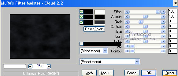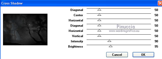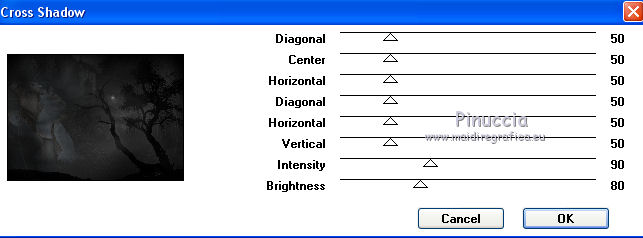 qui puoi trovare qualche risposta ai tuoi dubbi. Se l'argomento che ti interessa non è presente, ti prego di segnalarmelo. Questo tutorial è stato scritto con PSP 9. Dalla versione X4, il comando Immagine>Rifletti è stato sostituito con Immagine>Capovolgi in orizzontale, e il comando Immagine>Capovolgi con Immagine>Capovolgi in verticale. Nelle versioni X5 e X6, le funzioni sono state migliorate rendendo disponibile il menu Oggetti. Vedi la scheda sull'argomento qui Per tradurre questo tutorial ho usato PSP X. Occorrente: Materiale qui Per i tubes grazie Kitty, Liza, Jeanne, Guismo e Farouche. (in questa pagina trovi i links ai loro siti). Se vuoi condividere i tubes, per favore rispetta il lavoro degli autori, e lascia intatto il livello del watermark. Filtri: Mura's Meister - Cloud qui Graphics Plus - Cross Shadow qui Animation Shop qui ![]() Imposta il colore di primo piano con #000000, e il colore di sfondo con #26292e. Apri una nuova immagine trasparente 700 x 500 pixels, e riempila con il colore di primo piano.Apri il tube calguismistplanete5 e vai a Modifica>Copia. Torna al tuo lavoro e vai a Modifica>Incolla come nuovo livello. Cambia la modalità di miscelatura di questo livello in Luminanza (esistente), e abbassa l'opacità all'8%. Apri il tube JVDE_Trainees e vai a Modifica>Copia. Torna al tuo lavoro e vai a Modifica>Incolla come nuovo livello. Immagine>Rifletti. Immagine>Ridimensiona, al 90%, tutti i livelli non selezionato. ![]() Spostalo in basso.Cambia la modalità di miscelatura di questo livello in Luminanza (esistente), e abbassa l'opacità al 16%. Apri il tube gothscenic 2, e vai a Modifica>Copia. Torna al tuo lavoro e vai a Modifica>Incolla come nuovo livello. Immagine>Rifletti. Spostalo in alto a sinistra.Cambia la modalità di miscelatura di questo livello in Luminanza (esistente), e abbassa l'opacità al 40%. Attiva lo strumento Gomma ![]() ![]() Cancella la parte bianca del tube. ![]() ![]() Apri il tube Misted12 15-10-1211 van Liza e vai a Modifica>Copia. Torna al tuo lavoro e vai a Modifica>Incolla come nuovo livello. Immagine>Rifletti. Immagine>Ridimensiona, all'85%, tutti i livelli non selezionato. Spostalo a sinistra.Cambia la modalità di miscelatura di questo livello in Luminanza (esistente), Abbassa l'opacità di questo livello al 18%. ![]() Immagine>Aggiungi bordatura, 2 pixels, simmetriche, con il colore #2e3133. Immagine>Aggiungi bordatura, 40 pixels, simmetriche, con il colore #000000. Immagine>Aggiungi bordatura, 2 pixels, simmetriche, con il colore #2e3133. Attiva lo strumento Bacchetta magica ![]() ![]() Clicca nel bordo da 40 pixels per selezionarlo. Effetti>Plugins>Mura's Meister - Cloud. ![]()