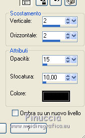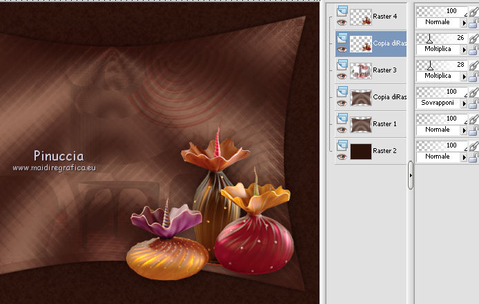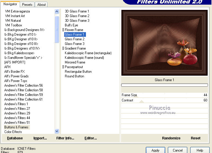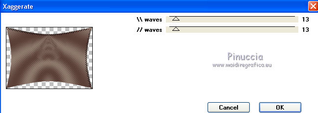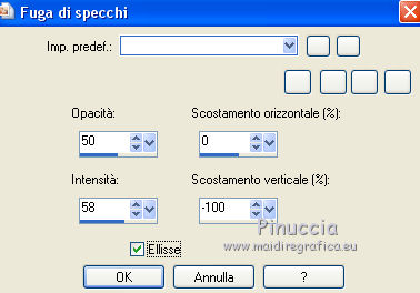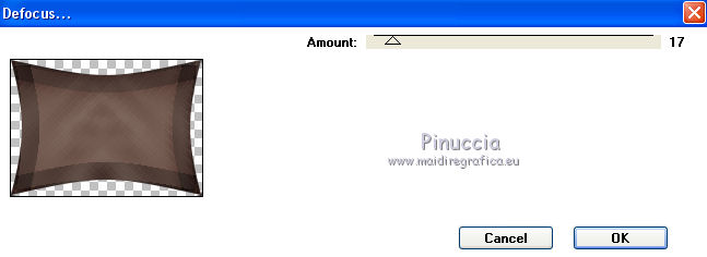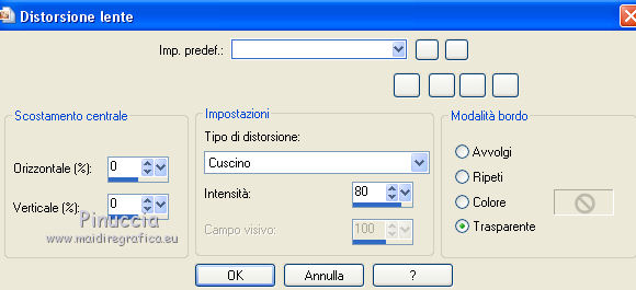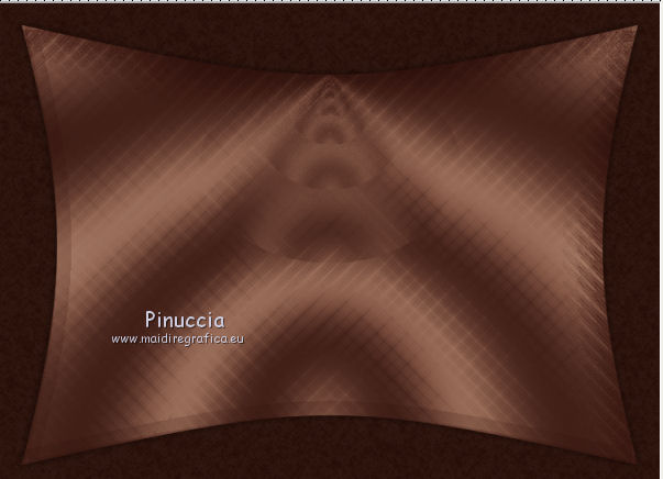 qui puoi trovare qualche risposta ai tuoi dubbi. Se l'argomento che ti interessa non è presente, ti prego di segnalarmelo. Questo tutorial è stato scritto con PSP 9. Per tradurlo, ho usato PSP X. Occorrente: Materiale qui Per i tubes grazie Kitty, Claudia e Syl. Lo sfondo BG_MyColors è di Adriana. (in questa pagina trovi i links ai loro siti). Se vuoi condividere i tubes, per favore rispetta il lavoro degli autori, e lascia intatto il livello del watermark. Filtri: Filters Unlimited 2.0 qui Funhouse qui Unplugged Effects qui ![]() Imposta il colore di primo piano con #a28f82, e il colore di sfondo con #482b25. Passa il colore di primo piano a Gradiente di primo piano/sfondo, stile Sprazzo di luce. ![]() Apri una nuova immagine trasparente 700 x 500 pixels, e riempila con il gradiente.Regola>Sfocatura>Sfocatura gaussiana - raggio 30. ![]() Effetti>Effetti di riflesso>Fuga di specchi. ![]() Effetti>Effetti di distorsione>Distorsione lente. ![]() Livelli>Duplica. Attiva il livello sottostante Raster 1. Effetti>Plugins>Funhouse - Xaggerate. ![]() Effetti>Plugins>Unplugged Effects - Defocus. ![]() Attiva nuovamente il livello superiore. Cambia la modalità di miscelatura di questo livello in Sovrapponi. Immagine>Dimensioni tela - 750 x 550 pixels. ![]() Effetti>Effetti 3D>Sfalsa ombra. ![]() Ripeti l'Effetto Sfalsa ombra, cambiando verticale e orizzontale con -2. Apri BG_MyColors_AdrianaDesigns e vai a Modifica>Copia. Torna al tuo lavoro e vai a Modifica>Incolla come nuovo livello. Livelli>Disponi>Porta sotto. ![]() Attiva il livello superiore. Apri il tube SvB Interieur 9 misted e vai a Modifica>Copia. Torna al tuo lavoro e vai a Modifica>Incolla come nuovo livello. Cambia la modalità di miscelatura di questo livello in Moltiplica e abbassa l'opacità al 28%. Apri il tube claudiaviza-mix116 e vai a Modifica>Copia. Torna al tuo lavoro e vai a Modifica>Incolla come nuovo livello. Immagine>Rifletti. Immagine>Ridimensiona, al 55%, tutti i livelli non selezionato. ![]() Ancora Immagine>Ridimensiona, all'80%, tutti i livelli non selezionato. Regola>Messa a fuoco>Maschera di contrasto. ![]() Sposta il tube in basso a destra.Effetti>Effetti 3D>Sfalsa ombra. ![]() Livelli>Duplica. Sposta questo tube un po' più in alto a destra.Livelli>Disponi>Sposta giù. Cambia la modalità di miscelatura di questo livello in Moltiplica, e abbassa l'opacità al 26%. ![]() Immagine>Aggiungi bordatura, 2 pixels, simmetriche, colore #7f5544. Immagine>Aggiungi bordatura, 10 pixels, simmetriche, colore #2c140e. Immagine>Aggiungi bordatura, 2 pixels, simmetriche, colore #7f5544. Immagine>Aggiungi bordatura, 40 pixels, simmetriche, colore #2c140e. Immagine>Aggiungi bordatura, 2 pixels, simmetriche, colore #7f5544. Effetti>Plugins>Filters Unlimited 2.0 - Buttons &Frames - Glass Frame 1. ![]() Apri il tube Kittys_MachineFairy e vai a Modifica>Copia. Torna al tuo lavoro e vai a Modifica>Incolla come nuovo livello. Immagine>Rifletti. Immagine>Ridimensiona, al 65%, tutti i livelli non selezionato. Spostalo a sinistra,e un po' più in alto (sul bordo chiaro). Regola>Messa a fuoco>Maschera di contrasto, con i settaggi precedenti. Effetti>Effetti 3D>Sfalsa ombra, con i settaggi precedenti. Aggiungi il tuo nome e/o il tuo watermark su un nuovo livello. Livelli>Unisci>Unisci tutto e salva in formato jpg. ![]() Se hai problemi o dubbi, o trovi un link non funzionante, o anche soltanto per dirmi che ti è piaciuto, scrivimi 10 Gennaio 2014 |