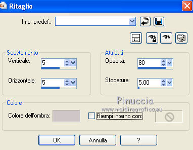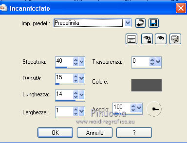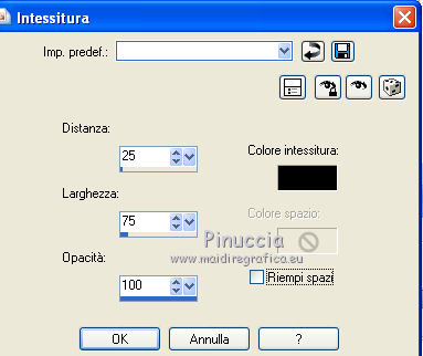 qui puoi trovare qualche risposta ai tuoi dubbi. Se l'argomento che ti interessa non è presente, ti prego di segnalarmelo. Questo tutorial è stato scritto con PSP 9. Per tradurlo, ho usato PSP X. Occorrente: Materiale qui I tubes usati per questo tutorial sono di Thaiss, Jet e Angie. Se vuoi condividere i tubes, per favore rispetta il lavoro degli autori, e lascia intatto il livello del watermark. ![]() Se non vuoi sentire la musica premi il tasto ESC Apri una nuova immagine trasparente 700 x 500 pixels. Imposta il colore di primo piano con #cfc7c7, e il colore di sfondo con #2c2c2c. Riempi l'immagine trasparente con il colore di primo piano.Effetti>Effetti di trama>Veneziana. ![]() Apri il tube T2009_angie79 e vai a Modifica>Copia. Torna al tuo lavoro e vai a Modifica>Incolla come nuovo livello. Spostalo a destra e un po' più in basso(vedi l'esempio finale) Cambia la modalità di miscelatura di questo livello in Luminanza (esistente). Apri una nuova immagine trasparente 675 x 55 pixels, e riempila con il colore di sfondo.Immagine>Aggiungi bordatura, simmetriche non selezionato. ![]() Modifica>Copia. Torna al tuo lavoro e vai a Modifica>Incolla come nuovo livello. Immagine>Ruota per gradi - 90 gradi a destra. ![]() Attiva lo strumento Bacchetta magica ![]() ![]() e clicca sullo spazio grigio per selezionarlo. Effetti>Effetti di trama>Incannicciato (nel tutorial non sono indicati i settaggi, per il mio esempio ho usato i settaggi standard). ![]() Selezione>Deseleziona. Sposta la striscia a destra contro il bordo.Di nuovo Modifica>Incolla come nuovo livello (l'immagine è ancora in memoria). Seleziona lo spazio grigio con la bacchetta magica ![]() Effetti>Effetti di trama>Intessitura. ![]() Selezione>Deseleziona. Sposta la striscia in alto contro il bordo.Livelli>Duplica. Immagine>Capovolgi. ![]() Imposta il colore di sfondo con il colore nero #000000. Apri una nuova immagine trasparente 230 x 230 pixels, e riempila con il colore nero di sfondo.Immagine>Aggiungi bordatura, 3 pixels, simmetriche selezionato, con il colore #cfc7c7. Immagine>Aggiungi bordatura, 2 pixels, simmetriche, con il colore nero #000000. Apri il tube jet-man01 e vai a Modifica>Copia. Torna al tuo lavoro e vai a Modifica>Incolla come nuovo livello. Immagine>Ridimensiona, al 50%, tutti i livelli non selezionato. ![]() Spostalo in basso.Attiva lo strumento Gomma ![]() ![]() e cancella la parte di tube sopra il bordino. ![]() Modifica>Copia. Torna al tuo lavoro e vai a Modifica>Incolla come nuovo livello. Sposta l'immagine a destra.Effetti>Effetti 3D>Sfalsa ombra. ![]() Immagine>Aggiungi bordatura, 25 pixels, simmetriche, con il colore #000000. Selezione>Seleziona tutto. Selezione>Modifica>Contrai - 25 pixels. Effetti>Effetti 3D>Ritaglio. ![]() Ripeti l'Effetto Ritaglio cambiando verticale e orizzontale con -5. Apri il tube Thais..JLLn2 e vai a Modifica>Copia. Torna al tuo lavoro e vai a Modifica>Incolla come nuovo livello. Immagine>Ridimensiona, al 90%, tutti i livelli non selezionato. Regola>Messa a fuoco>Metti a fuoco. Sposta il tube un po' più in basso.Effetti>Effetti 3D>Sfalsa ombra, con i settaggi precedenti. Immagine>Aggiungi bordatura, 1 pixel, simmetriche, con il colore #cfc7c7. Immagine>Aggiungi bordatura, 8 pixels, simmetriche, con il colore nero #000000. Immagine>Aggiungi bordatura, 1 pixel, simmetriche, con il colore #cfc7c7. Apri il file con il testo Ne me quitte pas, e vai a Modifica>Copia. Torna al tuo lavoro e vai a Modifica>Incolla come nuovo livello. Posiziona il testo nella striscia destra.Aggiungi il tuo nome e/o il tuo watermark su un nuovo livello. Livelli>Unisci>Unisci tutto e salva in formato jpg. ![]() Se hai problemi o dubbi, o trovi un link non funzionante, o anche soltanto per dirmi che ti è piaciuto, scrivimi 12 Febbraio 2012 |