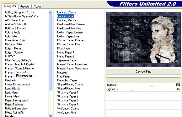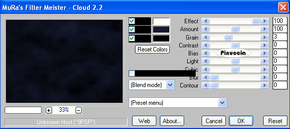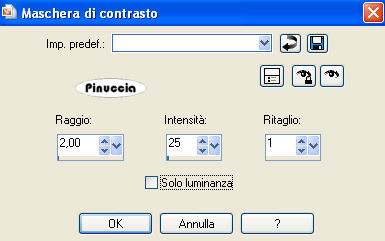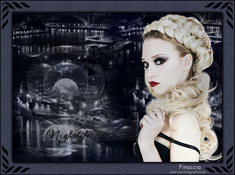 qui puoi trovare qualche risposta ai tuoi dubbi. Se l'argomento che ti interessa non è presente, ti prego di segnalarmelo. Questo tutorial è stato scritto in PSP 9, ma può essere eseguito con qualsiasi versione del programma. Occorrente: Materiale qui I tubes usati per questo tutorial sono di Nightangel, Mallu e Marion e Dieter L'angolo è di Adriana. Se vuoi condividere i tubes, per favore rispetta il lavoro degli autori, e lascia intatto il livello del watermark. (in questa pagina trovi i links ai siti dei creatori di tubes) Filtri: Filters Unlimited qui Mura's Meister qui Apri una nuova immagine trasparente 700 x 500 pixels. Imposta il colore di primo piano con #171b31, e il colore di sfondo con il nero (#000000). Effetti>Plugins>Mura's Meister - Cloud: ![]() Apri il tube autumnbeautygirl e vai a Modifica>Copia. Torna al tuo lavoro e vai a Modifica>Incolla>Incolla come nuovo livello. Sposta il tube a destra, contro il bordo.Cambia la modalità di miscelatura di questo livello in Luminanza (esistente), e abbassa l'opacità all'85%. Livelli>Duplica. Sposta il tube a sinistra:![]() Apri il tube mds8177Bubbels e vai a Modifica>Copia. Torna al tuo lavoro e vai a Modifica>Incolla>Incolla come nuovo livello. Sposta il tube in basso a sinistra,(Vedi il mio esempio). Cambia la modalità di miscelatura di questo livello in Luminanza (esistente), e abbassa l'opacità al 60%. ![]() Apri il tube Blonde_Seduction e vai a Modifica>Copia. Torna al tuo lavoro e vai a Modifica>Incolla>Incolla come nuovo livello. Immagine>Rifletti. Immagine>Ridimensiona, all'80%, tutti i livelli non selezionato. ![]() Regola>Messa a fuoco>Maschera di contrasto: ![]() Sposta il tube a destra, un po' più in basso.Livelli>Unisci>Unisci tutto. Immagine>Aggiungi bordatura, 2 pixels, simmetriche, con il colore nero. Immagine>Aggiungi bordatura, 40 pixels, simmetriche, con il colore #3e4054. Seleziona il bordo nero con la bacchetta magica ![]() ![]() Effetti>Plugins>Filters Unlimited - Paper Texture - Canvas Fine, con i settaggi standard. ![]() Selezione>Inverti. Effetti>Effetti 3D>Sfalsa ombra: ![]() Ripeti l'Effetto Sfalsa ombra, cambiando verticale e orizzontale con -3. Selezione>Nessuna selezione. Immagine>Aggiungi bordatura, 2 pixels, simmetriche, con il colore nero. Apri Corner108_AdrianaDesigns e vai a Modifica>Copia. Torna al tuo lavoro e vai a Modifica>Incolla>Incolla come nuovo livello. probabilmente, a causa dei colori scuri della tag e del tube, farai fatica a vederlo. Attivando il Puntatore potrai individuare il tube al centro della griglia dello strumento![]() passando il mouse sulla griglia, quando apparirà l'icona dello spostamento, potrai muovere l'angolo. ![]() Spostalo sul bordo in alto a sinistra.Livelli>Duplica. Immagine>Rifletti. Livelli>Unisci>Unisci giù. Livelli>Duplica. Immagine>Capovolgi. Apri il file con il testo Nightlife e vai a Modifica>Copia. Torna al tuo lavoro e vai a Modifica>Incolla>Incolla come nuovo livello. Sposta il testo dove preferisci o vedi il mio esempio.Aggiungi il tuo nome e/o il tuo watermark. Livelli>Unisci>Unisci tutto e salva in formato jpg. ![]() Se hai problemi o dubbi, o trovi un link non funzionante, o anche soltanto per dirmi che ti è piaciuto, scrivimi