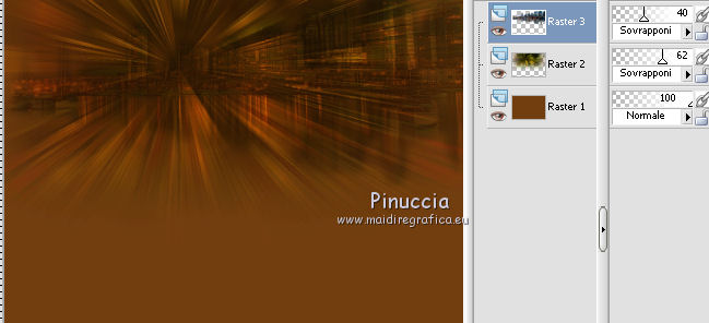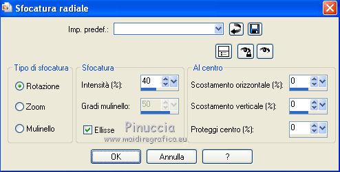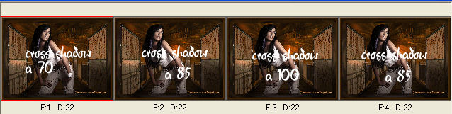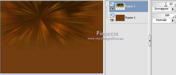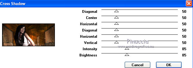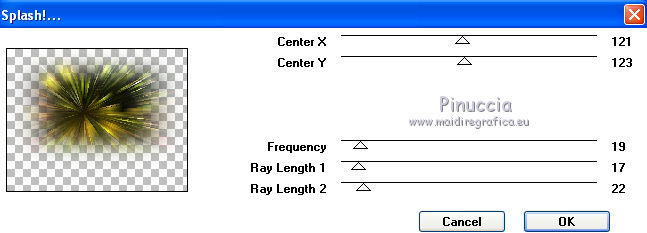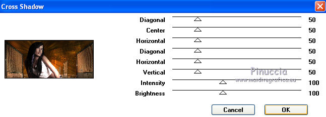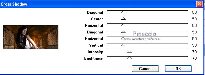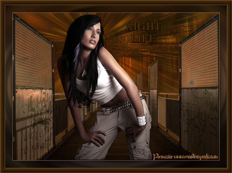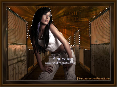 qui puoi trovare qualche risposta ai tuoi dubbi. Se l'argomento che ti interessa non è presente, ti prego di segnalarmelo. Questo tutorial è stato scritto con PSP 9. Per tradurlo, ho usato PSP X. Occorrente: Materiale qui I tubes usati sono di Jet, Guismo, Silke e LuzCristina (in questa pagina trovi i links ai loro siti). Se vuoi condividere i tubes, per favore rispetta il lavoro degli autori, e lascia intatto il livello del watermark. Filtri VM Natural qui Graphics plus qui Animation Shop qui ![]() Apri una nuova immagine trasparente 700 x 500 pixels. Imposta il colore di primo piano con #733f10. Riempi l'immagine trasparente con il colore di primo piano.Apri il tube 2897-luzcristina e vai a Modifica>Copia. Torna al tuo lavoro e vai a Modifica>Incolla come nuovo livello. Spostalo un po' più in alto.Premi il tasto D (valido per tutte le versioni di PSP), per attivare lo strumento Deformazione ![]() e allarga a destra e a sinistra il tube in modo che riempia tutta la larghezza della tela. ![]() Effetti>Plugins>VM Natural - Splash, con i settaggi standard. ![]() Cambia la modalità di miscelatura di questo livello in Sovrapponi, e abbassa l'opacità al 62%. ![]() Apri il tube SKF_Landscape115 e vai a Modifica>Copia. Torna al tuo lavoro e vai a Modifica>Incolla come nuovo livello. Immagine>Rifletti. Spostalo un po' più in alto, come nel mio esempio.Cambia la modalità di miscelatura di questo livello in Sovrapponi, e abbassa l'opacità al 40%. ![]() Apri il tube calguispasserelle25012012 e vai a Modifica>Copia. Torna al tuo lavoro e vai a Modifica>Incolla come nuovo livello. Effetti>Effetti 3D>Sfalsa ombra. ![]() Apri il tube jet-woman 2 e vai a Modifica>Copia. Torna Torna al tuo lavoro e vai a Modifica>Incolla come nuovo livello. Immagine>Rifletti. Immagine>Ridimensiona, al 75%, tutti i livelli non selezionato. ![]() Spostalo un po' più in basso a sinistra.Effetti>Effetti 3D>Sfalsa ombra, con i settaggi precedenti. Livelli>Unisci>Unisci tutto. Modifica>Copia. Immagine>Aggiungi bordatura, 1 pixel, simmetriche, con il colore #8b7b69. Immagine>Aggiungi bordatura, 25 pixels, simmetriche, con il colore nero. Attiva lo strumento Bacchetta magica ![]() ![]() e clicca nel bordo nero per selezionarlo. Livelli>Nuovo livello raster. Modifica>Incolla nella selezione. Regola>Sfocatura>Sfocatura radiale. ![]() Selezione>Deseleziona. Immagine>Aggiungi bordatura, 1 pixel, simmetriche, con il colore #8b7b69. Immagine>Aggiungi bordatura, 15 pixels, simmetriche, con il colore #3d2306. Immagine>Aggiungi bordatura, 1 pixel, simmetriche, con il colore #8b7b69. Seleziona il bordo da 15 pixels con la Bacchetta magica ![]() Effetti>Effetti 3D>Smusso a incasso. ![]() Selezione>Deseleziona. Apri il file di testo nightlife e vai a Modifica>Copia. Torna al tuo lavoro e vai a Modifica>Incolla come nuovo livello. Spostalo dove preferisci o vedi il mio esempio.Aggiungi il tuo nome e/o il tuo watermark su un nuovo livello. Livelli>Unisci>Unisci tutto. Se non vuoi realizzare l'animazione salva in formato jpg. ![]() Per l'animazione: Non unire i livelli. Attiva il livello di sfondo. Attiva lo strumento Selezione a mano libera , da punto a punto.![]() e seleziona sfondo dietro il tube della donna. ![]() Effetti>Plugins>Graphics Plus - Cross Shadow. ![]() Selezione>Deseleziona. Modifica>Copia Unione. Apri Animation Shop e vai a Modifica>Incolla>Incolla come nuova animazione. Torna in PSP. Modifica>Annulla azione Deseleziona. Modifica>Annulla azione Cross Shadow. Effetti>Plugins>Graphics Plus - Cross Shadow. ![]() Selezione>Deseleziona. Modifica>Copia unione. Torna in Animation Shop e vai a Modifica>Incolla>Incolla dopo il fotogramma corrente. Di nuovo in PSP. Modifica>Annulla azione Deseleziona. Modifica>Annulla azione Cross Shadow. Effetti>Plugins>Graphics Plus - Cross Shadow. ![]() Selezione>Deseleziona. Modifica>Copia unione. In Animation Shop vai a Modifica>Incolla>Incolla dopo il fotogramma corrente. Clicca sul secondo fotogramma per selezionarlo e vai a Modifica>Copia. Clicca sul terzo fotogramma per selezionarlo e vai a Modifica>Incolla>Incolla dopo il fotogramma corrente. Ed ecco la tua animazione composta da 4 fotogrammi. ![]() Modifica>Seleziona tutto. Animazione>Proprietà fotogramma e imposta la velocità a 22. ![]() Controlla il risultato cliccando su Visualizza e salva in formato gif.![]() Se hai problemi o dubbi, o trovi un link non funzionante, o anche soltanto per dirmi che ti è piaciuto, scrivimi 6 Marzo 2012 |
