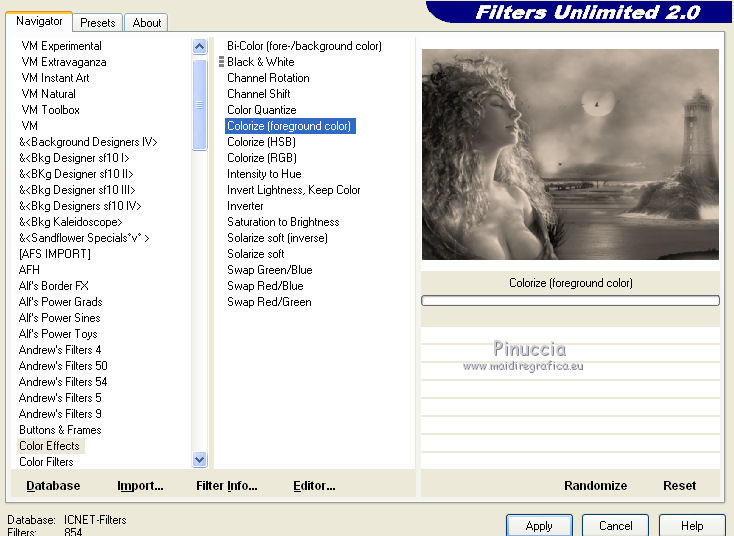 Effetti>Plugins>Filters Unlimited 2.0 - Color Effects - Colorize(foregroung color).