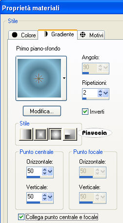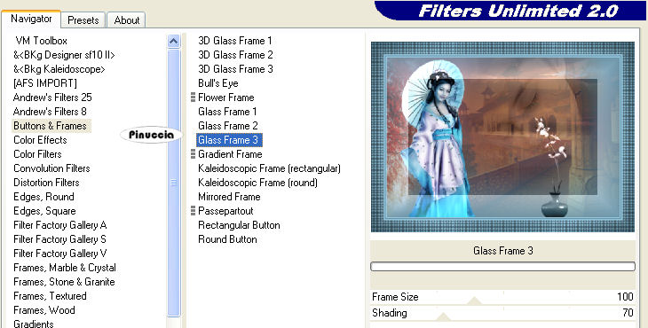 qui puoi trovare qualche risposta ai tuoi dubbi. Se l'argomento che ti interessa non è presente, ti prego di segnalarmelo. Questo tutorial è stato scritto in PSP 9, ma può essere eseguito con qualsiasi versione del programma. Occorrente: Materiale qui I tubes usati per questo tutorial sono di Angie e Jet. Se vuoi condividere i tubes, per favore rispetta il lavoro degli autori, e lascia intatto il livello del watermark. (in questa pagina trovi i links ai siti dei creatori di tubes) Filtri: Screenworks qui FM Tile Tools qui Filters Unlimited 2.0 qui Apri una nuova immagine trasparente 650 x 450 pixels. Imposta il colore di primo piano con #537d91, e il colore di sfondo con #89c0d9. Riempi l'immagine trasparente con il colore di primo piano.Livelli>Nuovo livello raster. Selezione>Seleziona tutto. Apri il tube "Paysage 33" e vai a Modifica>Copia. Torna al tuo lavoro e vai a Modifica>Incolla>Incolla nella seleizone. Selezione>Nessuna selezione. Attiva lo strumento Deformazione ![]() Puntatore , se stai usando PSP X.e "tira" il tube in alto e a sinistra. Effetti>Plugins>FM Tile Tools - Blend Emboss, con i settaggi standard. ![]() Sposta il tube un po' più a destra.![]() Cambia la modalità di miscelatura di questo livello in Luminanza (esistente), e abbassa l'opacità al 60%. Apri il tube "PAY-M2007" e vai a Modifica>Copia. Torna al tuo lavoro e vai a Modifica>Incolla>Incolla come nuovo livello. Immagine>Rifletti. Con lo strumento Deformazione ,"tira" il tube in alto e in basso, e poi spostalo a sinistra. Cambia la modalità di miscelatura di questo livello in Luminanza (Esistente), e abbassa l'opacità al 70%. ![]() Apri il tube "mc 499" e vai a Modifica>Copia. Torna al tuo lavoro e vai a Modifica>Incolla>Incolla come nuovo livello. Immagine>Rifletti. Posiziona il tube come nell'esempio.Cambia la modalità di miscelatura di questo livello in Luminanza (esistente), e abbassa l'opacità al 70%. ![]() Apri il tube "F-JLL2007", e vai a Modifica>Copia. Torna al tuo lavoro e vai a Modifica>Incolla>Incolla come nuovo livello. Immagine>Ridimensiona, al 95%, tutti i livelli non selezionato. ![]() Regola>Correzione fotografica>Rimozione disturbo fotocamera digitale. se stai usando PSP X: Regola>Rimozione disturbo fotocamera digitale. Sposta questo tube a sinistra, un po' in basso.Apri il tube "jet-flower-juli-2007", e vai a Modifica>Copia. Torna al tuo lavoro e vai a Modifica>Incolla>Incolla come nuovo livello. Immagine>Ridimensiona, al 75%, tutti i livelli non selezionato, per 3 volte. Posiziona il tube come nel mio esempio.Cambia la modalità di miscelatura di questo livello in Luminanza (esistente). ![]() Livelli>Unisci>Unisci tutto. Immagine>Aggiungi bordatura, 2 pixels, simmetriche, con il colore bianco. Seleziona questo bordo con la bacchetta magica ![]() ![]() se lo spazio limitato ti rende difficile la selezione, allarga il bordo cliccando sullo strumento zoom , o usando la rotellina del mouseRiempi la selezione con il colore di sfondo.per riempire con il colore di sfondo, devi cliccare con il tasto destro del mouse. Selezione>Nessuna selezione. Immagine>Aggiungi bordatura, 4 pixels, simmetriche, con il colore bianco. Seleziona questo bordo con la bacchetta magica ,e riempilo con il colore di primo piano.Selezione>Nessuna selezione. Immagine>Aggiungi bordatura, 2 pixels, simmetriche, con il colore bianco. Seleziona il bordo con la bacchetta magica ![]() e riempilo con il colore di sfondo.Selezione>Nessuna selezione. Passa il colore di primo piano a Gradiente di primo piano/sfondo, con i seguenti settaggi: ![]() Immagine>Aggiungi bordatura, 35 pixels, simmetriche, con il colore bianco. Seleziona questo bordo con la bacchetta magica ![]() Effetti>Plugins>Cybia - Screenworks - Graph Paper. Effetti>Plugins>Filters Unlimited 2.0 - Buttons and Frames - Glass Frame 3: ![]() Selezione>Nessuna selezione. Immagine>Aggiungi bordatura, 2 pixels, simmetriche, con il colore bianco. Seleziona questo bordo con la bacchetta magica ,e riempilo con il colore di sfondo.Selezione>Nessuna selezione. Apri il tube "Tekst orient" e vai a Modifica>Copia. Torna al tuo lavoro e vai a Modifica>Incolla>Incolla come nuovo livello. Posizionalo come nel mio esempio, o come preferisci.Eventualmente, in un nuovo livello, aggiungi il tuo nome o il tuo watermark. Livelli>Unisci>Unisci tutto. Salva in formato jpg. ![]() Se hai problemi o dubbi, o trovi un link non funzionante, o anche soltanto per dirmi che ti è piaciuto, scrivimi ![]() Le mie traduzioni sono regolarmente registrate 16 Luglio 2007 |