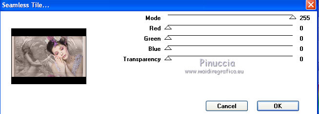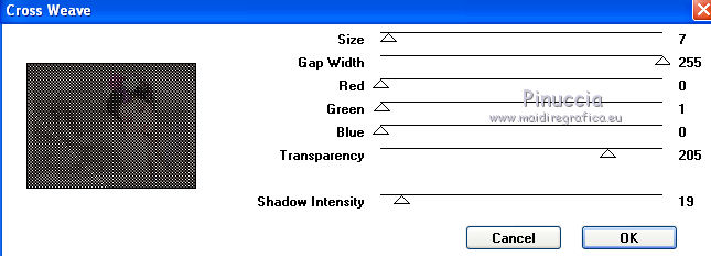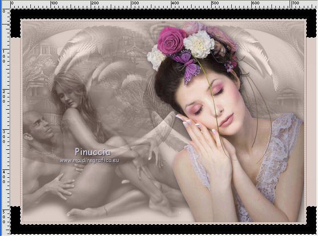 qui puoi trovare qualche risposta ai tuoi dubbi. Se l'argomento che ti interessa non è presente, ti prego di segnalarmelo. Questo tutorial è stato scritto con PSP 9. Per tradurlo, ho usato PSP X. Occorrente: Materiale qui I tubes usati per questo tutorial sono di Hanne, Mou e Silke. Se vuoi condividere i tubes, per favore rispetta il lavoro degli autori, e lascia intatto il livello del watermark. Filtri: VM Natural qui VM Toolbox qui Xero - Fritillary qui ![]() Apri una nuova immagine trasparente 700 x 500 pixels. Imposta il colore di primo piano con #dbcbc5, e il colore di sfondo con #9b8b83. Riempi l'immagine trasparente con il colore di primo piano.Apri il tube SKF_Landscape089 e vai a Modifica>Copia. Torna al tuo lavoro e vai a Modifica>Incolla come nuovo livello. Immagine>Rifletti. Immagine>Ridimensiona, al 120%, tutti i livelli non selezionato. ![]() Spostalo in alto a sinistra, come nel mio esempio.Cambia la modalità di miscelatura di questo livello in Luminanza (esistente), e abbassa l'opacità al 30%. Apri il tube SKF_Fractal099 e vai a Modifica>Copia. Torna al tuo lavoro e vai a Modifica>Incolla come nuovo livello. Spostalo in alto a destra.Cambia la modalità di miscelatura di questo livello in Luminanza (esistente), e abbassa l'opacità al 50%. ![]() Livelli>Duplica. Immagine>Rifletti. . Apri il tube mou_couple2 e vai a Modifica>Copia. Torna al tuo lavoro e vai a Modifica>Incolla come nuovo livello. Immagine>Rifletti. Spostalo in basso a sinistra.Cambia la modalità di miscelatura di questo livello in Luminanza (esistente), e abbassa l'opacità al 50%. ![]() Apri il tube H@nne-Girl36 e vai a Modifica>Copia. Torna al tuo lavoro e vai a Modifica>Incolla come nuovo livello. Immagine>Ridimensiona, all'80%, tutti i livelli non selezionato. Regola>Messa a fuoco>Metti a fuoco. Posiziona il tube come nel mio esempio.Effetti>Effetti 3D>Sfalsa ombra: ![]() Immagine>Aggiungi bordatura, 1 pixel, simmetriche, con il colore #90796c. Immagine>Aggiungi bordatura, 4 pixels, simmetriche, con il colore bianco. Seleziona questo bordo con la bacchetta magica ![]() ![]() e riempilo con il colore di primo piano.Effetti>Plugins>Xero - Fritillary, con i settaggi standard. ![]() Effetti>Effetti di bordo>Aumenta. Selezione>Deseleziona. Immagine>Aggiungi bordatura, 1 pixel, simmetriche, con il colore #90796c. Immagine>Aggiungi bordatura, 25 pixels, simmetriche, con il colore bianco. Seleziona questo bordo con la bacchetta magica ![]() e riempilo con il colore di primo piano.Effetti>Plugins>VM Toolbox - Seamless Tile. ![]() Selezione>Deseleziona. Seleziona i due bordi neri con la bacchetta magica ![]() ![]() Riempi la selezione con il colore di sfondo.Effetti>Plugins>VM Natural - Cross Weave. ![]() Effetti>Effetti 3D>Smusso a incasso. ![]() Mantieni selezionato. Livelli>Nuovo livello raster. Riempi con il colore di sfondo.Abbassa l'opacità di questo livello al 40%. Selezione>Deseleziona. Immagine>Aggiungi bordatura, 1 pixel, simmetriche, con il colore #90796c. Immagine>Aggiungi bordatura, 4 pixels, simmetriche, con il colore bianco. Seleziona questo bordo con la bacchetta magica ![]() e riempilo con il colore di primo piano.Effetti>Plugins>Xero - Fritillary, con i settaggi standard. Effetti>Effetti di bordo>Aumenta. Selezione>Deseleziona. Immagine>Aggiungi bordatura, 1 pixel, simmetriche, con il colore #90796c. Attiva lo strumento Testo e scrivi un testo a scelta.Per il mio esempio: Passion dreams. Per questo testo ho usato il font Butterfly Letters. Posiziona il testo come nel mio esempio.Aggiungi il tuo nome e/o il tuo watermark su un nuovo livello. Livelli>Unisci>Unisci tutto e salva in formato jpg. ![]() Se hai problemi o dubbi, o trovi un link non funzionante, o anche soltanto per dirmi che ti è piaciuto, scrivimi 17 Gennaio 2012 |
