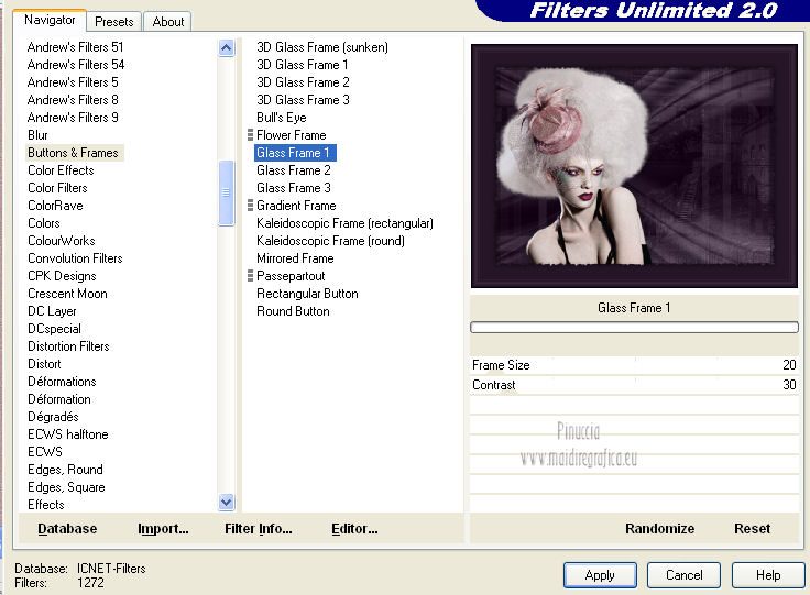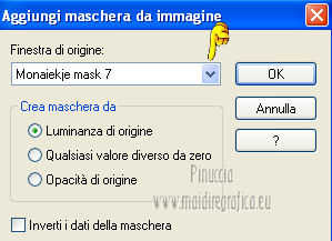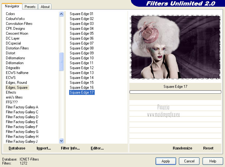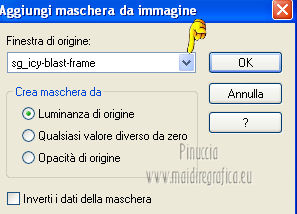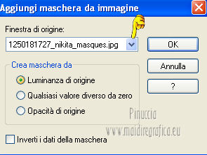 qui puoi trovare qualche risposta ai tuoi dubbi. Se l'argomento che ti interessa non è presente, ti prego di segnalarmelo. Questo tutorial è stato scritto con PSP 9. Per tradurlo, ho usato PSP X. Occorrente: Materiale qui I tubes sono di Kitty, Mou, Nikita e Roxyfloxsy. Le maschere sono di Nikita, EssexGirl e Monaiekje. (in questa pagina trovi i links ai loro siti). Se vuoi condividere i tubes, per favore rispetta il lavoro degli autori, e lascia intatto il livello del watermark. Filtri se hai problemi con i Filtri consulta la mia sezione Filtri qui Filters Unlimited 2.0 qui FM Tile Tools - Blend Emboss qui ![]() Apri le maschere in PSP e minimizzale con il resto del materiale. Imposta il colore di primo piano con #251527, e il colore di sfondo con #100012. Apri una nuova immagine trasparente 700 x 500 pixels, e riempila con il colore di primo piano.Livelli>Nuovo livello raster. Riempi con il colore di sfondo.Livelli>Nuovo livello maschera>Da immagine. Apri il menu sotto la finestra di origine e vedrai la lista dei files aperti. Seleziona la maschera monaiekje mask 7, con i seguenti settaggi: ![]() Livelli>Unisci>Unisci gruppo. Apri il tube RF-abstract 44 e vai a Modifica>Copia. Torna al tuo lavoro e vai a Modifica>Incolla come nuovo livello. Spostalo un po' più in basso.(Vedi il mio esempio). Cambia la modalità di miscelatura di questo livello in Luminanza (esistente), e abbassa l'opacità al 40%. Livelli>Duplica. Immagine>Capovolgi. Apri il tube 1250147554_paysages_nikita e vai a Modifica>Copia. Torna al tuo lavoro e vai a Modifica>Incolla come nuovo livello. Immagine>Rifletti. Effetti>Plugins>FM Tile Tools - Blend Emboss, con i settaggi standard. ![]() Spostalo un po' più in alto.(Vedi il mio esempio). Cambia la modalità di miscelatura di questo livello in Luminanza (esistente), e abbassa l'opacità al 20%. Apri il tube mou_castle e vai a Modifica>Copia. Torna al tuo lavoro e vai a Modifica>Incolla come nuovo livello. Immagine>Rifletti. Effetti>Plugins>FM Tile Tools - Blend Emboss, con i settaggi standard. Sposta il tube a destra e un po' più in alto.![]() Cambia la modalità di miscelatura di questo livello in Luminanza (esistente), e abbassa l'opacità al 34%. Imposta il colore di primo piano con #211023. Livelli>Nuovo livello raster. Riempi con il colore di primo piano.Livelli>Nuovo livello maschera>Da immagine. Apri il menu sotto la finestra di origine e seleziona la maschera sg_icy_blast_frame, con i seguenti settaggi: ![]() Livelli>Unisci>Unisci gruppo. ![]() Apri il tube kittys-blond pink e vai a Modifica>Copia. Torna al tuo lavoro e vai a Modifica>Incolla come nuovo livello. Immagine>Ridimensiona, al 60%, tutti i livelli non selezionato. ![]() Regola>Messa a fuoco>Maschera di contrasto. ![]() Sposta il tube a sinistra e un po' più in basso.Effetti>Effetti 3D>Sfalsa ombra. ![]() Livelli>Unisci>Unisci visibile. Effetti>Plugins>Filters Unlimited 2.0 - Edges Square - Square Edge 17. ![]() Modifica>Copia. Imposta il colore di primo piano con #251527, e il colore di sfondo con #3f2f43. Apri una nuova immagine trasparente 800 x 600 pixels, e riempila con il colore di primo piano.Livelli>Nuovo livello raster. Riempi con il colore di sfondo.Livelli>Nuovo livello maschera>Da immagine. Apri il menu sotto la finestra di origine e seleziona la maschera 1250181727_nikita_masques, con i seguenti settaggi: ![]() Livelli>Unisci>Unisci gruppo. Modifica>Incolla come nuovo livello ![]() Effetti>Effetti 3D>Sfalsa ombra. ![]() Ripeti l'Effetto Sfalsa ombra, cambiando verticale e orizzontale con -2. Livelli>Unisci>Unisci tutto. Effetti>Plugins>Filters Unlimited 2.0 - Buttons & Frames - Glass Frame 1. ![]() Apri il file di testo Purple fantasy e vai a Modifica>Copia. Torna al tuo lavoro e vai a Modifica>Incolla come nuovo livello. Spostalo dove preferisci, o vedi il mio esempio.Aggiungi il tuo nome e/o il tuo watermark su un nuovo livello. Livelli>Unisci>Unisci tutto e salva in formato jpg. ![]() Se hai problemi o dubbi, o trovi un link non funzionante, o anche soltanto per dirmi che ti è piaciuto, scrivimi 14 Marzo 2013 |