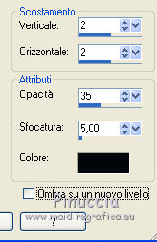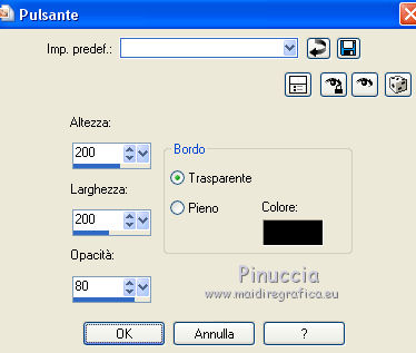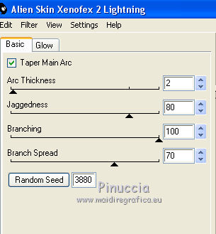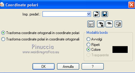 qui puoi trovare qualche risposta ai tuoi dubbi. Se l'argomento che ti interessa non è presente, ti prego di segnalarmelo. Questo tutorial è stato scritto con PSP 9. Per tradurlo, ho usato PSP X. Occorrente: Materiale qui Per i tubes grazie Syl e Claudia. (in questa pagina trovi i links ai loro siti). Se vuoi condividere i tubes, per favore rispetta il lavoro degli autori, e lascia intatto il livello del watermark. Filtri: Alien skin Xenofex 2.0 - Constellation qui ![]() Imposta il colore di primo piano con #5f0040, e il colore di sfondo con #ffffff. Apri una nuova immagine trasparente 700 x 500 pixels, e riempila con il colore di primo piano.Apri tubeclaudiaviza-paisaje254 e vai a Modifica>Copia. Torna al tuo lavoro e vai a Modifica>Incolla come nuovo livello. Cambia la modalità di miscelatura di questo livello in Sovrapponi. Livelli>Unisci>Unisci tutto. Duplica l'immagine usando la combinazione di tasti maiuscola+D e minimizza la copia. Torna al tuo lavoro. Regola>Sfocatura>Sfocatura gaussiana - raggio 25. ![]() Effetti>Effetti di distorsione>Coordinate polari. ![]() Immagine>Aggiungi bordatura, 25 pixels, simmetriche, con il colore #000000. Livelli>Nuovo livello raster. Effetti>Plugins>Alien Skin Xenofex 2.0 - Lightning. ![]() Immagine>Rifletti. Sposta l'immagine un po' più a destra.![]() Abbassa l'opacità di questo livello al 60%. Attiva l'immagine che hai minimizzato prima e vai a Modifica>Copia non chiuderla perchè ti servirà ancora Torna al tuo lavoro e vai a Modifica>Incolla come nuovo livello. Immagine>Ridimensiona, al 70%, tutti i livelli non selezionato. ![]() Selezione>Seleziona tutto. Selezione>Mobile. Selezione>Immobilizza. Livelli>Nuovo livello raster. Riempi con il colore di primo piano.Selezione>Modifica>Contrai - 1 pixel. Riempi con il colore di sfondo.Selezione>Modifica>Contrai - 2 pixels. Riempi con il colore di primo piano.Selezione>Modifica>Contrai - 1 pixel. Premi sulla tastiera il tasto CANC ![]() Selezione>Deseleziona. Livelli>Unisci>Unisci giù. Effetti>Effetti 3D>Sfalsa ombra ![]() Ripeti l'Effetto Sfalsa ombra, cambiando verticale e orizzontale con -2. Apri il tube tube SvB ( 265 ) Beauty e vai a Modifica>Copia. Torna al tuo lavoro e vai a Modifica>Incolla come nuovo livello. Immagine>Rifletti. Immagine>Ridimensiona, al 70%, tutti i livelli non selezionato. Regola>Messa a fuoco>Maschera di contrasto. ![]() Sposta il tube a sinistra e un po' più in basso.Effetti>Effetti 3D>Sfalsa ombra. ![]() Immagine>Aggiungi bordatura, 2 pixels, simmetriche, con il colore #ffffff. Immagine>Aggiungi bordatura, 50 pixels, simmetriche, con il colore #000000. Attiva lo strumento Bacchetta magica ![]() ![]() Clicca nel bordo da 50 pixels per selezionarlo. Attiva nuovamente l'immagine che hai minimizzato in precedenza. Modifica>Copia. Torna al tuo lavoro e vai a Modifica>Incolla nella selezione. Regola>Sfocatura>Sfocatura gaussiana - raggio 25. ![]() Effetti>Effetti 3D>Pulsante. ![]() Selezione>Deseleziona. Abbassa l'opacità di questo livello al 90. Aggiungi il tuo nome e/o il tuo watermark su un nuovo livello. Livelli>Unisci>Unisci tutto. Salva in formato jpg. ![]() Se hai problemi o dubbi, o trovi un link non funzionante, o anche soltanto per dirmi che ti è piaciuto, scrivimi 27 Novembre 2013 |
