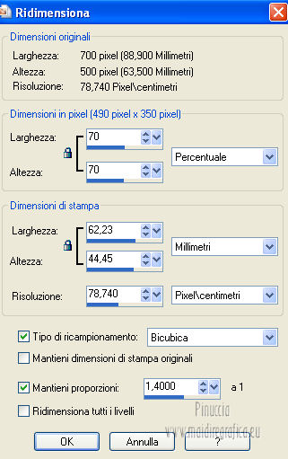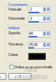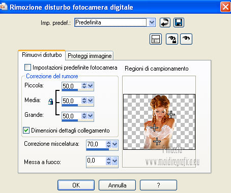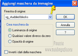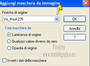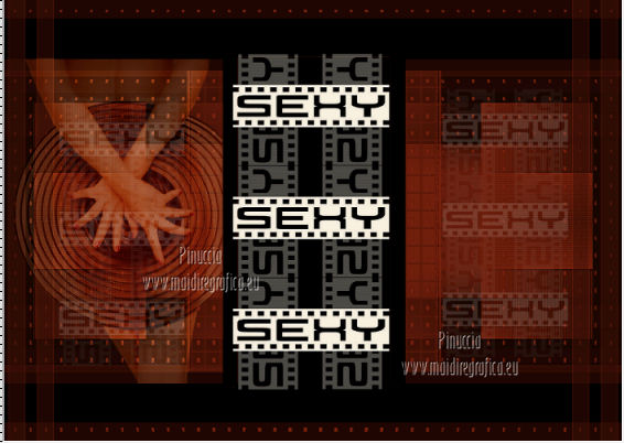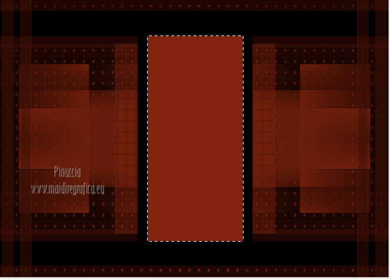 qui puoi trovare qualche risposta ai tuoi dubbi. Se l'argomento che ti interessa non è presente, ti prego di segnalarmelo. Questo tutorial è stato scritto con PSP 9. Per tradurlo, ho usato PSP X. Occorrente: Materiale qui I tubes sono di Kitty e Nikita. Le maschere sono di EssexGirl e Vix. Il tube Lace_AD è di Adriana. (in questa pagina trovi i links ai loro siti). Se vuoi condividere i tubes, per favore rispetta il lavoro degli autori, e lascia intatto il livello del watermark. ![]() Apri le maschere in PSP e minimizzale con il resto del materiale. Apri una nuova immagine trasparente 700 x 500 pixels. Imposta il colore di primo piano con #000000, e il colore di sfondo con #822510. Riempi l'immagine trasparente con il colore di primo piano.Livelli>Nuovo livello raster. Riempi con il colore di sfondo.Livelli>Nuovo livello maschera>Da immagine. Apri il menu sotto la finestra di origine e vedrai la lista dei files aperti. Seleziona la maschera sg_studded-blocks. ![]() Livelli>Unisci>Unisci gruppo. Attiva lo strumento Selezione , rettangolo![]() e seleziona il rettangolo centrale. ![]() Riempi la selezione con il colore di primo piano.Selezione>Deseleziona. Imposta il colore di primo piano con #f7f0e0. Livelli>Nuovo livello raster. Riempi con il colore di primo piano.Livelli>Nuovo livello maschera>Da immagine. Apri il menu sotto la finestra di origine e seleziona la maschera Vix_Mask235. ![]() Livelli>Unisci>Unisci gruppo. Immagine>Ridimensiona, al 70%, tutti i livelli non selezionato. ![]() Modifica>Ripeti Ridimensiona - 2 volte. Livelli>Duplica - 2 volte, e posiziona le maschere una sotto l'altra.![]() Assicurati di essere posizionato sul livello superiore. Livelli>Unisci>Unisci giù - 2 volte. Apri il tube 12930062691_femmes_nikita e vai a Modifica>Copia. Torna al tuo lavoro e vai a Modifica>Incolla come nuovo livello. Immagine>Ridimensiona, al 70%, tutti i livelli non selezionato. Sposta il tube a sinistra (vedi il mio esempio).Attiva lo strumento Selezione , rettangolo,e seleziona le parti del tube come nella schermata. ![]() Premi sulla tastiera il tasto CANC. Selezione>Deseleziona. Cambia la modalità di miscelatura di questo livello in Luce diffusa. Attiva il livello sottostante (il gruppo di maschere). Livelli>Duplica. Livelli>Disponi>Porta in alto. Immagine>Ridimensiona, all'80%, tutti i livelli non selezionato. Sposta l'immagine a sinistra.Abbassa l'opacità di questo livello al 15%. Livelli>Duplica. Sposta il duplicato a destra.![]() Immagine>Aggiungi bordatura, 1 pixel, simmetriche, con il colore nero #000000. Immagine>Aggiungi bordatura, 45 pixels, simmetriche, con il colore #671d0a. Attiva lo strumento Bacchetta magica ![]() ![]() e clicca nel bordo da 45 pixels per selezionarlo. Livelli>Nuovo livello raster. Apri Lace_AdrianaDesigns e vai a Modifica>Copia. Torna al tuo lavoro e vai a Modifica>Incolla nella selezione. Cambia la modalità di miscelatura di questo livello in Sovrapponi, e abbassa l'opacità al 40%. Effetti>Effetti di bordo>Aumenta. Mantieni selezionato. Livelli>Unisci>Unisci tutto. Selezione>Inverti. Effetti>Effetti 3D>Sfalsa ombra. ![]() Ripeti l'Effetto Sfalsa ombra, cambiando verticale e orizzontale con -3. Selezione>Deseleziona. Apri il tube Kittys-redhair-model e vai a Modifica>Copia. Torna al tuo lavoro e vai a Modifica>Incolla come nuovo livello. Immagine>Rifletti. Immagine>Ridimensiona, al 90%, tutti i livelli non selezionato. Regola>Rimozione disturbo fotocamera digitale. ![]() Regola>Messa a fuoco>Metti a fuoco. Sposta il tube in basso a destra.Effetti>Effetti 3D>Sfalsa ombra. ![]() Immagine>Aggiungi bordatura, 1 pixel, simmetriche, con il colore nero #000000. Aggiungi il tuo nome e/o il tuo watermark su un nuovo livello. Livelli>Unisci>Unisci tutto e salva in formato jpg. ![]() Se hai problemi o dubbi, o trovi un link non funzionante, o anche soltanto per dirmi che ti è piaciuto, scrivimi 21 Febbraio 2013 |