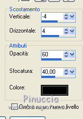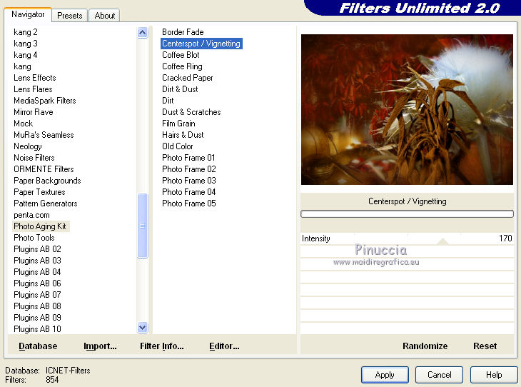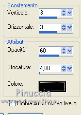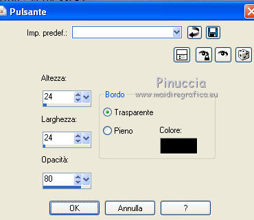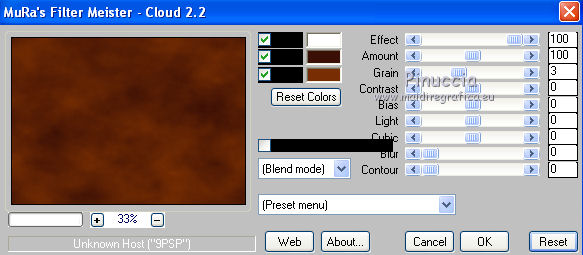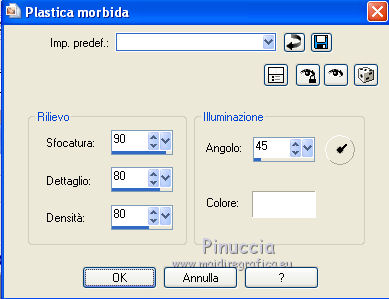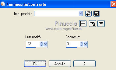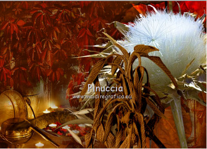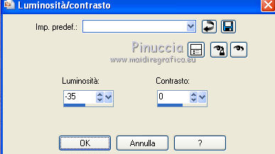 qui puoi trovare qualche risposta ai tuoi dubbi. Se l'argomento che ti interessa non è presente, ti prego di segnalarmelo. Questo tutorial è stato scritto con PSP 9. Per tradurlo, ho usato PSP X. Occorrente: Materiale qui I tubes usati per questo tutorial sono di Jet, Guismo, Heidie, Marif, Nikita e Brigitte. Se vuoi condividere i tubes, per favore rispetta il lavoro degli autori, e lascia intatto il livello del watermark. Filtri: Mura's meister - Cloud qui Filters Unlimited 2.0 qui Photo Aging kit qui ![]() Apri una nuova immagine trasparente 700 x 500 pixels. Imposta il colore di primo piano con #3b0f06, e il colore di sfondo con #782e02. Effetti>Plugins>Mura's Meister - Cloud: ![]() Apri il tube calguismistedautumne25910 e vai a Modifica>Copia. Torna al tuo lavoro e vai a Modifica>Incolla come nuovo livello. Spostalo a sinistra, come nel mio esempio.Cambia la modalità di miscelatura di questo livello in Luce netta, e abbassa l'opacità al 48%. Livelli>Duplica. Sposta il duplicato a destra.Apri il tube calguisbrancheautomne22910 e vai a Modifica>Copia. Torna al tuo lavoro e vai a Modifica>Incolla come nuovo livello. Immagine>Ridimensiona, al 70%, tutti i livelli non selezionato. Spostalo a destra, come nel mio esempio.![]() Effetti>Effetti 3D>Sfalsa ombra. ![]() Apri il tube 12283242545_divers_nikita e vai a Modifica>Copia. Torna al tuo lavoro e vai a Modifica>Incolla come nuovo livello. Spostalo nell'angolo in alto a destra.Effetti>Effetti 3D>Sfalsa ombra, con i settaggi precedenti. Cambia la modalità di miscelatura di questo livello in Sovrapponi. Apri il tube stilleven e vai a Modifica>Copia. Torna al tuo lavoro e vai a Modifica>Incolla come nuovo livello. Immagine>Ridimensiona, al 65%; tutti i livelli non selezionato. Regola>Luminosità e contrasto>Luminosità e contrasto. ![]() Sposta il tube nell'angolo in basso a sinistra.![]() Apri il tube calguisbrindille26910 e vai a Modifica>Copia. Torna al tuo lavoro e vai a Modifica>Incolla come nuovo livello. Immagine>Ridimensiona, all'85%, tutti i livelli non selezionato. Spostalo in basso, come nel mio esempio.Effetti>Effetti 3D>Sfalsa ombra, con i settaggi precedenti. Apri il tube Marif_branche010 e vai a Modifica>Copia. Torna al tuo lavoro e vai a Modifica>Incolla come nuovo livello. Immagine>Rifletti. Immagine>Ridimensiona, al 55%, tutti i livelli non selezionato. Spostalo in basso.Effetti>Effetti 3D>Sfalsa ombra, con i settaggi precedenti. Apri il tube Mtm-Plant003-Pluisbol e vai a Modifica>Copia. Torna al tuo lavoro e vai a Modifica>Incolla come nuovo livello. Spostalo a destra e un po' più in basso.Effetti>Effetti 3D>Sfalsa ombra, con i settaggi precedenti. Apri il tube Mtm_bomen 17_blad-small e vai a Modifica>Copia. Torna al tuo lavoro e vai a Modifica>Incolla come nuovo livello. Regola>Luminosità e contrasto>Luminosità e contrasto. ![]() Spostalo in basso e un po' più a destra.![]() Livelli>Unisci>Unisci tutto. Effetti>Plugins>Filters Unlimited 2.0 - Photo Aging Kit - Centerpot Vignetting. ![]() Apri il tube jet-woman8 e vai a Modifica>Copia. Torna al tuo lavoro e vai a Modifica>Incolla come nuovo livello. Immagine>Ridimensiona, al 90%, tutti i livelli non selezionato. Regola>Messa a fuoco>Metti a fuoco. Sposta il tube a destra.Effetti>Effetti 3D>Sfalsa ombra, con i settaggi precedenti. Immagine>Aggiungi bordatura, 1 pixel, simmetriche, con il colore #e7e6e4. Immagine>Aggiungi bordatura, 35 pixels, simmetriche, con il colore #3b0f06. Seleziona questo bordo con la bacchetta magica ![]() ![]() Effetti>Effetti di trama>Plastica morbida. ![]() Selezione>Inverti. Effetti>Effetti 3D>Sfalsa ombra. ![]() Ripeti l'Effetto Sfalsa ombra, cambiando verticale e orizzontale con -3. Selezione>Deseleziona. Immagine>Aggiungi bordatura, 1 pixel, simmetriche, con il colore #e7e6e4. Modifica>Copia. Immagine>Aggiungi bordatura, 20 pixels, simmetriche, con il colore nero. Seleziona questo bordo con la bacchetta magica ![]() Modifica>Incolla nella selezione. Effetti>Effetti 3D>Pulsante. ![]() Selezione>Deseleziona. Immagine>Aggiungi bordatura, 1 pixel, simmetriche, con il colore #3b0f06. Apri il file di testo She e vai a Modifica>Copia. Torna al tuo lavoro e vai a Modifica>Incolla come nuovo livello. Posiziona il resto come nel mio esempio.Aggiungi il tuo nome e/o il tuo watermark su un nuovo livello. Livelli>Unisci>Unisci tutto e salva in formato jpg. ![]() Se hai problemi o dubbi, o trovi un link non funzionante, o anche soltanto per dirmi che ti è piaciuto, scrivimi 18 Gennaio 2012 |