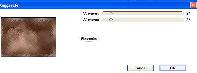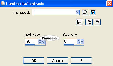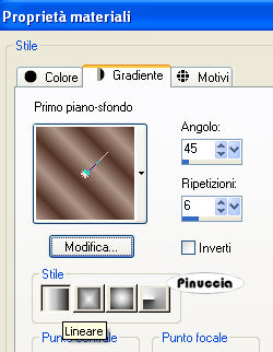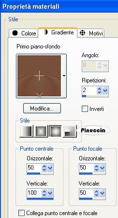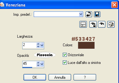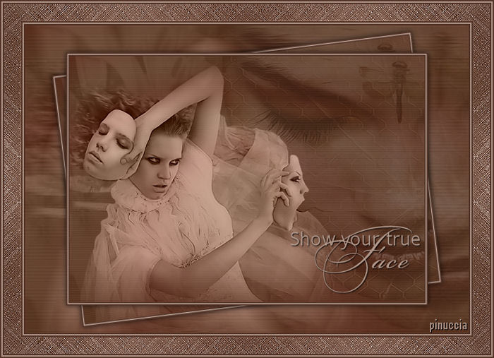 qui puoi trovare qualche risposta ai tuoi dubbi. Se l'argomento che ti interessa non è presente, ti prego di segnalarmelo. Questo tutorial è stato scritto in PSP 9, ma può essere eseguito con qualsiasi versione del programma. Occorrente: Materiale qui Se vuoi condividere i tubes, per favore rispetta il lavoro degli autori, e lascia intatto il livello del watermark. FiltrI: Xero qui Funhouse qui Simple qui Apri una nuova immagine trasparente 650 x 450 pixels. Imposta il colore di primo piano con #795a43, e il colore di sfondo con #754635. Passa il colore di primo piano a Gradiente di primo piano/sfondo, con i seguenti settaggi: ![]() Riempi l'immagine trasparente con il gradiente.Regola>Sfocatura>Sfocatura gaussiana, raggio 10. ![]() Effetti>Effetti di trama>Veneziana: ![]() Selezione>Seleziona tutto. Livelli>Nuovo livello raster. Apri il tube SKF_Face 145 e vai a Modifica>Copia. Torna al tuo lavoro e vai a Modifica>Incolla>Incolla nella selezione. Selezione>Nessuna selezione. Abbassa l'opacità di questo livello al 20%. Sposta il tube a destra.![]() Apri il tube mc3250 e vai a Modifica>Copia. Torna al tuo lavoro e vai a Modifica>Incolla>Incolla come nuovo livello. Immagine>Rifletti. Sposta il tube in alto a sinistra.Attiva lo strumento Deformazione , se stai usando PSP Xe "tira" il tube per tutta l'altezza dell'immagine. ![]() Cambia la modalità di miscelatura di questo livello in Luminanza (Esistente) e abbassa l'opacità al 16%. Apri il tube mc3061 e vai a Modifica>Copia. Torna al tuo lavoro e vai a Modifica>incolla>incolla come nuovo livello. Cambia la modalità di miscelatura di questo livello in Luminanza (esistente) e abbassa l'opacità all'80%. Spostalo a sinistra, più in basso.![]() Attiva lo strumento Gomma ![]() (dimensione 20, durezza 15, opacità 25). posizionati sul livello del fiore (raster 3), e cancella le parti del fiore sul braccio e sul viso. ![]() Livelli>Unisci>Unisci tutto. Regola>Luminosità e contrasto>Luminosità e contrasto: ![]() Effetti>Plugins>Xero - Porcelain: ![]() Duplica l'immagine con Shift+D e metti da parte la copia. Continua sull'originale Effetti>Effetti di distorsione>Vento: da sinistra, intensità 100: ![]() Imposta il colore di primo piano con #af9689, e il colore di sfondo con #533427. Immagine>Aggiungi bordatura, 2 pixels, simmetriche, con il colore bianco. Seleziona il bordo con la bacchetta magica ![]() ![]() Riempi con il colore di sfondo.Selezione>Nessuna selezione. Immagine>Aggiungi bordatura, 2 pixels, simmetriche, con il colore bianco. Seleziona il bordo con la bacchetta magica ,e riempi con il colore di primo piano.Selezione>Nessuna selezione. Immagine>Aggiungi bordatura, 2 pixels, simmetriche, con il colore bianco. Seleziona il bordo con la bacchetta magica ![]() Riempi con il colore di sfondo.Selezione>Nessuna selezione. Imposta il colore di primo piano a Gradiente di primo piano/sfondo. ![]() Immagine>Aggiungi bordatura, 25 pixels, simmetriche, con il colore bianco. Seleziona il bordo con la bacchetta magica ![]() e riempilo con questo gradiente.Effetti>Plugins>Funhouse - Xaggerate: ![]() Effetti>Plugins>Simple - 4 Way Average. Effetti>Effetti di bordo>Aumenta. Selezione>Nessuna selezione. Immagine>Aggiungi bordatura, 2 pixels, simmetriche, con il colore bianco. Seleziona il bordo con la bacchetta magica ![]() Riempi con il colore di sfondo.Selezione>Nessuna selezione. Immagine>Aggiungi bordatura, 2 pixels, simmetriche, con il colore bianco. Seleziona il bordo con la baccehtta magica ,e riempi con il colore di primo piano.Selezione>Nessuna selezione. Immagine>Aggiungi bordatura, 2 pixels, simmetriche, con il colore bianco. Seleziona il bordo con la bacchetta magica ![]() Riempi con il colore di sfondo.Selezione>Nessuna selezione. Attiva la copia che hai messo da parte prima. Immagine>Aggiungi bordatura, 2 pixels, simmetriche, con il colore bianco. Seleziona il bordo con la bacchetta magica ![]() Riempi con il colore di sfondo.Selezione>Nessuna selezione. Immagine>Aggiungi bordatura, 2 pixels, simmetriche, con il colore bianco. Seleziona il bordo con la baccehtta magica ,e riempi con il colore di primo piano.Selezione>Nessuna selezione. Immagine>Aggiungi bordatura, 2 pixels, simmetriche, con il colore bianco. Seleziona il bordo con la bacchetta magica ![]() Riempi con il colore di sfondo.Selezione>Nessuna selezione. Immagine>Ridimensiona, all'80%, ricampionamento bicubica, tutti i livelli selezionato: ![]() Modifica>Copia. Torna all'immagine più grande e vai a Modifica>Copia. Effetti>Effetti 3D>Sfalsa ombra: ![]() Ripeti l'Effetto Sfalsa ombra, ma cambiando verticale e orizzontale a -1. Livelli>Duplica. Immagine>Ruota>Ruota per gradi, 7 gradi a sinistra. ![]() Livelli>Disponi>Sposta giù. Attiva il livello superiore. Apri il file di testo: Show your true face e vai a Modifica>Copia. Torna al tuo lavoro e vai a Modifica>Incolla>Incolla come nuovo livello. Posiziona il testo come preferisci.Eventualmente, aggiungi il tuo nome in un nuovo livello. Livelli>Unisci>unisci tutto. Salva in formato jpg. ![]() Se hai problemi o dubbi, o trovi un link non funzionante, o anche soltanto per dirmi che ti è piaciuto, scrivimi