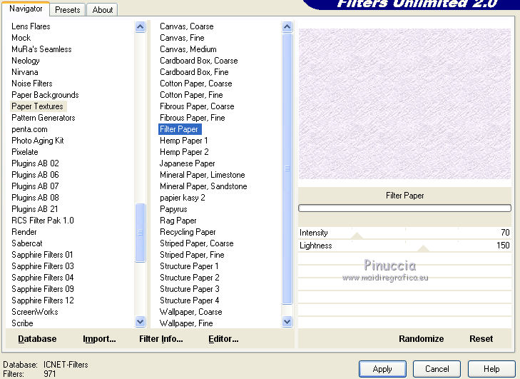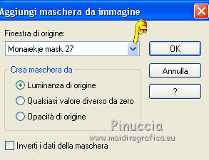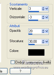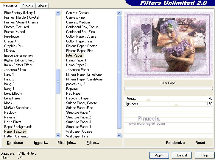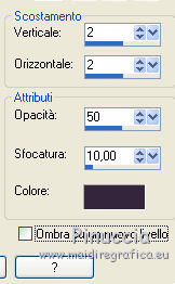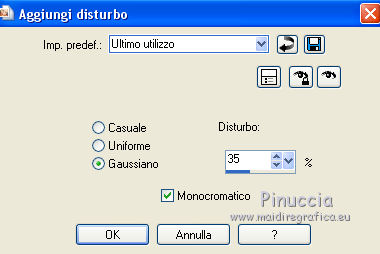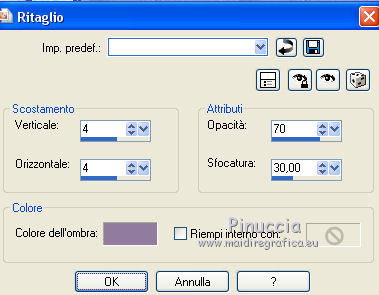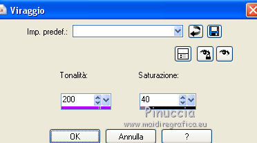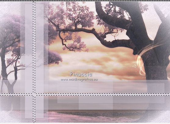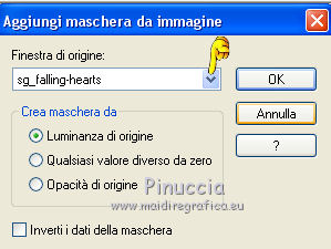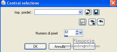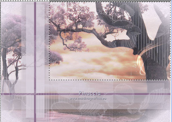 qui puoi trovare qualche risposta ai tuoi dubbi. Se l'argomento che ti interessa non è presente, ti prego di segnalarmelo. Questo tutorial è stato scritto con PSP 9. Dalla versione X4, il comando Immagine>Rifletti è stato sostituito con Immagine>Capovolgi in orizzontale, e il comando Immagine>Capovolgi con Immagine>Capovolgi in verticale. Nelle versioni X5 e X6, le funzioni sono state migliorate rendendo disponibile il menu Oggetti. Vedi la scheda sull'argomento qui Per tradurre questo tutorial ho usato PSP X. Occorrente: Materiale qui Per i tubes grazie Syl e Linda. Per le maschere grazie Monaiekje e EssexGirl. (in questa pagina trovi i links ai loro siti). Se vuoi condividere i tubes, per favore rispetta il lavoro degli autori, e lascia intatto il livello del watermark. Filtri: Filters Unlimited 2.0 qui Animation Shop qui ![]() Apri le maschere in PSP e minimizzale con il resto del materiale. Imposta il colore di primo piano con #dcd5e1, e il colore di sfondo con #8c6d8d. ![]() Apri una nuova immagine trasparente 700 x 500 pixels, e riempila con il colore di primo piano.Effetti>Plugins>Filters Unlimited 2.0 - Paper Textures - Filter Paper. ![]() Apri il tube SvB Natuur1misted, e vai a Modifica>Copia. Torna al tuo lavoro e vai a Modifica>Incolla come nuovo livello. Immagine>Rifletti. Abbassa l'opacità di questo livello all'84%. Livelli>Nuovo livello raster. Riempi con il colore di primo piano.Livelli>Nuovo livello maschera>Da immagine. Apri il menu sotto la finestra di origine e vedrai la lista dei files aperti. Seleziona la maschera Monaiekje mask 27, con i seguenti settaggi. ![]() Livelli>Unisci>Unisci gruppo. Effetti>Effetti 3D>Sfalsa ombra, colore #35263c. ![]() Attiva lo strumento Selezione , rettangolo![]() Traccia una selezione delle piccole linee, come nell'esempio. ![]() Riempi la selezione con il colore di sfondo.Selezione>Deseleziona. Livelli>Nuovo livello raster. Riempi con il colore di primo piano.Livelli>Nuovo livello maschera>Da immagine. Apri il menu sotto la finestra di origine e seleziona la maschera sg_falling-heart, con i seguenti settaggi. ![]() Livelli>Unisci>Unisci gruppo. Immagine>Rifletti. Abbassa l'opacità di questo livello al 62%. Livelli>Nuovo livello raster. Attiva nuovamente lo strumento Selezione , rettangolo,e seleziona il rettangolo in alto a destra. ![]() Attiva nuovamente il tube SvB Natuur1misted e rimani sul tube. Selezione>Seleziona tutto. Selezione>Modifica>Contrai - 100 pixels. Modifica>Copia. Torna al tuo lavoro e vai a Modifica>Incolla nella selezione. Selezione>Deseleziona. Abbassa l'opacità di questo livello al 90%. Apri il tube LF-DecoHearts-07072013 e vai a Modifica>Copia. Torna al tuo lavoro e vai a Modifica>Incolla come nuovo livello. Immagine>Rifletti. Immagine>Ridimensiona, al 60%, tutti i livelli non selezionato. ![]() Regola>Tonalità e saturazione>Viraggio. ![]() Regola>Messa a fuoco>Maschera di contrasto. ![]() Posiziona correttamente il tube.Effetti>Effetti 3D>Sfalsa ombra, colore nero. ![]() Apri il tube bwaz e vai a Modifica>Copia. Torna al tuo lavoro e vai a Modifica>Incolla come nuovo livello. Immagine>Rifletti. Immagine>Ridimensiona, al 90%, tutti i livelli non selezionato. Spostalo a destra e un po' più in basso.Regola>Messa a fuoco>Maschera di contrasto, con i settaggi precedenti. Effetti>Effetti 3D>Sfalsa ombra, con i settaggi precedenti. Aggiungi il tuo nome e/o il tuo watermark su un nuovo livello. Immagine>Aggiungi bordatura, 1 pixel, simmetriche, con il colore #927c9d. Immagine>Aggiungi bordatura, 25 pixels, simmetriche, con il colore #d1c5d1. Immagine>Aggiungi bordatura, 10 pixels, simmetriche, con il colore #927c9d. Immagine>Aggiungi bordatura, 25 pixels, simmetriche, con il colore #d1c5d1. Immagine>Aggiungi bordatura, 1 pixel, simmetriche, con il colore #927c9d. Attiva lo strumento Bacchetta magica ![]() ![]() Clicca nei due bordi da 25 pixels per selezionarli. Effetti>Plugins>Filters Unlimited 2.0 - Paper Textures - Filter Paper, con i settaggi precedenti dovrai reimpostare i settaggi, perchè Unlimited non li tiene in memoria ![]() Selezione>Seleziona tutto. Selezione>Modifica>Contrai - 61 pixels. ![]() Effetti>Effetti 3D>Ritaglio - colore #927c9d. ![]() Ripeti l'Effetto Ritaglio, cambiando verticale e orizzontale con -4. Selezione>Deseleziona. *** per l'animazione **** Seleziona il bordo da 10 pixels con la bacchetta magica ![]() Regola>Aggiungi/Rimuovi disturbo>Aggiungi disturbo. ![]() Selezione>Deseleziona. Modifica>Copia. Apri Animation Shop e vai a Modifica>Incolla>Incolla come nuova animazione. Torna in PSP. Modifica>Annulla azione Deseleziona. Modifica>Annulla azione Aggiungi disturbo. Regola>Aggiungi/Rimuovi disturbo/Aggiungi disturbo e porta il disturbo a 35. ![]() Selezione>Deseleziona. Modifica>Copia. Torna in Animation Shop e vai a Modifica>Incolla>Incolla dopo il fotogramma corrente. Di nuovo in PSP. Modifica>Annulla azione Deseleziona. Modifica>Annulla azione Aggiungi disturbo. Regola>Aggiungi/Rimuovi disturbo/Aggiungi disturbo e porta il disturbo a 45. Selezione>Deseleziona. Modifica>Copia. In Animation Shop: Modifica>Incolla>Incolla dopo il fotogramma corrente. In PSP. Modifica>Annulla azione Deseleziona. Modifica>Annulla azione Aggiungi disturbo. Regola>Aggiungi/Rimuovi disturbo/Aggiungi disturbo e riporta il disturbo a 35. Selezione>Deseleziona. Modifica>Copia. In Animation Shop: Modifica>Incolla>Incolla dopo il fotogramma corrente. Ed avrai una animazione composta da 4 fotogrammi. Modifica>Seleziona tutto. Animazione>Proprietà fotogramma, e imposta la velocità a 15. ![]() Controlla il risultato cliccando su Visualizza e salva in formato gif.![]() ![]() ![]() ![]() Se hai problemi o dubbi, o trovi un link non funzionante, o anche soltanto per dirmi che ti è piaciuto, scrivimi
