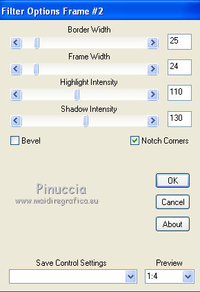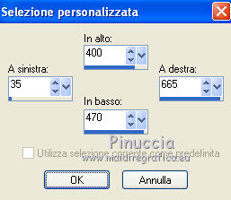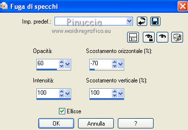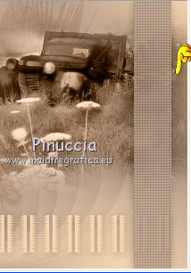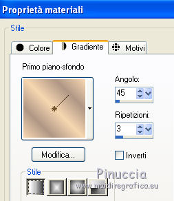 qui puoi trovare qualche risposta ai tuoi dubbi. Se l'argomento che ti interessa non è presente, ti prego di segnalarmelo. Questo tutorial è stato scritto con PSP 9. Per tradurlo, ho usato PSP X. Occorrente: Materiale qui I tubes usati per questo tutorial sono di Silke, Yvonne, Patries, Sandi e Mou. Se vuoi condividere i tubes, per favore rispetta il lavoro degli autori, e lascia intatto il livello del watermark. Filtri: Bordermania qui ![]() Apri una nuova immagine trasparente 700 x 500 pixels. Imposta il colore di primo piano con #f7d7b2, e il colore di sfondo con #af9895. Passa il colore di primo piano a Gradiente. ![]() Riempi l'immagine trasparente con il gradiente.Regola>Sfocatura>Sfocatura gaussiana - raggio 30. ![]() Effetti>Effetti di riflesso>Fuga di specchi. ![]() Apri il tube Patries_Ostrick Plume, e vai a Modifica>Copia. Torna al tuo lavoro e vai a Modifica>Incolla come nuovo livello. Spostalo contro il bordo superiore.Cambia la modalità di miscelatura di questo livello in Sovrapponi, e abbassa l'opacità al 30%. Apri il tube sKF_OldCar e vai a Modifica>Copia. Torna al tuo lavoro e vai a Modifica>Incolla come nuovo livello. Spostalo in alto a destra.Cambia la modalità di miscelatura di questo livello in Luminanza (esistente). ![]() Riporta il colore di primo piano al colore. Livelli>Nuovo livello raster. Attiva lo strumento Selezione ,clicca sull'icona Selezione personalizzata ![]() e imposta i seguenti settaggi: ![]() Riempi la selezione con il colore di primo piano.Effetti>Effetti di riflesso>Motivi. ![]() Selezione>Deseleziona. Effetti>Effetti 3D>Sfalsa ombra. ![]() Livelli>Nuovo livello raster. Selezione personalizzata ![]() ![]() Riempi la selezione con il colore di sfondo.Effetti>Plugins>Xero - Fritillary, con i settaggi standard. ![]() Effetti>Effetti di bordo>Aumenta. Selezione>Deseleziona. Effetti>Effetti 3D>Sfalsa ombra, con i settaggi precedenti. Abbassa l'opacità di questo livello all'80%. Livelli>Duplica. Immagine>Rifletti. Attiva il livello dell'auto - Raster 3. Attiva lo strumento Gomma ![]() e cancella le tracce del tube oltre la striscia. ![]() Attiva il livello superiore. Apri il tube Yvonne_vrouw_56, e vai a Modifica>Copia. Torna al tuo lavoro e vai a Modifica>Incolla come nuovo livello. Immagine>Ridimensiona, al 90%, tutti i livelli non selezionato. ![]() Regola>Messa a fuoco>Maschera di contrasto. ![]() Sposta il tube a sinistra.Effetti>Effetti 3D>Sfalsa ombra, con i settaggi precedenti. Apri il tube flora1029-Sandi. Attiva lo strumento Selezione , rettangolo,e seleziona il fiore in alto a sinistra. Modifica>Copia. Torna al tuo lavoro e vai a Modifica>Incolla come nuovo livello. Immagine>Ridimensiona, al 35%, tutti i livelli non selezionato. Regola>Messa a fuoco>Metti a fuoco. Spostalo in alto a sinistra.Effetti>Effetti 3D>Sfalsa ombra, con i settaggi precedenti. Cambia la modalità di miscelatura di questo livello in Luminanza (Esistente). Livelli>Duplica. Immagine>Rifletti. Livelli>Duplica. Immagine>Capovolgi. Apri il tube Mou_necklace e vai a Modifica>Copia. Torna al tuo lavoro e vai a Modifica>Incolla come nuovo livello. Immagine>Rifletti. Immagine>Ridimensiona, al 50%, tutti i livelli non selezionato. Regola>Messa a fuoco>Metti a fuoco. Effetti>Effetti 3D>Sfalsa ombra, con i settaggi precedenti. Spostalo in alto a sinistra sotto il fiore.Cambia la modalità di miscelatura di questo livello in Luminanza (Esistente). Livelli>Disponi>Sposta giù - 3 volte (sotto i livelli dei fiori). Attiva lo strumento Gomma e cancella la parte del tube sopra il fiore. ![]() Immagine>Aggiungi bordatura, 1 pixel, simmetriche, con il colore #f7d7b2. Immagine>Aggiungi bordatura, 20 pixels, simmetriche, con il colore #af9785. Immagine>Aggiungi bordatura, 1 pixel, simmetriche, con il colore #f7d7b2. Immagine>Aggiungi bordatura, 25 pixels, simmetriche, con il colore #af9785. Effetti>Plugins>Bordermania - Frame #2, con i settaggi standard. ![]() Apri il file di testo So long, e vai a Modifica>Copia. Torna al tuo lavoro e vai a Modifica>Incolla come nuovo livello. Posiziona il testo come nel mio esempio.Aggiungi il tuo nome e/o il tuo watermark su un nuovo livello. Livelli>Unisci>Unisci tutto e salva in formato jpg. ![]() Se hai problemi o dubbi, o trovi un link non funzionante, o anche soltanto per dirmi che ti è piaciuto, scrivimi 18 Gennaio 2012 |
