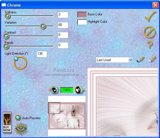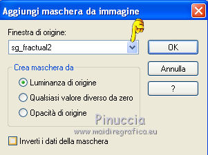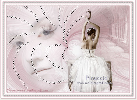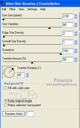 qui puoi trovare qualche risposta ai tuoi dubbi. Se l'argomento che ti interessa non è presente, ti prego di segnalarmelo. Questo tutorial è stato scritto con PSP 9. Per tradurlo, ho usato PSP X. Occorrente: Materiale qui I tubes usati sono di Nikita, Yvonne, Dieter&Marion. (in questa pagina trovi i links ai loro siti). Se vuoi condividere i tubes, per favore rispetta il lavoro degli autori, e lascia intatto il livello del watermark. Filtri Eye Candy 3.1 qui Cybia - Screenworks qui Alien Skin Xenofex 2.0 qui Animation Shop qui ![]() Apri la maschera in PSP e minimizzala con il resto del materiale. Apri una nuova immagine trasparente 700 x 500 pixels. Imposta il colore di primo piano con #f4f4f5, e il colore di sfondo con #b6818c. Riempi l'immagine trasparente con il colore di primo piano.Livelli>Nuovo livello raster. Riempi con il colore di sfondo.Livelli>Nuovo livello maschera>Da immagine. Apri il menu sotto la finestra di origine e vedrai la lista dei files aperti. Seleziona sg_fractual2 con i seguenti settaggi. ![]() Livelli>Unisci>Unisci gruppo. Apri il tube Yvonne_vrouw_149_misted e vai a Modifica>Copia. Torna al tuo lavoro e vai a Modifica>Incolla come nuovo livello. Spostalo Abbassa l'opacità di questo livello al 72% ![]() Apri il tube mds851 e vai a Modifica>Copia. Torna al tuo lavoro e vai a Modifica>Incolla come nuovo livello. Immagine>Rifletti. Immagine>Ridimensiona, al 150%, tutti i livelli non selezionato. ![]() Regola>Tonalità e saturazione>Viraggio. ![]() Regola>Luminosità e contrasto>Luminosità e contrasto. ![]() Sposta questo tube in alto a destra.Abbassa l'opacità di questo livello al 50%. ![]() Apri il tube femmes_nikita e vai a Modifica>Copia. Torna Torna al tuo lavoro e vai a Modifica>Incolla come nuovo livello. Immagine>Ridimensiona, al 70%, tutti i livelli non selezionato. Spostalo in basso a destra.![]() Effetti>Effetti 3D>Sfalsa ombra, con il colore #aa9497. ![]() Immagine>Aggiungi bordatura, 1 pixel, simmetriche, con il colore #f4f4f5. Immagine>Aggiungi bordatura, 15 pixels, simmetriche, con il colore #b6818c. Immagine>Aggiungi bordatura, 5 pixels, simmetriche, con il colore #f4f4f5. Immagine>Aggiungi bordatura, 15 pixels, simmetriche, con il colore #b6818c. Immagine>Aggiungi bordatura, 1 pixel, simmetriche, con il colore #f4f4f5. Attiva lo strumento Bacchetta magica ![]() ![]() e clicca sui due bordi rosa da 15 pixels per selezionarli. Effetti>Plugins>Eye Candy 3.1 - Chrome. ![]() Selezione>Deseleziona. Seleziona il bordo da 5 pixels con la bacchetta magica ![]() ![]() Effetti>Plugins>Cybia - Screenworks - Dot Screen. ![]() Selezione>Deseleziona. Aggiungi il tuo nome e/o il tuo watermark su un nuovo livello. Livelli>Unisci>Unisci tutto. Se non vuoi realizzare l'animazione salva in formato jpg. ![]() Per l'animazione: Attiva lo strumento Selezione a mano libera , da punto a punto.![]() e traccia delle selezioni pressappoco come nell'esempio sotto. ![]() Effetti>Plugins>Alien Skin Xenofex 2.0 - Constellation. ![]() Selezione>Deseleziona. Modifica>Copia. Apri Animation Shop e vai a Modifica>Incolla>Incolla come nuova animazione. Torna in PSP. Modifica>Annulla azione Deseleziona. Modifica>Annulla azione Constellation. Effetti>Plugins>Alien Skin Xenofex 2.0 - Constellation, clicca su Random Seed e ok. Selezione>Deseleziona. Modifica>Copia. Torna in Animation Shop e vai a Modifica>Incolla>Incolla dopo il fotogramma corrente. Di nuovo in PSP. Modifica>Annulla azione Deseleziona. Modifica>Annulla azione Constellation. Effetti>Plugins>Alien Skin Xenofex 2.0 - Constellation, clicca su Random Seed e ok. Selezione>Deseleziona. Modifica>Copia. In Animation Shop vai a Modifica>Incolla>Incolla dopo il fotogramma corrente. Ed ecco la tua animazione composta da 3 fotogrammi. Controlla il risultato cliccando su Visualizza e salva in formato gif.![]() Se hai problemi o dubbi, o trovi un link non funzionante, o anche soltanto per dirmi che ti è piaciuto, scrivimi 6 Marzo 2012 |