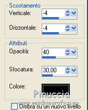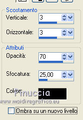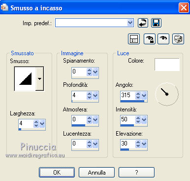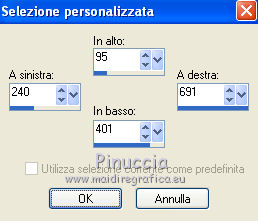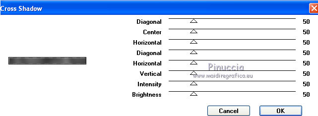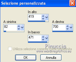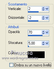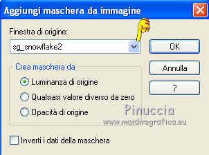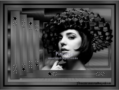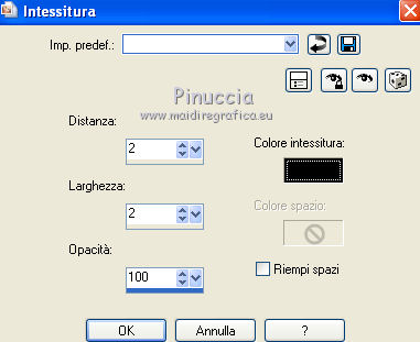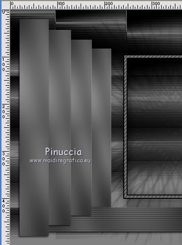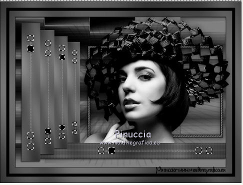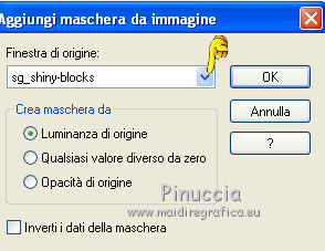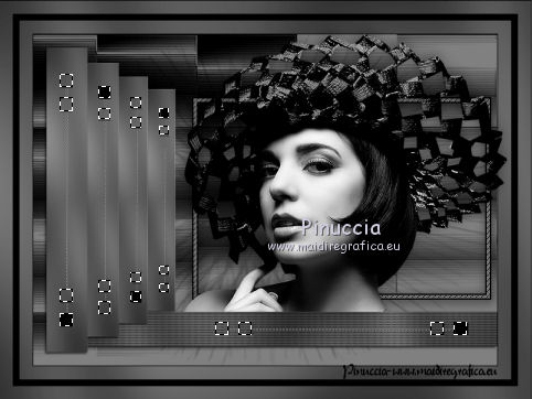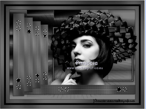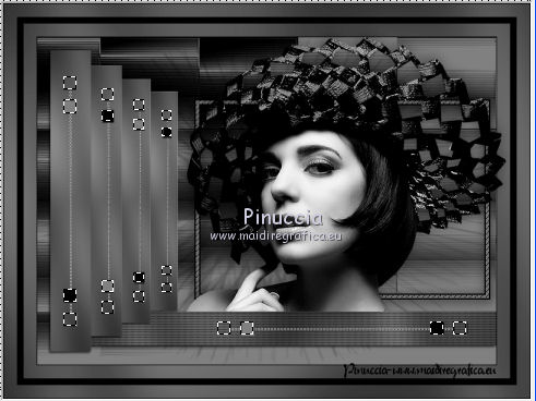 qui puoi trovare qualche risposta ai tuoi dubbi. Se l'argomento che ti interessa non è presente, ti prego di segnalarmelo. Questo tutorial è stato scritto con PSP 9. Per tradurlo, ho usato PSP X. Occorrente: Materiale qui Il tube è di Suzi Sgai. Le maschere sono di EssexGirl e Block_Style_AD e di Adriana. (in questa pagina trovi i links ai loro siti). Se vuoi condividere i tubes, per favore rispetta il lavoro degli autori, e lascia intatto il livello del watermark. Filtri Graphics Plus - Cross Shadow qui Cybia Screenworks qui Animation Shop qui ![]() Apri le maschere in PSP e minimizzale con il resto del materiale. Apri una nuova immagine trasparente 700 x 500 pixels. Imposta il colore di primo piano con #000000, e il colore di sfondo con #808080. Riempi l'immagine trasparente con il colore di primo piano.Livelli>Nuovo livello raster. Riempi con il colore di sfondo.Livelli>Nuovo livello maschera>Da immagine. Apri il menu sotto la finestra di origine e vedrai la lista dei files aperti. Seleziona la maschera sg_shinyblocks, con i seguenti settaggi: ![]() Livelli>Unisci>Unisci gruppo. Immagine>Rifletti. Livelli>Nuovo livello raster. Riempi con il colore di sfondo.Livelli>Nuovo livello maschera>Da immagine. Apri il menu sotto la finestra di origine e seleziona la maschera sg_snowflake2, con i seguenti settaggi: ![]() Livelli>Unisci>Unisci gruppo. Livelli>Nuovo livello raster. Attiva lo strumento Selezione ,clicca sull'icona Selezione personalizzata ![]() e imposta i seguenti settaggi: ![]() Riempi la selezione con il colore di sfondo.Effetti>Plugins>Graphics Plus - Cross Shadow. ![]() Effetti>Plugins>Cybia - Screenworks - seleziona Fine Rule e ok. ![]() Selezione>Deseleziona. Effetti>Effetti 3D>Sfalsa ombra. ![]() Livelli>Nuovo livello raster. Selezione personalizzata ![]() ![]() Riempi la selezione con il colore di primo piano.Selezione>Modifica>Contrai - 2 pixels. Riempi con il colore di sfondo.Selezione>Modifica>Contrai - 5 pixels. Riempi con il colore di primo piano.Selezione>Modifica>Contrai - 2 pixels. Premi sulla tastiera il tasto CANC. Selezione>Deseleziona. Attiva lo strumento Bacchetta magica ![]() ![]() e clicca sul bordo da 5 pixels per selezionarlo. Effetti>Effetti di trama>Intessitura. ![]() Selezione>Deseleziona. Effetti>Effetti 3D>Sfalsa ombra. ![]() Livelli>Nuovo livello raster. Selezione personalizzata ![]() ![]() Riempi la selezione con il colore di sfondo.Effetti>Plugins>Graphics Plus - Cross Shadow, con i settaggi precedenti. Selezione>Deseleziona. Effetti>Effetti 3D>Sfalsa ombra. ![]() ***** Livelli>Duplica. Immagine>Ridimensiona, al 90%, tutti i livelli non selezionato. ![]() Livelli>Disponi>Sposta giù. ***** Ripeti il passaggio da ***** a ***** ancora due volte, e posiziona i rettangoli come nell'esempio.(per un aiuto nel regolare le distanze, vai a Visualizza>Righelli) ![]() Immagine>Aggiungi bordatura, 1 pixel, simmetriche, con il colore nero. Immagine>Aggiungi bordatura, 20 pixels, simmetriche, con il colore #808080. Immagine>Aggiungi bordatura, 10 pixels, simmetriche, con il colore nero. Immagine>Aggiungi bordatura, 20 pixels, simmetriche, con il colore #808080. Immagine>Aggiungi bordatura, 1 pixel, simmetriche, con il colore nero. Seleziona i due bordi grigi con la bacchetta magica .Effetti>Plugins>Graphics Plus - Cross Shadow, con i settaggi precedenti. Selezione>Deseleziona. Seleziona i bordi neri con la bacchetta magica ![]() Effetti>Effetti 3D>Smusso a incasso. ![]() Selezione>Deseleziona. Apri il tube SS_716 e vai a Modifica>Copia. Torna al tuo lavoro e vai a Modifica>Incolla come nuovo livello. Immagine>Ridimensiona, all'80%, tutti i livelli non selezionato. Posiziona il tube a destra, come nel mio esempio.Effetti>Effetti 3D>Sfalsa ombra. ![]() Cambia la modalità di miscelatura di questo livello in Luminanza (esistente). Livelli>Nuovo livello raster. Selezione personalizzata ![]() ![]() Apri Block_Style_AD e vai a Modifica>Copia. Torna al tuo lavoro e vai a Modifica>Incolla nella selezione. Selezione>Deseleziona. Aggiungi il tuo nome e/o il tuo watermark su un nuovo livello. Se non vuoi realizzare l'animazione: Livelli>Unisci>Unisci tutto e salva in formato jpg. Se vuoi realizzare l'animazione, non unire i livelli, e attiva il livello dei blocchi. Attiva lo strumento Bacchetta magica ![]() e clicca su tutti i quadretti per selezionarli. Livelli>Duplica - 4 volte, in modo da avere 5 livelli con i blocchi selezionati. Attiva il primo livello. Imposta lo Strumento Riempimento in modalità Valore RGB,e riempi alcuni quadretti con il colore nero.![]() Chiudi questo livello e attiva il livello della prima copia. Riempi altri quadretti:tasto sinistro del mouse per riempire con il colore di primo piano, tasto destro per riempire con il colore di sfondo. ![]() Chiudi questo livello e attiva il livello soprastante della seconda copia, e riempi altri quadretti.![]() Chiudi il livello e ripeti il passaggio per i livelli della terza e della quarta copia. Questi i quadretti che ho riempito per il mio esempio. Terza copia ![]() Quarta copia ![]() Selezione>Deseleziona. Lascia visibile soltanto il livello originale e chiudi i livelli delle copie. Modifica>Copia Unione. Apri Animation Shop e vai a Modifica>Incolla>Incolla come nuova animazione. Torna in PSP. Chiudi il livello originale e apri il livello della prima copia. Modifica>Copia Unione. Torna in Animation Shop e vai a Modifica>Incolla>Incolla dopo il fotogramma corrente. Di nuovo in PSP. Chiudi il livello della prima copia e apri il livello della seconda copia. In Animation Shop: Modifica>Incolla>Incolla dopo il fotogramma corrente. Ripeti per i livelli della terza e della quarta copia, e alla fine avrai un'animazione composta da 5 fotogrammi. Modifica>Seleziona tutto. Animazione>Proprietà fotogramma e imposta la velocità a 30. ![]() Controlla il risultato cliccando su Visualizza e salva in formato gif.![]() Se hai problemi o dubbi, o trovi un link non funzionante, o anche soltanto per dirmi che ti è piaciut
