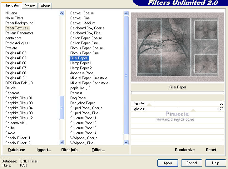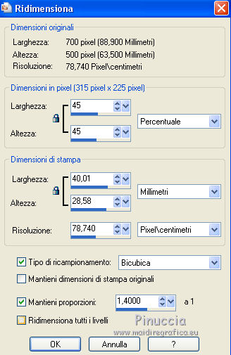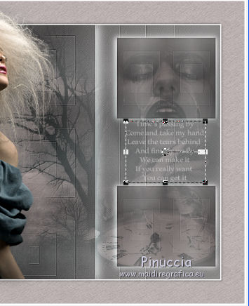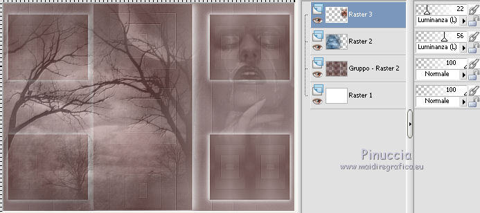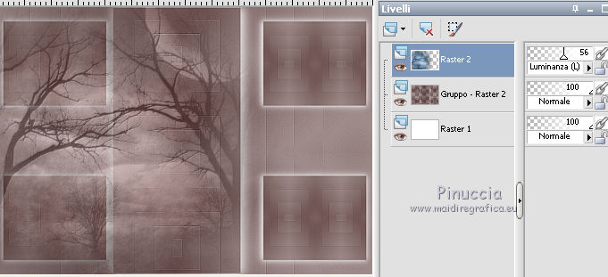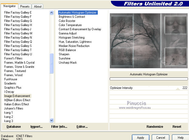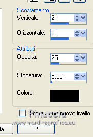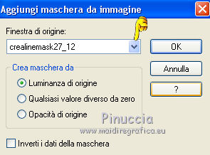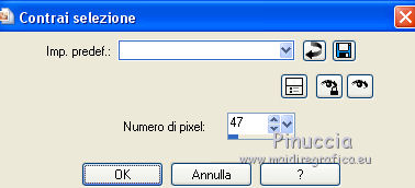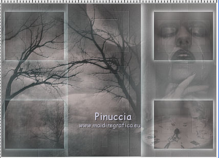 qui puoi trovare qualche risposta ai tuoi dubbi. Se l'argomento che ti interessa non è presente, ti prego di segnalarmelo. Questo tutorial è stato scritto con PSP 9. Dalla versione X4, il comando Immagine>Rifletti è stato sostituito con Immagine>Capovolgi in orizzontale, e il comando Immagine>Capovolgi con Immagine>Capovolgi in verticale. Nelle versioni X5 e X6, le funzioni sono state migliorate rendendo disponibile il menu Oggetti. Vedi la scheda sull'argomento qui Per tradurre questo tutorial ho usato PSP X. Occorrente: Materiale qui Per i tubes grazie Nikita, Gina, Silke e Silvie. Per la maschera grazie Linette. (in questa pagina trovi i links ai loro siti). Se vuoi condividere i tubes, per favore rispetta il lavoro degli autori, e lascia intatto il livello del watermark. Filtri: in caso di dubbi, ricorda di consultare la mia sezione filtri qui Filters Unlimited 2.0 qui FM Tile Tools - Blend Emboss qui ![]() Apri la maschera in PSP e minimizzala con il resto del materiale. 1. Imposta il colore di primo piano con il colore bianco #ffffff, e il colore di sfondo con #2b0300. Apri una nuova immagine trasparente 700 x 500 pixels, e riempila con il colore di primo piano.2. Livelli>Nuovo livello raster. Riempi con il colore di sfondo.3. Livelli>Nuovo livello maschera>Da immagine. Apri il menu sotto la finestra di origine e vedrai la lista dei files aperti. Seleziona la maschera crealinemask27_12, con i seguenti settaggi. ![]() Livelli>Unisci>Unisci gruppo. 4. Apri il tube Mystik_Forest_mist2, e vai a Modifica>Copia. Torna al tuo lavoro e vai a Modifica>Incolla come nuovo livello. Immagine>Rifletti. Effetti>Plugins>FM Tile Tools - Blend Emboss, con i settaggi standard. ![]() Spostalo a sinistra, e un po' più in basso.Cambia la modalità di miscelatura di questo livello in Luminanza (esistente), e abbassa l'opacità al 56%. ![]() 5. Apri il tube Femme Gina 2362 e vai a Modifica>Copia. Torna al tuo lavoro e vai a Modifica>Incolla come nuovo livello. Immagine>Ridimensiona, al 45%, tutti i livelli non selezionato. ![]() Sposta il tube in alto a destra.Cambia la modalità di miscelatura di questo livello in Luminanza (esistente), e abbassa l'opacità al 22%. ![]() 6. Apri il tube SKF_Clock 14408, e vai a Modifica>Copia. Torna al tuo lavoro e vai a Modifica>Incolla come nuovo livello. Immagine>Ridimensiona, al 45%, tutti i livelli non selezionato. Sposta il tube in basso a destra.Cambia la modalità di miscelatura di questo livello in Luminanza (esistente) e abbassa l'opacità al 22%. ![]() 7. Livelli>Unisci>Unisci tutto. Effetti>Plugins>Filters Unlimited 2.0 - Image Enhancement - Automatic Histogram Optimizer ![]() Risultato. ![]() 8. Livelli>Nuovo livello raster. Selezione>Seleziona tutto. Riempi con il colore di primo piano.Selezione>Modifica>Contrai - 2 pixels. Premi sulla tastiera il tasto CANC .Selezione>Deseleziona. 9. Immagine>Aggiungi bordatura, 45 pixels, simmetriche, colore #a99f9f. Immagine>Aggiungi bordatura, 2 pixels, simmetriche, con il colore #ffffff. 10. Attiva lo strumento Bacchetta magica ![]() ![]() Clicca nel bordo da 45 pixels per selezionarlo. 11. Effetti>Plugins>Filters Unlimited 2.0 - Paper Textures - Filter Paper. ![]() 12. Selezione>Seleziona tutto. Selezione>Modifica>Contrai - 47 pixels. ![]() 13. Effetti>Effetti 3D>Sfalsa ombra. ![]() Ripeti l'Effetto Sfalsa ombra, cambiando verticale e orizzontale con -2. Selezione>Deseleziona. 14. Apri il tube 1345816669_femmes e vai a Modifica>Copia. Torna al tuo lavoro e vai a Modifica>Incolla come nuovo livello. (cancella il watermark). Immagine>Ridimensiona, al 65%, tutti i livelli non selezionato. 15. Regola>Messa a fuoco>Maschera di contrasto. ![]() 16. Sposta il tube a sinistra sul bordo da 2 pixels.![]() 17. Effetti>Effetti 3D>Sfalsa ombra. ![]() 18. Apri il file di testo Time's passing by, e vai a Modifica>Copia. Torna al tuo lavoro e vai a Modifica>Incolla come nuovo livello. Mantieni l'opacità del livello al 48%. Spostalo a destra.![]() 19. Firma il tuo lavoro su un nuovo livello. Livelli>Unisci>Unisci tutto e salva in formato jpg. ![]() Se hai problemi o dubbi, o trovi un link non funzionante, o anche soltanto per dirmi che ti è piaciuto, scrivimi 16 Maggio 2014 |