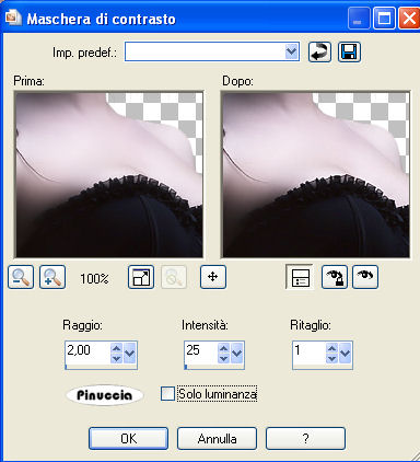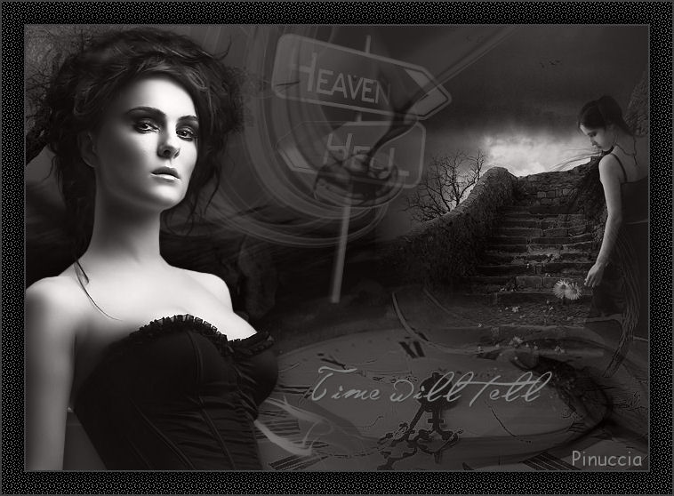 qui puoi trovare qualche risposta ai tuoi dubbi. Se l'argomento che ti interessa non è presente, ti prego di segnalarmelo. Questo tutorial è stato scritto in PSP 9, ma può essere eseguito con qualsiasi versione del programma. Occorrente: Materiale qui I tubes usati per questo tutorial sono di Jet, Marif, MarieL, Silke e Monique (in questa pagina trovi i links ai siti dei creatori di tubes) Filtri: Cybia qui Apri una nuova immagine trasparente 700 x 500 pixels. Imposta il colore di primo piano con #292525, e il colore di sfondo con #808080. Riempi l'immagine trasparente con il colore di primo piano.Apri il tube Marif_misted_paysage 074, e vai a Modifica>Copia. Torna al tuo lavoro e vai a Modifica>Incolla>incolla come nuovo livello. Immagine>Rifletti. Regola>Luminosità e contrasto>Luminosità e contrasto: ![]() Sposta il tube in alto a sinistra.(vedi il mio esempio). Cambia la modalità di miscelatura di questo livello in Luminanza (esistente). Apri il tube SKF_Your way, e vai a Modifica>Copia. Torna al tuo lavoro e vai a Modifica>Incolla>incolla come nuovo livello. Immagine>Ridimensiona, al 50%, tutti i livelli non selezionato. ![]() Regola>Luminosità e contrasto>Luminosità e contrasto, con i settaggi precedenti. Sposta il tube come nel mio esempio.![]() Cambia la modalità di miscelatura di questo livello in Luminanza (esistente), e abbassa l'opacità al 40%. Apri il tube SKF_Clock 144.08, e vai a Modifica>Copia. Torna al tuo lavoro e vai a Modifica>Incolla>incolla come nuovo livello. Regola>Luminosità e contrasto>Luminosità e contrasto, con i settaggi precedenti. Sposta il tube in basso a destra.(vedi il mio esempio). Cambia la modalità di miscelatura di questo livello in Luminanza (esistente), e abbassa l'opacità al 30%. Apri il tube MaieL_smoke 01t, e vai a Modifica>Copia. Torna al tuo lavoro e vai a Modifica>Incolla>incolla come nuovo livello. Sposta il tube in basso.Cambia la modalità di miscelatura di questo livello in Luminanza (esistente). ![]() Apri il tube Tubes by Monique42_3561, e vai a Modifica>Copia. Torna al tuo lavoro e vai a Modifica>Incolla>incolla come nuovo livello. Immagine>Rifletti. Sposta il tube a destra e un po' più in alto.Cambia la modalità di miscelatura di questo livello in Luminanza (esistente), e abbassa l'opacità all'80%. Apri il tube MarieL_smoke 02t, e vai a Modifica>Copia. Torna al tuo lavoro e vai a Modifica>Incolla>incolla come nuovo livello. Immagine>Capovolgi. Immagine>Rifletti. Sposta il tube in alto.Cambia la modalità di miscelatura di questo livello in Luminanza (esistente), e abbassa l'opacità al 70%. ![]() Apri il tube jet-woman-12april 2008, e vai a Modifica>Copia. Torna al tuo lavoro e vai a Modifica>Incolla>incolla come nuovo livello. Sposta il tube in basso a sinistra.Regola>Messa a fuoco>Maschera di contrasto: ![]() Effetti>Effetti 3D>Sfalsa ombra: ![]() Cambia la modalità di miscelatura di questo livello in Luminanza (esistente). Immagine>Aggiungi bordatura, 2 pixels, simmetriche, con il colore #404040. Immagine>Aggiungi bordatura, 26 pixels, simmetriche, con il colore bianco. Seleziona questo bordo con la bacchetta magica ![]() ![]() Riempi la selezione con il colore di sfondo.Effetti>Plugins>Cybia - Screenworks - Dense Net. ![]() Selezione>Inverti. Effetti>effetti 3D>Sfalsa ombra: ![]() Ripeti l'Effetto Sfalsa ombra, ma cambiando verticale e orizzontale con -3. Selezione>Nessuna selezione. Immagine>Aggiungi bordatura, 2 pixels, simmetriche, con il colore #404040. Apri il file di testo: Time will tell e vai a Modifica>Copia. Torna al tuo lavoro e vai a Modifica>Incolla>Incolla come nuovo livello. Posiziona il testo come nel mio esempio.Aggiungi il tuo nome e/o il tuo watermark su un nuovo livello. Livelli>Unisci>Unisci tutto, e salva in formato jpg. ![]() Se hai problemi o dubbi, o trovi un link non funzionante, o anche soltanto per un saluto, scrivimi 1 Maggio 2008 Le mie traduzioni sono regolarmente registrate |