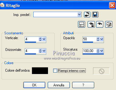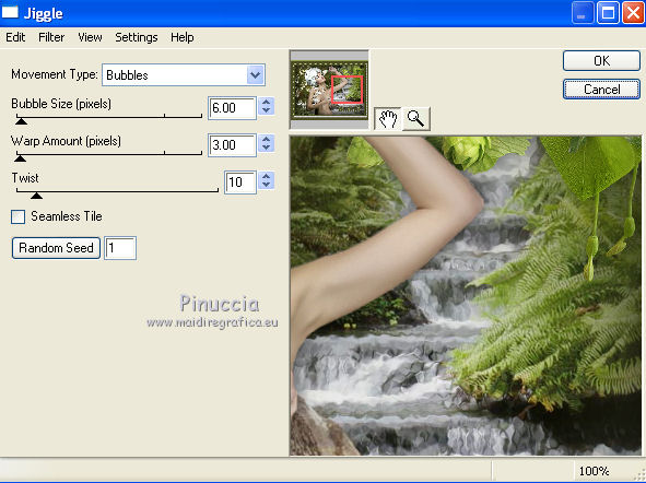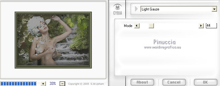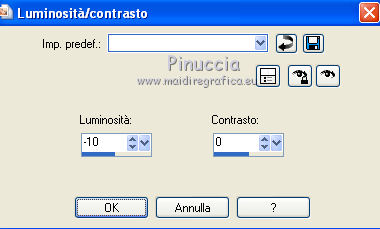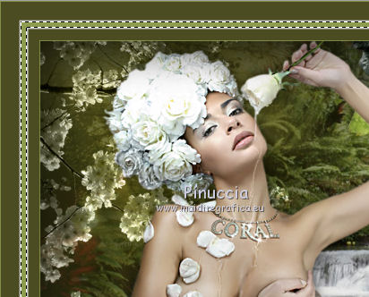 qui puoi trovare qualche risposta ai tuoi dubbi. Se l'argomento che ti interessa non è presente, ti prego di segnalarmelo. Questo tutorial è stato scritto con PSP 9. Per tradurlo, ho usato PSP X. Occorrente: Materiale qui I tubes usati sono di Angie, Guismo, Nikita, Hanne e Yoka. (in questa pagina trovi i links ai loro siti). Se vuoi condividere i tubes, per favore rispetta il lavoro degli autori, e lascia intatto il livello del watermark. Filtri Eye Candy 4000 - Jiggle qui Cybia - Screenworks qui Animation Shop qui ![]() Apri una nuova immagine trasparente 700 x 500 pixels. Imposta il colore di primo piano con #4b4c22. Riempi l'immagine trasparente con il colore di primo piano.Apri il tube T2009_angie346 e vai a Modifica>Copia. Torna al tuo lavoro e vai a Modifica>Incolla come nuovo livello. Immagine>Rifletti. Regola>Luminosità e contrasto>Luminosità e contrasto. ![]() Spostalo in alto a sinistra.Cambia la modalità di miscelatura di questo livello in Luce diffusa. ![]() Apri il tube calguismistcascade270510 e vai a Modifica>Copia. Torna al tuo lavoro e vai a Modifica>Incolla come nuovo livello. Regola>Luminosità e contrasto>Luminosità e contrasto, con i settaggi precedenti. Spostalo un po' più a destra e in basso.![]() Apri il tube 12206401737_fleurs e vai a Modifica>Copia. Torna Torna al tuo lavoro e vai a Modifica>Incolla come nuovo livello. Immagine>Capovolgi. Immagine>Ridimensiona, all'80%, tutti i livelli non selezionato. ![]() Spostalo in alto a sinistra.Effetti>Effetti 3D>Sfalsa ombra. ![]() Cambia la modalità di miscelatura di questo livello in Luminanza (esistente). ![]() Apri il tube Yoka-Planten-209308 e vai a Modifica>Copia. Torna al tuo lavoro e vai a Modifica>Incolla come nuovo livello. Immagine>Ridimensiona, 2 volte al 55%, tutti i livelli non selezionato. Sposta questo tube in alto a destra.Effetti>Effetti 3D>Sfalsa ombra, con i settaggi precedenti. Apri il tube Hanne-Flowers-May e vai a Modifica>Copia. Torna al tuo lavoro e vai a Modifica>Incolla come nuovo livello. Immagine>Ridimensiona, 2 volte al 60%, tutti i livelli non selezionato. Sposta questo tube in alto a destra, sopra il tube precedente.Effetti>Effetti 3D>Sfalsa ombra, con i settaggi precedenti. ![]() Apri il tube T2009_angie198 e vai a Modifica>Copia. Torna al tuo lavoro e vai a Modifica>Incolla come nuovo livello. Regola>Messa a fuoco>Maschera di contrasto - 2 volte con i seguenti settaggi. ![]() Sposta il tube in alto a sinistra.![]() Effetti>Effetti 3D>Sfalsa ombra, con i settaggi precedenti. Immagine>Aggiungi bordatura, 1 pixel, simmetriche, con il colore #8e9c4f. Immagine>Aggiungi bordatura, 15 pixels, simmetriche, con il colore #4b4c22. Immagine>Aggiungi bordatura, 2 pixels, simmetriche, con il colore #c5c7c2. Immagine>Aggiungi bordatura, 8 pixels, simmetriche, con il colore #8e9c4f. Immagine>Aggiungi bordatura, 2 pixels, simmetriche, con il colore #c5c7c2. Immagine>Aggiungi bordatura, 25 pixels, simmetriche, con il colore #4b4c22. Immagine>Aggiungi bordatura, 1 pixel, simmetriche, con il colore #8e9c4f. Selezione>Seleziona tutto. Selezione>Modifica>Contrai - 54 pixels. Effetti>Effetti 3D>Ritaglio. ![]() Ripeti l'Effetto Ritaglio, cambiando verticale e orizzontale con -4. Selezione>Deseleziona. Attiva lo strumento Bacchetta magica ![]() ![]() e clicca sul bordo chiaro da 8 pixels per selezionarlo. ![]() Effetti>Plugins>Cybia - Screenworks - Light Gauze. ![]() Selezione>Deseleziona. Apri il file di testo Waterfall e vai a Modifica>Copia. Torna al tuo lavoro e vai a Modifica>Incolla come nuovo livello. Posiziona il testo dove preferisci, o vedi il mio esempio.Aggiungi il tuo nome e/o il tuo watermark su un nuovo livello. Livelli>Unisci>Unisci tutto. Se non vuoi realizzare l'animazione salva in formato jpg. ![]() Per l'animazione: Non unire i livelli. Attiva il livello di sfondo. Attiva lo strumento Selezione a mano libera , da punto a punto.![]() e seleziona la parte della cascata che deve animarsi. ![]() Effetti>Plugins>Eye Candy 4000 - Jiggle. ![]() Selezione>Deseleziona. Modifica>Copia Unione. Apri Animation Shop e vai a Modifica>Incolla>Incolla come nuova animazione. Torna in PSP. Modifica>Annulla azione Deseleziona. Modifica>Annulla azione Jiggle. Effetti>Plugins>Eye Candy 4000 - Jiggle, clicca su Random Seed e ok. Selezione>Deseleziona. Modifica>Copia Unione. Torna in Animation Shop e vai a Modifica>Incolla>Incolla dopo il fotogramma corrente. Di nuovo in PSP. Modifica>Annulla azione Deseleziona. Modifica>Annulla azione Jiggle. Effetti>Plugins>Eye Candy 4000 - Jiggle, clicca su Random Seed e ok. Selezione>Deseleziona. Modifica>Copia Unione. In Animation Shop vai a Modifica>Incolla>Incolla dopo il fotogramma corrente. Ed ecco la tua animazione composta da 3 fotogrammi. Modifica>Seleziona tutto. Animazione>Proprietà fotogramma e imposta la velocità a 35. ![]() Controlla il risultato cliccando su Visualizza e salva in formato gif.![]() Se hai problemi o dubbi, o trovi un link non funzionante, o anche soltanto per dirmi che ti è piaciuto, scrivimi 6 Marzo 2012 |
