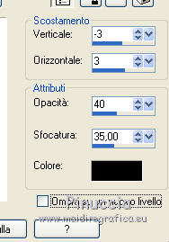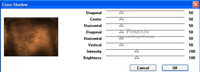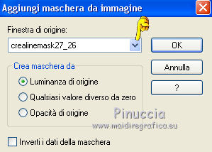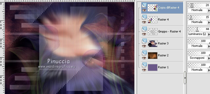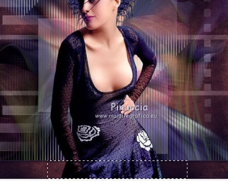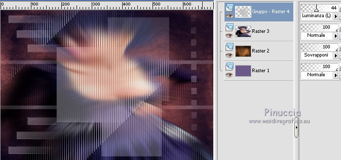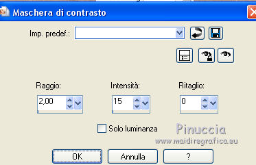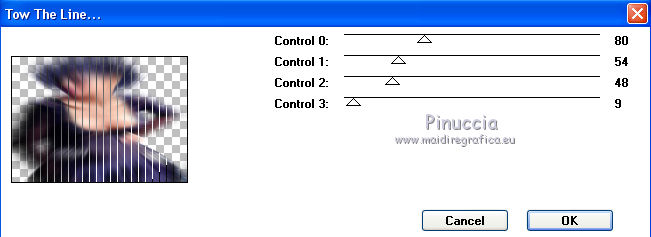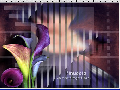 qui puoi trovare qualche risposta ai tuoi dubbi. Se l'argomento che ti interessa non è presente, ti prego di segnalarmelo. Questo tutorial è stato scritto con PSP 9. Dalla versione X4, il comando Immagine>Rifletti è stato sostituito con Immagine>Capovolgi in orizzontale, e il comando Immagine>Capovolgi con Immagine>Capovolgi in verticale. Nelle versioni X5 e X6, le funzioni sono state migliorate rendendo disponibile il menu Oggetti. Vedi la scheda sull'argomento qui Per tradurre questo tutorial ho usato PSP X. Occorrente: Materiale qui I tubes sono di Gerry e Nikita. La maschera è di Linette. L'immagine di sfondo di Ko. (in questa pagina trovi i links ai loro siti). Se vuoi condividere i tubes, per favore rispetta il lavoro degli autori, e lascia intatto il livello del watermark. Filtri: in caso di dubbi, ricorda di consultare la mia sezione filtri qui Filters Unlimited 2.0 qui Graphics Plus - Cross Shadow qui Andrew's Filters 8 - Tow the line qui I filtri Graphics Plus e Andrew's Filters si possono usare da soli o importati in Filters Unlimited (come fare vedi qui) Se un filtro fornito appare con questa icona ![]() Apri la maschera in PSP e minimizzala con il resto del materiale. 1. Imposta il colore di primo piano con #6b598a, e il colore di sfondo con #c0c0c0. Apri una nuova immagine trasparente 700 x 500 pixels, e riempila con il colore di primo piano.2. Livelli>Nuovo livello raster. Selezione>Seleziona tutto. 3. Apri Ko-2-12-2011-7, e vai a Modifica>Copia. non chiudere l'immagine perchè ti servirà ancora Torna al tuo lavoro e vai a Modifica>Incolla nella selezione. 4. Effetti>Plugins>Graphics Plus - Cross Shadow. ![]() Cambia la modalità di miscelatura di questo livello in Sovrapponi. Mantieni selezionato. 5. Livelli>Nuovo livello raster. Apri il tube Gerry-Lady47, e vai a Modifica>Copia. non chiuderlo perchè ti servirà ancora Torna al tuo lavoro e vai a Modifica>Incolla nella selezione. 6. Regola>Sfocatura>Sfocatura radiale. ![]() 7. Efetti>Plugins>Andrew's filter 8 - Tow The Line, con i settaggi standard. ![]() se non trovi l'effetto nella lista del filtro, vuol dire che hai precedentemente aggiunto ai Percorsi Files, il filtro Tramage che contiene un effetto con lo stesso nome, e che ha "conquistato" la precedenza sull'effetto di Andrew's. Se vuoi usare il filtro in Andrews, devi rimuovere dai Percorsi il filtro Tramages. Altrimenti puoi usare l'effetto contenuto in Tramages, poiché il risultato è lo stesso. Selezione>Deseleziona. 8. Livelli>Nuovo livello raster. Riempi con il colore di sfondo.Livelli>Nuovo livello maschera>Da immagine. Apri il menu sotto la finestra di origine e vedrai la lista dei files aperti. Seleziona la maschera crealinemask27_26, con i seguenti settaggi. ![]() Livelli>Unisci>Unisci gruppo. 9. Cambia la modalità di miscelatura di questo livello in Luminanza (esistente) e abbassa l'opacità al 44%. ![]() 10. Apri il tube 12930417432_fleurs_nikita, e vai a Modifica>Copia. Torna al tuo lavoro e vai a Modifica>Incolla come nuovo livello. Immagine>Ridimensiona, al 75%, tutti i livelli non selezionato. ![]() Sposta il tube in basso a sinistra.![]() Abbassa l'opacità di questo livello al 15%. 11. Livelli>Duplica. Sposta questo tube in alto a destra.Aumenta l'opacità del livello al 20%. ![]() 12. Immagine>Aggiungi bordatura, 2 pixels, simmetriche, con il colore #352945. Immagine>Aggiungi bordatura, 45 pixels, simmetriche, con il colore #6b598a. Immagine>Aggiungi bordatura, 2 pixels, simmetriche, con il colore #352945. 13. Attiva lo strumento Bacchetta magica ![]() ![]() Clicca nel bordo da 45 pixels, per selezionarlo. 14. Livelli>Nuovo livello raster. Attiva nuovamente Ko-2-12-2011-7, e vai a Modifica>Copia. Torna al tuo lavoro e vai a Modifica>Incolla nella selezione. 15. Effetti>Plugins>Graphics Plus - Cross Shadow, con i settaggi precedenti. Cambia la modalità di miscelatura di questo livello in Sovrapponi. 16. Selezione>Seleziona tutto. Selezione>Modifica>Contrai - 47 pixels. 17. Effetti>Effetti 3D>Sfalsa ombra. ![]() Ripeti l'Effetto Sfalsa ombra, cambiando verticale e orizzontale con -2. Selezione>Deseleziona. 18. Apri il tube Gerry-Lady47, e vai a Modifica>Copia. Torna al tuo lavoro e vai a Modifica>Incolla come nuovo livello. Immagine>Ridimensiona, al 90%, tutti i livelli non selezionato. Sposta il tube un po' più a destra e in basso.19. Attva lo strumento Selezione , rettangolo,e traccia una selezione nella parte del tube sotto il bordo. ![]() Premi sulla tastiera il tasto CANC ![]() Selezione>Deseleziona. 20. Regola>Messa a fuoco>Maschera di contrasto. ![]() 21. Effetti>Effetti 3D>Sfalsa ombra. ![]() 22. Firma il tuo lavoro su un nuovo livello. Livelli>Unisci>Unisci tutto e salva in formato jpg. ![]() Le vostre versioni. ![]() P@uline ![]() Se hai problemi o dubbi, o trovi un link non funzionante, o anche soltanto per dirmi che ti è piaciuto, scrivimi 25 Maggio 2014 |