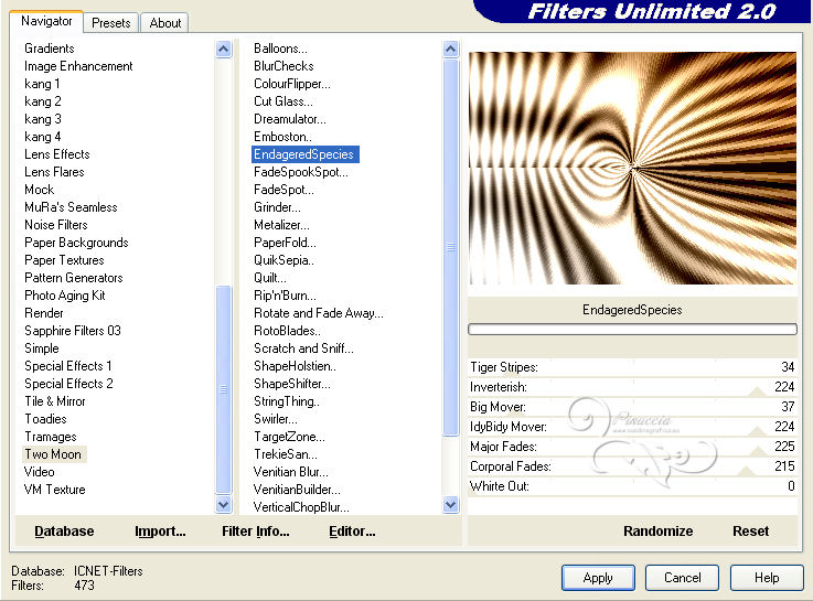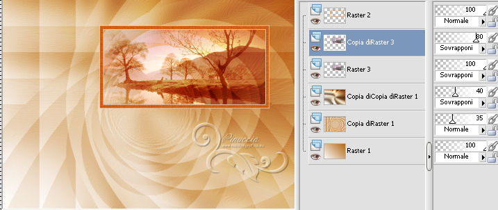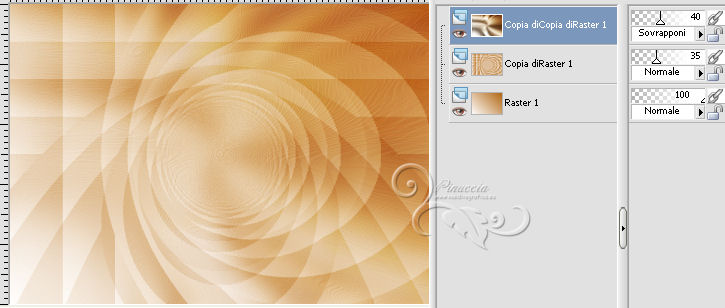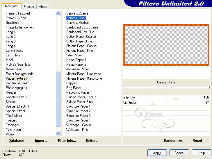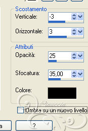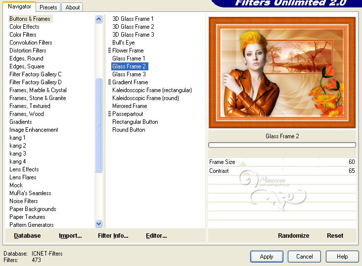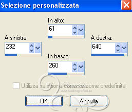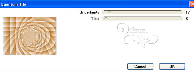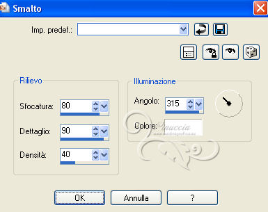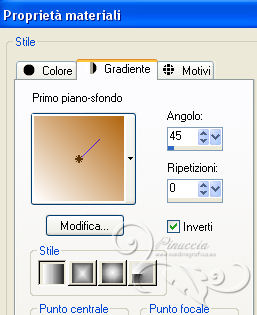 qui puoi trovare qualche risposta ai tuoi dubbi. Se l'argomento che ti interessa non è presente, ti prego di segnalarmelo. Questo tutorial è stato scritto con PSP 9, ma può essere eseguito anche con le altre versioni di PSP, a volte con qualche aggiustamento. Per chi usa X4 e X5 vedi la scheda sulla funzione Rifletti/Capovolgi qui Per tradurre il tutorial, ho usato PSP X. Occorrente: Materiale qui I tubes sono di Kitty, Yoka e Angie (in questa pagina trovi i links ai loro siti). Se vuoi condividere i tubes, per favore rispetta il lavoro degli autori, e lascia intatto il livello del watermark. Filtri se hai problemi con i Filtri consulta la mia sezione Filtri qui Filters Unlimited 2.0 qui Funhouse qui Two Moon qui I filtri Funhouse e Two Moon si possono usare da soli o importati in Filters Unlimited. (come fare vedi qui). Se un filtro fornito appare con questa icona ![]() Imposta il colore di primo piano con il colore bianco #b1650f, e il colore di sfondo con #ffffff. Passa il colore di primo piano a Gradiente di primo piano/sfondo, stile Lineare. ![]() Apri una nuova immagine trasparente 700 x 500 pixels, e riempila con il gradiente.Livelli>Duplica - 2 volte. Chiudi il livello superiore, e attiva il livello sottostante della prima copia. Effetti>Plugins>Funhouse - Quantum Tile. ![]() Abbassa l'opacità di questo livello al 35%. Apri e attiva il livello superiore. Effetti>Plugins>Filters Unlimited 2.0 - Two Moon - Endagered Species. ![]() Effetti>Effetti artistici>Smalto. ![]() Cambia la modalità di miscelatura di questo livello in Sovrapponi e abbassa l'opacità al 40%. ![]() Imposta il colore di primo piano con #d36416, e il colore di sfondo con #f4eee6. Livelli>Nuovo livello raster. Attiva lo strumento Selezione ,clicca sull'icona Selezione personalizzata ![]() e imposta i seguenti settaggi: ![]() Riempi la selezione con il colore di sfondo.Selezione>Modifica>Contrai - 1 pixel. Riempi con il colore di primo piano.Selezione>Modifica>Contrai - 8 pixels. Riempi con il colore di sfondo.Selezione>Modifica>Contrai - 1 pixel. Premi sulla tastiera il tasto CANC ![]() Selezione>Deseleziona. Attiva lo strumento Bacchetta magica ![]() ![]() e clicca nel bordo da 8 pixels per selezionarlo. Effetti>Plugins>Filters Unlimited 2.0 - Paper Textures - Canvas,Fine. ![]() Apri il tube PAY-M2007 e vai a Modifica>Copia. Torna al tuo lavoro e vai a Modifica>Incolla come nuovo livello. Immagine>Rifletti. Immagine>Ridimensiona, all'80%, tutti i livelli non selezionato. ![]() Livelli>Disponi>Sposta giù. Posiziona il tube nell'area del riquadro.(vedi il mio esempio). Attiva lo strumento Gomma ![]() e cancella la parte del tube all'esterno della cornice. ![]() Cambia la modalità di miscelatura di questo livello in Sovrapponi. Livelli>Duplica, e abbassa l'opacità all'80%. ![]() Attiva il livello superiore. Apri il tube kitty-yelowhear e vai a Modifica>Copia. Torna al tuo lavoro e vai a Modifica>Incolla come nuovo livello. Immagine>Ridimensiona, all'85%, tutti i livelli non selezionato. Regola>Messa a fuoco>Maschera di contrasto. ![]() Sposta il tube a sinistra e un po' più in basso.Effetti>Effetti 3D>Sfalsa ombra. ![]() Apri il tube Yoka-Flowers_Poppies e vai a Modifica>Copia. Torna al tuo lavoro e vai a Modifica>Incolla come nuovo livello. Immagine>Ridimensiona, al 70%, tutti i livelli non selezionato. Regola>Messa a fuoco>Maschera di contrasto, con i settaggi precedenti. Effetti>Effetti 3D>Sfalsa ombra, con i settaggi precedenti. Livelli>Duplica. Immagine>Rifletti. Immagine>Ridimensiona, all'85%, tutti i livelli non selezionato. Posiziona i due tubes nell'angolo in basso a destra.![]() Immagine>Aggiungi bordatura, 1 pixel, simmetriche, con il colore #f4eee6. Immagine>Aggiungi bordatura, 20 pixels, simmetriche, con il colore #d36416. Immagine>Aggiungi bordatura, 5 pixels, simmetriche, con il colore #f4eee6. Immagine>Aggiungi bordatura, 40 pixels, simmetriche, con il colore #d36416. Immagine>Aggiungi bordatura, 1 pixel, simmetriche, con il colore #f4eee6. Seleziona i due bordi da 20 e 40 pixels con la bacchetta magica ![]() Effetti>Plugins>Filters Unlimited 2.0 - Paper Textures - Canvas,Fine, con i settaggi standard. Selezione>Deseleziona. Seleziona il bordo da 5 pixels con la bacchetta magica ![]() Effetti>Effetti 3D>Smusso a rilievo. ![]() Selezione>Seleziona tutto. Selezione>Modifica>Contrai - 65 pixels. Effetti>Effetti 3D>Sfalsa ombra. ![]() Ripeti l'Effetto Sfalsa ombra, cambiando verticale e orizzontale con -2. Selezione>Deseleziona. Effetti>Plugins>Filters Unlimited 2.0 - Buttons &Frames - Glass Frame 2. ![]() Aggiungi il tuo nome e/o il tuo watermark su un nuovo livello. Livelli>Unisci>Unisci tutto e salva in formato jpg. ![]() Se hai problemi o dubbi, o trovi un link non funzionante, o anche soltanto per dirmi che ti è piaciuto, scrivimi 10 Agosto 2013 |