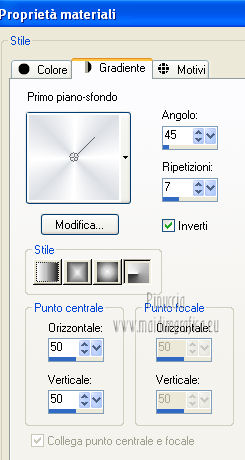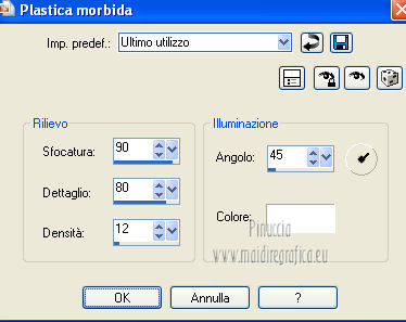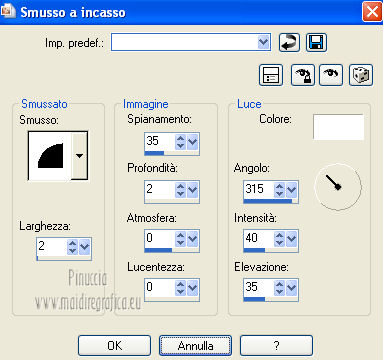 qui puoi trovare qualche risposta ai tuoi dubbi. Se l'argomento che ti interessa non è presente, ti prego di segnalarmelo. Questo tutorial è stato scritto con PSP 9. Per tradurlo, ho usato PSP X. Occorrente: Materiale qui I tubes sono di Jet e Gina. Lo sfondo BG_Window è di Adriana. (in questa pagina trovi i links ai loro siti). Se vuoi condividere i tubes, per favore rispetta il lavoro degli autori, e lascia intatto il livello del watermark. Filtri se hai problemi con i Filtri consulta la mia sezione Filtri qui FM Tile Tools - Blend Emboss qui Animation Shop qui ![]() Imposta il colore di primo piano con #ffffff, e il colore di sfondo con #dcdfe4. Passa il colore a Gradiente di primo piano/sfondo, stile Radiale. ![]() Apri una nuova immagine trasparente 700 x 500 pixels, e riempila con il gradiente.Livelli>Duplica. Effetti>Effetti di trama>Plastica morbida. ![]() Immagine>Rifletti. Cambia la modalità di miscelatura di questo livello in Luminanza (esistente). Apri il tube Gina Misted Divers 400 e vai a Modifica>Copia. Torna al tuo lavoro e vai a Modifica>Incolla come nuovo livello. Livelli>Duplica. Livelli>Unisci>Unisci giù. Effetti>Plugins>FM Tile Tools - Blend Emboss, con i settaggi standard. ![]() Sposta il tube in basso a sinistra.(vedi il mio esempio). Apri il tube jet-woman9 e vai a Modifica>Copia. Torna al tuo lavoro e vai a Modifica>Incolla come nuovo livello. Immagine>Rifletti. Immagine>Ridimensiona, all'85%, tutti i livelli non selezionato. ![]() Regola>Messa a fuoco>Maschera di contrasto. ![]() Sposta il tube a destra e un po' più in basso.![]() Effetti>Effetti 3D>Sfalsa ombra. ![]() Immagine>Aggiungi bordatura, 2 pixels, simmetriche, con il colore #ffffff. Immagine>Aggiungi bordatura, 15 pixels, simmetriche, con il colore #000000. Immagine>Aggiungi bordatura, 10 pixels, simmetriche, con il colore #dcdfe4. Immagine>Aggiungi bordatura, 20 pixels, simmetriche, con il colore #000000. Immagine>Aggiungi bordatura, 2 pixels, simmetriche, con il colore #ffffff. Attiva lo strumento Bacchetta magica ![]() ![]() Clicca nei due bordi neri per selezionarli. Apri BG_Window_AdrianaDesigns e vai a Modifica>Copia. Torna al tuo lavoro e vai a Modifica>Incolla nella selezione. Selezione>Deseleziona. Seleziona il bordo da 10 pixels con la bacchetta magica ![]() ![]() Effetti>Effetti 3D>Smusso a incasso. ![]() Selezione>Deseleziona. Apri il file di testo Window e vai a Modifica>Copia. Torna al tuo lavoro e vai a Modifica>Incolla come nuovo livello. Posiziona il testo come preferisci, o vedi il mio esempio.Aggiungi il tuo nome e/o il tuo watermark su un nuovo livello. Livelli>Unisci>Unisci tutto. Se non vuoi realizzare l'animazione salva in formato jpg. Per realizzare l'animazione: Modifica>Copia. Apri Animation Shop e vai a Modifica>Incolla>Incolla come nuova animazione. Modifica>Duplica, e ripeti finchè non avrai 4 fotogrammi. Clicca sul primo fotogramma per selezionarlo e vai a Modifica>Seleziona tutto. Apri l'animazione vlammetje.mng, anche questa composta da 4 fotogrammi. Modifica>Seleziona tutto. Modifica>Copia. Attiva il tuo lavoro e vai a Modifica>Incolla>Incolla nel fotogramma selezionato. Posiziona la fiammella sulla prima candela. Attiva nuovamente vlammetie.mng. Animazione>Ridimensiona, al 70%. Modifica>Copia. Torna al tuo lavoro e vai a Modifica>Incolla>Incolla nel fotogramma selezionato. Posiziona la fiammella sulla candela più piccola. Animazione>Proprietà fotogramma e imposta la velocità a 26. ![]() Controlla il risultato cliccando su Visualizza e salva in formato gif.![]() Se hai problemi o dubbi, o trovi un link non funzionante, o anche soltanto per dirmi che ti è piaciuto, scrivimi 14 Marzo 2013 |