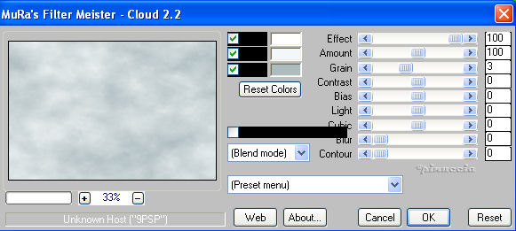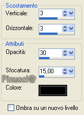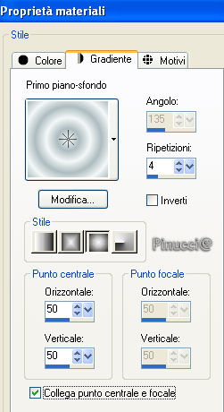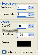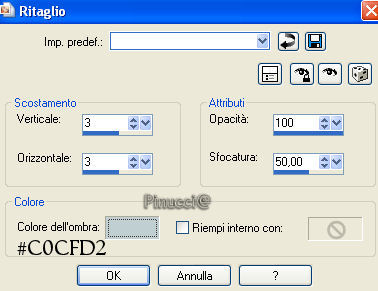 qui puoi trovare qualche risposta ai tuoi dubbi. Se l'argomento che ti interessa non è presente, ti prego di segnalarmelo. Questo tutorial è stato scritto in PSP 9, ma può essere eseguito con qualsiasi versione del programma. Occorrente: Materiale qui I tubes usati per questo tutorial sono di Jet, Brigitte, Angie, e Monique. Il pennello è di Agi Se vuoi condividere i tubes, per favore rispetta il lavoro degli autori, e lascia intatto il livello del watermark. (in questa pagina trovi i links ai siti dei creatori di tubes) Metti il pennello nella cartella dei Pennelli. Attenzione, il pennello è composto da due files che non devono essere separati. Vedi sull'argomento qui Filtri: Mura's Meister - Cloud qui FM Tile Tools qui Filters Unlimited 2.0 qui Apri una nuova immagine trasparente 700 x 470 pixels. Imposta il colore di primo piano con #f3f7f7, e il colore di sfondo con #adbcbf. Effetti>Plugins>Mura's Meister - Cloud: ![]() Apri il tube Tubed by Monique 5F957, e vai a Modifica>Copia. Torna al tuo lavoro e vai a Modifica>Incolla>Incolla come nuovo livello. Immagine>Rifletti. Immagine>ridimensiona, al 120%, tutti i livelli non selezionato. ![]() Effetti>Plugins>FM Tile Tools - Blend Emboss, con i settaggi standard. ![]() Sposta il tube in alto a destra.(vedi il mio esempio). Cambia la modalità di miscelatura di questo livello in Luminanza (esistente), e abbassa l'opacità al 50%. ![]() Apri il tube PAY-JLL2007-16, e vai a Modifica>Copia. Torna al tuo lavoro e vai a Modifica>Incolla>Incolla come nuovo livello. Immagine>ridimensiona, al 120%, tutti i livelli non selezionato. Effetti>Plugins>FM Tile Tools - Blend Emboss, con i settaggi standard. Sposta il tube a sinistra vicino al bordo.(vedi il mio esempio). Cambia la modalità di miscelatura di questo livello in Luminanza (esistente), e abbassa l'opacità al 50%. ![]() Apri il tube jet-flower2-jan-2008, e vai a Modifica>Copia. Torna al tuo lavoro e vai a Modifica>Incolla>Incolla come nuovo livello. Immagine>ridimensiona, al 65%, tutti i livelli non selezionato. Effetti>Effetti 3D>Sfalsa ombra, con i seguenti settaggi: ![]() Sposta il tube in basso al centro.Apri il tube Mtm-Bloem242-Amaryllis, e vai a Modifica>Copia. Torna al tuo lavoro e vai a Modifica>Incolla>Incolla come nuovo livello. Immagine>ridimensiona, all'80%, tutti i livelli non selezionato. Effetti>Effetti 3D>Sfalsa ombra, con i settaggi precedenti. Sposta il tube in basso sopra il fiore precedente.Livelli>Duplica. Sposta il duplicato a destra (una parte resterà fuori dall'immagine).![]() Apri il tube F-MAI2008-47, e vai a Modifica>Copia. Torna al tuo lavoro e vai a Modifica>Incolla>Incolla come nuovo livello. Regola>Messa a fuoco>Metti a fuoco. Effetti>Effetti 3D>Sfalsa ombra, con i settaggi precedenti. Sposta il tube a sinistra, vicino al bordo.Apri il tube jet-bird-okt-2007, e vai a Modifica>Copia. Torna al tuo lavoro e vai a Modifica>Incolla>Incolla come nuovo livello. Immagine>ridimensiona, al 60%, tutti i livelli non selezionato. Effetti>Effetti 3D>Sfalsa ombra, con i settaggi precedenti. Sposta il tube in basso a destra.![]() Passa il colore di primo piano a Gradiente, con i seguenti settaggi: ![]() Immagine>Aggiungi bordatura, 1 pixel, simmetriche, con il colore #6c611d. Immagine>Aggiungi bordatura, 10 pixels, simmetriche, con il colore bianco. Seleziona il bordo bianco con la bacchetta magica ![]() ![]() Riempi la selezione con il gradiente.Selezione>Nessuna selezione. Immagine>Aggiungi bordatura, 1 pixel, simmetriche, con il colore #6c611d. Selezione>Seleziona tutto. Selezione>Modifica>Contrai, 12 pixels. Effetti>Effetti 3D>Ritaglio: ![]() Selezione>Nessuna selezione. Immagine>Aggiungi bordatura, 20 pixels, simmetriche, con il colore bianco. Seleziona questo bordo con la bacchetta magica ![]() e riempilo con il colore di sfondo.Livelli>Nuovo livello raster. Riempi il livello con il colore di sfondo.Effetti>Plugins>Filters Unlimited 2.0 - Special Effects 1 - Halftone. Cambia la modalità di miscelatura di questo livello in Rafforza. Selezione>Nessuna selezione. Immagine>Aggiungi bordatura, 1 pixel, simmetriche, con il colore #adbcbf. Riporta il colore di primo piano da Gradiente a Colore. Livelli>Nuovo livello raster. Attiva lo strumento Pennello ![]() cerca e seleziona il pennello !agiBrush2008_0008_wishes, dimensione 200, e applicalo cliccando con il tasto sinistro del mouse per usare il colore di primo piano. fai attenzione: il nome del pennello inizia con un punto esclamativo. Per questo, seguendo le regole dell'ordine alfabetico, nella lista dovrai cercarlo prima delle lettere alfabetiche). Effetti>Effetti 3D>Sfalsa ombra, con i seguenti settaggi: ![]() Posiziona il pennello come preferisci o come nel mio esempio