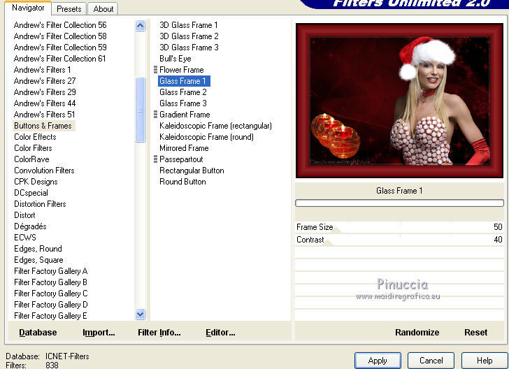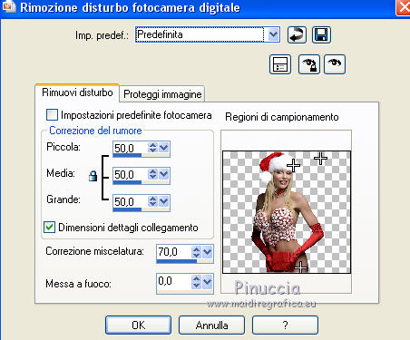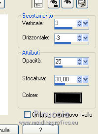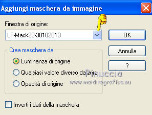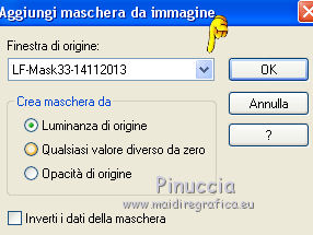 qui puoi trovare qualche risposta ai tuoi dubbi. Se l'argomento che ti interessa non è presente, ti prego di segnalarmelo. Questo tutorial è stato scritto con PSP 9. Dalla versione X4, il comando Immagine>Rifletti è stato sostituito con Immagine>Capovolgi in orizzontale, e il comando Immagine>Capovolgi con Immagine>Capovolgi in verticale. Nelle versioni X5 e X6, le funzioni sono state migliorate rendendo disponibile il menu Oggetti. Vedi la scheda sull'argomento qui Per tradurre questo tutorial ho usato PSP X. Occorrente: Materiale qui Per i tubes grazie Leny e Nikita Per le maschere grazie Linda. (in questa pagina trovi i links ai loro siti). Se vuoi condividere i tubes, per favore rispetta il lavoro degli autori, e lascia intatto il livello del watermark. Filtri: Filters Unlimited 2.0 qui Animation Shop qui ![]() Apri le maschere in PSP e minimizzale con il resto del materiale. Imposta il colore di primo piano con #1e0607, e il colore di sfondo con #73090e. Apri una nuova immagine trasparente 700 x 500 pixels, e riempila con il colore di primo piano.Livelli>Nuovo livello raster. Riempi con il colore di sfondo.Livelli>Nuovo livello maschera>Da immagine. Apri il menu sotto la finestra di origine e vedrai la lista dei files aperti. Seleziona la maschera LF-Mask33-14112013, con i seguenti settaggi. ![]() Livelli>Unisci>Unisci gruppo. Regola>Messa a fuoco>Metti a fuoco. Cambia la modalità di miscelatura di questo livello in Rafforza. Livelli>Nuovo livello raster. Riempi con il colore di sfondo.Livelli>Nuovo livello maschera>Da immagine. Apri il menu sotto la finestra di origine e seleziona la maschera LF-Mask22-30102013, con i seguenti settaggi. ![]() Livelli>Unisci>Unisci gruppo. Immagine>Rifletti. ![]() Apri il tube 30206013508_noel_nikita e vai a Modifica>Copia. Torna al tuo lavoro e vai a Modifica>Incolla come nuovo livello. Immagine>Ridimensiona, una volta al 65% e una volta al 70%, tutti i livelli non selezionato. ![]() Regola>Messa a fuoco>Maschera di contrasto. ![]() Sposta il tube in basso a sinistra.Effetti>Effetti 3D>Sfalsa ombra. ![]() Apri il tube Leny-kerst115 e vai a Modifica>Copia. Torna al tuo lavoro e vai a Modifica>Incolla come nuovo livello. Immagine>Ridimensiona, all'80%, tutti i livelli non selezionato. Regola>Rimozione disturbo fotocamera digitale. ![]() Regola>Messa a fuoco>Maschera di contrasto, con i settaggi precedenti. Posiziona il tube un po' più a destra.![]() Effetti>Effetti 3D>Sfalsa ombra, con i settaggi precedenti. Aggiungi il tuo nome e/o il tuo watermark su un nuovo livello. Immagine>Aggiungi bordatura, 2 pixels, simmetriche, colore #000000. Immagine>Aggiungi bordatura, 45 pixels, simmetriche, colore #73090c. Immagine>Aggiungi bordatura, 5 pixels, simmetriche, colore #000000. Effetti>Plugins>Filters Unlimited 2.0 - Buttons & Frames - Glass Frame 1. ![]() Modifica>Copia. Apri Animation Shop e vai a Modifica>Incolla>Incolla come nuova animazione. Modifica>Duplica, e ripeti finchè non avrai una animazione composta da 4 fotogrammi. Clicca sul primo fotogramma per selezionarlo e vai a Modifica>Seleziona tutto. Apri l'animazione vlammetje.mng, anche questa composta da 4 fotogrammi. Modifica>Seleziona tutto. Modifica>Copia. Attiva il tuo lavoro e vai a Modifica>Incolla>Incolla nel fotogramma selezionato. Posiziona la fiammella sullo stoppino di una candela. Ripeti 3 volte per posizionare una fiammella su ogni candela. Animazione>Proprietà fotogramma, e imposta la velocità a 20. ![]() Controlla il risultato cliccando su Visualizza e salva in formato gif.![]() Se hai problemi o dubbi, o trovi un link non funzionante, o anche soltanto per dirmi che ti è piaciuto, scrivimi 11 Dicembre 2013 |