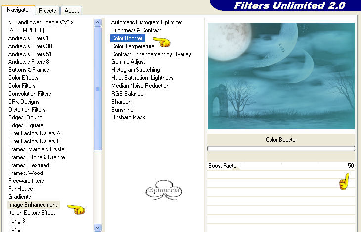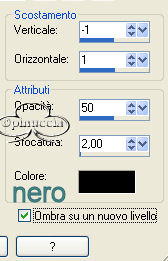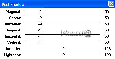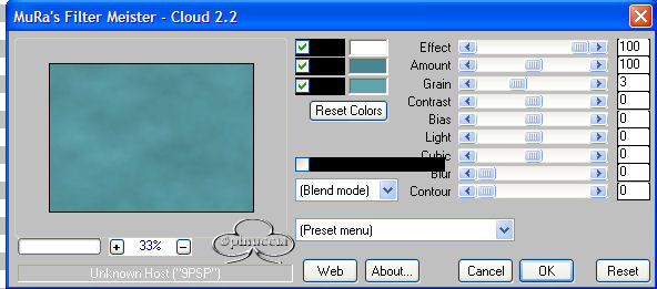 qui puoi trovare qualche risposta ai tuoi dubbi. Se l'argomento che ti interessa non è presente, ti prego di segnalarmelo. Questo tutorial è stato scritto con PSP 9, ma può essere eseguito anche con le altre versioni di PSP. Occorrente: Materiale qui Per favore, se vuoi condividere i tubes, mantieni intatto il livello del nome. Filtri: Mura's Meister qui Xero Porcelain qui Filter Unlimited 2 Bordermania qui Greg's Factory Output 2 qui Penta.com qui Apri una nuova immagine trasparente 550 x 400 pixels. Imposta il colore di primo piano con #49868d, e il colore di sfondo con #5fa3ab. Effetti>Plugins>Mura's Meister / Cloud: ![]() Apri il tube Raz2006_Misted_Mystic Moons e vai a Modifica>Copia. Torna al tuo lavoro e vai a Modifica>Incolla>Incolla come nuovo livello. Con lo strumento Deformazione allarga l'immagine per tutta la larghezza della tela.![]() Apri il tube KMoon e vai a Modifica>copia. Torna al tuo lavoro e vai a Modifica>Incolla>Incolla come nuovo livello. Spostalo nell'angolo in alto a sinistra.Abbassa l'opacità di questo livello all'80%. Livelli>Unisci>Unisci tutto. Effetti>Plugins>Filter Unlimited 2 / Image Enhancement / Color Booster, 50. ![]() Apri il tube SKF-Beauty e vai a Modifica>Copia. Torna al tuo lavoro e vai a Modifica>Incolla>Incolla come nuovo livello. Spostalo un po' più in basso.Cambia la modalità di miscelatura in Luminanza (esistente) e abbassa l'opacità al 90%. Livelli>Unisci>Unisci tutto. Effetti>Plugins>Xero / Porcelain, con i seguenti settaggi: ![]() Livelli>Nuovo livello raster. Imposta il colore di sfondo con #2e6e70. Attiva lo strumento Pennello ![]() Apri il pennello You take me there, Cancella il livello del watermark e vai a File>Esporta>Pennello personalizzato. Dai un nome al pennello e clicca ok. Applicalo cliccando due volte sull'immagine. Cambia la modalità di miscelatura di questo livello in Filtra. Effetti>Effetti 3D>Sfalsa ombra, con i seguenti settaggi, colore nero, ombra su nuovo livello selezionato: ![]() Immagine>Aggiungi bordatura, 3 pixels, simmetriche, con il colore nero. Seleziona il bordo con la bacchetta magica ![]() e riempilo con il colore di primo piano.Mantieni selezionato. Effetti>Plugins>Bordermania - Frame #2. ![]() Selezione>Nessuna selezione. Immagine>Aggiungi bordatura, 20 pixels, simmetriche, con un colore qualsiasi. Seleziona il bordo con la bacchetta magica ![]() e riempilo con il colore di sfondo.Mantieni selezionato. Effetti>Plugins>Greg's Factory Output vol. 2 / Pool Shadow. ![]() Mantieni selezionato. Effetti>Plugins>Penta.com / Color dot: ![]() Selezione>Nessuna selezione. Immagine>Aggiungi bordatura, 3 pixels, simmetriche. Seleziona il bordo con la bacchetta magica ![]() e riempilo con il colore di primo piano #2e6e70.Effetti>Plugins>Bordermania, con i settaggi precedenti. Selezione>Nessuna selezione. Livelli>nuovo livello raster. Aggiungi il tuo nome o il tuo watermark. Salva in formato jpg. ![]() Se hai problemi o dubbi, o trovi un link non funzionante, o anche soltanto per dirmi che ti è piaciuto, scrivimi Ottobre 2006 |