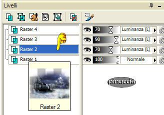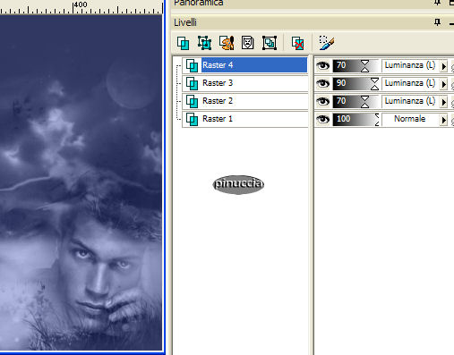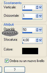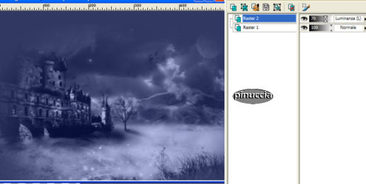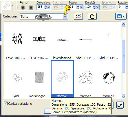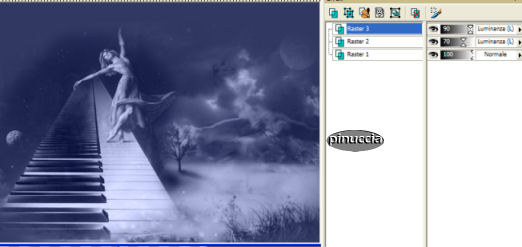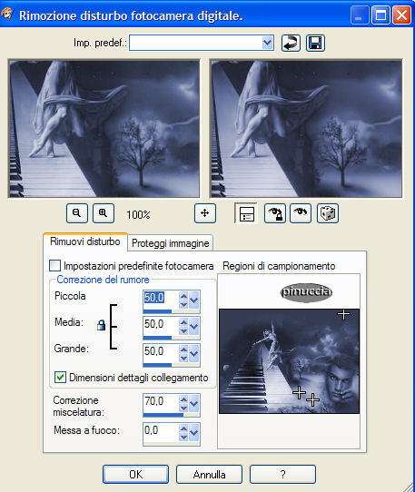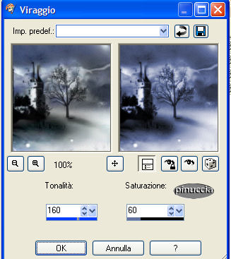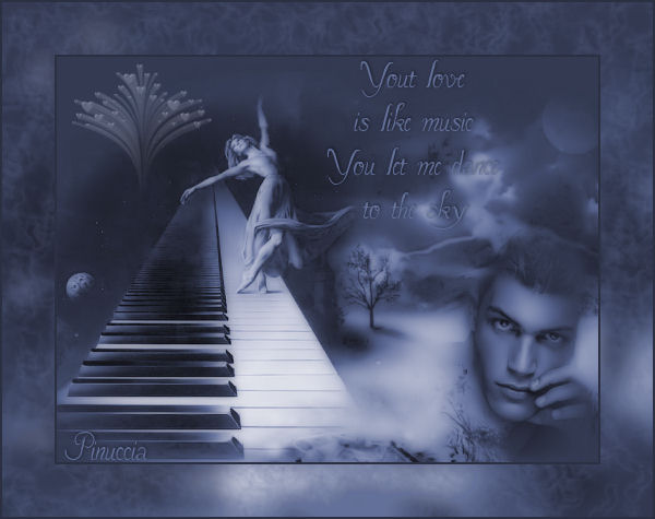 qui puoi trovare qualche risposta ai tuoi dubbi. Se l'argomento che ti interessa non è presente, ti prego di segnalarmelo. Questo tutorial è stato scritto in PSP 9, ma può essere eseguito anche con le altre versioni di PSP. Occorrente: Materiale qui Filtri: Xero qui Se vuoi condividere i tubes, per favore lascia intatto il livello del watermark. Apri una nuova immagine trasparente 500 x 375 pixels. Imposta il colore di primo piano su #313963, e il colore di sfondo su #637099. Riempi l'immagine con il colore di primo piano.Apri il tube SS_636 Misted. Immagine>Rifletti. Modifica>Copia. Torna al tuo lavoro e vai a Modifica>Incolla>Incolla come nuovo livello. Spostalo in basso a destra.Nella paletta dei livelli cambia la modalità di miscelatura in Luminanza (Esistente) e abbassa l'opacità al 70%. ![]() Apri il tube SS_648 Misted. Immagine>Ridimensiona, del 70%, tutti i livelli selezionato. ![]() Modifica>Copia. Torna al tuo lavoro e vai a Modifica>Incolla>Incolla come nuovo livello. Mettilo a sinistra vicino al bordo.Cambia la modalità di miscelatura in Luminanza (esistente) e abbassa l'opacità al 90%. ![]() Apri il tube man-mist. Immagine>Ridimensiona, del 70%, tutti i livelli selezionato. Modifica>Copia. Torna al tuo lavoro e vai a Modifica>Incolla>incolla come nuovo livello. Spostalo in basso a destra.Cambia la modalità di miscelatura in Luminanza (esistente) e abbassa l'opacità al 70%. ![]() Nella paletta dei livelli attiva il livello Raster 2 (quello dello sfondo). ![]() Attiva lo strumento Gomma , dimensione 30,durezza 5, opacità 20, e cancella i segni dello sfondo dal viso e dalla mano dell'uomo. ![]() Livelli>Unisci>Unisci tutto. Regola>Saturazione e tonalità>Viraggio: ![]() Regola>Correzione fotografica>Rimozione disturbo fotocamera digitale, con i settaggi standard: ![]() Apri il tube Golden hearts. Immagine>Ridimensiona, del 50%, tutti i livelli selezionato. Modifica>Copia. Torna al tuo lavoro e vai a Modifica>Incolla>Incolla come nuovo livello. Spostalo nell'angolo in alto a sinistra.Cambia la modalità di miscelatura in Luminanza (esistente) e abbassa l'opacità all'80%. Livelli>Unisci>Unisci tutto. Effetti>Plugins>Xero - Porcelain: ![]() Modifica>Copia (per copiare il tuo lavoro e tenerlo in memoria). Immagine>Aggiungi bordatura, 50 pixels, simmetriche, con il colore bianco (#ffffff). Seleziona il bordo con la bacchetta magica ![]() Modifica>Incolla>Incolla nella selezione. Regola>Sfocatura>Sfocatura gaussiana, raggio 10. ![]() Attiva lo strumento Pennello ![]() clicca sul triangolino della finestra dei pennelli per aprire il menu, e cerca il pennello Marmo 1 (è tra i pennelli standard di PSP). ![]() Applicalo con il colore di sfondo (quindi cliccando con il tasto destro del mouse) casualmente intorno al bordo selezionato. Imposta il colore di primo piano su #2b3143. Selezione>Seleziona tutto. Selezione>Modifica>Contrai, di 50 pixels. Livelli>Nuovo livello raster. Riempi con il colore di primo piano.Selezione>Modifica>Contrai, di 2 pixels. Premi sulla tastiera il tasto CANC. Selezione>Seleziona tutto. Selezione>Modifica>Contrai, di 2 pixels. Selezione>Inverti. Riempi con il colore di primo piano.Selezione>Nessuna selezione. Livelli>Nuovo livello raster. Attiva lo strumento Testo ![]() Chiudi il colore di primo piano. Scegli un font (io ho usato Pavane, dimensione 28). Scrivi: Your love is like music You let me dance to the sky. Effetti>Effetti 3D>Sfalsa ombra, con i seguenti settaggi, colore nero, ombra su nuovo livello selezionato. ![]() Se vuoi, aggiungi in un nuovo livello il tuo nome o il tuo watermark. Livelli>Unisci>Unisci tutto. Salva in formato jpg. ![]() Se hai problemi o dubbi, o trovi un link non funzionante, o anche soltanto per dirmi che ti è piaciuto, scrivimi Novembre 2006 |