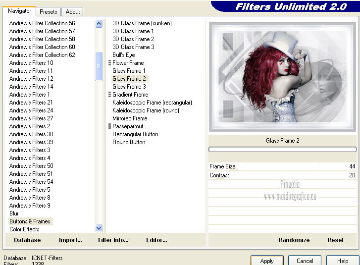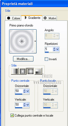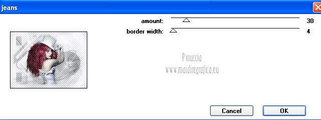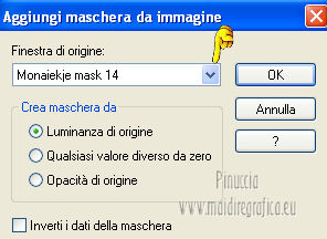 qui puoi trovare qualche risposta ai tuoi dubbi. Se l'argomento che ti interessa non è presente, ti prego di segnalarmelo. Questo tutorial è stato scritto con PSP 9. Per tradurlo, ho usato PSP X. Occorrente: Materiale qui I tubes sono di Paulina, Roxyfloxsy e Nikita. La maschera è di Monaiekje. (in questa pagina trovi i links ai loro siti). Se vuoi condividere i tubes, per favore rispetta il lavoro degli autori, e lascia intatto il livello del watermark. Filtri se hai problemi con i filtri, controlla la sezione Filtri qui Unplugged Tools qui Penta.com - Jeans qui Filters Unlimited 2.0 qui ![]() Apri la maschera in PSP e minimizzala con il resto del materiale. Apri una nuova immagine trasparente 700 x 500 pixels. Imposta il colore di primo piano con #c4c5ca, e il colore di sfondo con #f6f6f8. Riempi l'immagine trasparente con il colore di primo piano.Effetti>Plugins>Unplugged Tools - Spice Dots. ![]() Apri il tube 13154694106_femmes (misted-nikita) e vai a Modifica>Copia. Torna al tuo lavoro e vai a Modifica>Incolla come nuovo livello. Sposta il tube in basso a destra.(Vedi il mio esempio). Cambia la modalità di miscelatura di questo livello in luminanza (esistente), e abbassa l'opacità al 60%. Apri il tube RF-abstract33 e vai a Modifica>Copia. Torna al tuo lavoro e vai a Modifica>Incolla come nuovo livello. Sposta il tube a sinistra.Cambia la modalità di miscelatura di questo livello in luminanza (esistente), e abbassa l'opacità al 48%. Livelli>Nuovo livello raster. Riempi con il colore di sfondo.Livelli>Nuovo livello maschera>Da immagine. Apri il menu sotto la finestra di origine e vedrai la lista dei files aperti. Seleziona la maschera monaiekje mask 14. ![]() Livelli>Unisci>Unisci gruppo. Apri il tube RF-abstract 13 e vai a Modifica>Copia. Torna al tuo lavoro e vai a Modifica>Incolla come nuovo livello. Immagine>Ridimensiona, all'80%, tutti i livelli non selezionato. Sposta il tube in alto a destra.Cambia la modalità di miscelatura di questo livello in luminanza (esistente), e abbassa l'opacità al 30%. Apri il tube RF-abstract 15 e vai a Modifica>Copia. Torna al tuo lavoro e vai a Modifica>Incolla come nuovo livello. Sposta il tube in basso a sinistra.Cambia la modalità di miscelatura di questo livello in luminanza (esistente), e abbassa l'opacità al 26%. ![]() Attiva lo strumento Selezione , rettangolo![]() traccia una selezione come nell'esempio (se non visualizzi i righelli, vai a Visualizza>Righelli). ![]() Premi sulla tastiera il tasto CANC. Selezione>Deseleziona. Risultato. ![]() Apri il tube PaulinDesign-Gothic-Girl e vai a Modifica>Copia. Torna al tuo lavoro e vai a Modifica>Incolla come nuovo livello. Immagine>Rifletti. Immagine>Ridimensiona, al 70%, tutti i livelli non selezionato. Regola>Messa a fuoco>Maschera di contrasto. ![]() Sposta il tube in basso a sinistra.Effetti>Effetti 3D>Sfalsa ombra. ![]() Livelli>Unisci>Unisci tutto. Livelli>Nuovo livello raster. Selezione>Seleziona tutto. Riempi con il colore di sfondo.Selezione>Modifica>Contrai - 2 pixels. Premi sulla tastiera il tasto CANC. Selezione>Deseleziona. Passa il colore di primo piano a Gradiente. ![]() Immagine>Aggiungi bordatura, 30 pixels, simmetriche, con il colore nero #000000. Attiva lo strumento Bacchetta magica ![]() ![]() Clicca nel bordo per selezionarlo. Riempi la selezione con il gradiente.Regola>Sfocatura>Sfocatura gaussiana - raggio 25. ![]() Effetti>Plugins>Penta.com - Jeans. ![]() Selezione>Deseleziona. Immagine>Aggiungi bordatura, 2 pixels, simmetriche, con il colore #f6f6f8. Immagine>Aggiungi bordatura, 15 pixels, simmetriche, con il colore #c4c5ca. Immagine>Aggiungi bordatura, 2 pixels, simmetriche, con il colore #f6f6f8. Effetti>Plugins>Filters Unlimited 2.0 - Buttons & Frames - Glass Frame 2. ![]() Aggiungi il tuo nome e/o il tuo watermark su un nuovo livello. Livelli>Unisci>Unisci tutto e salva in formato jpg. ![]() Se hai problemi o dubbi, o trovi un link non funzionante, o anche soltanto per dirmi che ti è piaciuto, scrivimi 21 Febbraio 2013 |