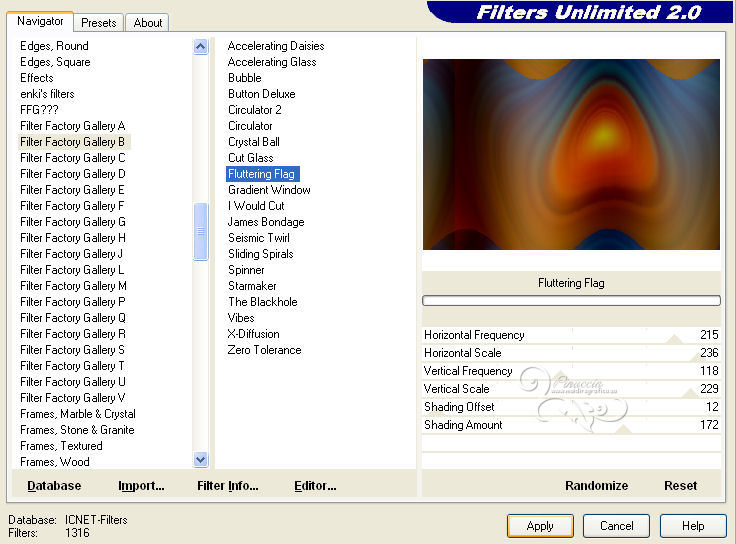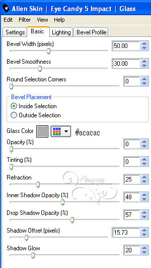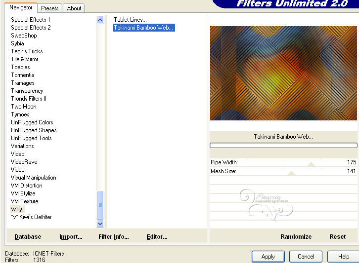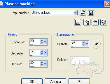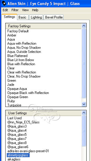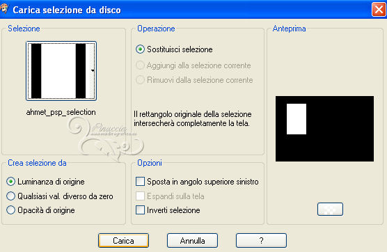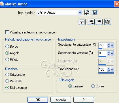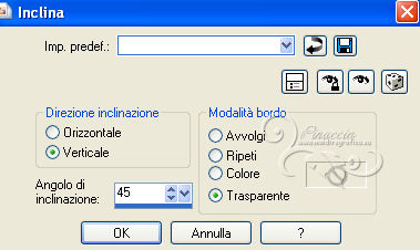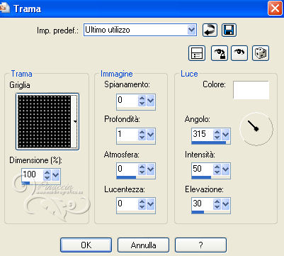 qui puoi trovare qualche risposta ai tuoi dubbi. Se l'argomento che ti interessa non è presente, ti prego di segnalarmelo. Questo tutorial è stato creato con PSP X2 e tradotto con PSPX, ma può essere eseguito anche con le altre versioni. Dalla versione X4, il comando Immagine>Rifletti è stato sostituito con Immagine>Capovolgi in orizzontale, e il comando Immagine>Capovolgi con Immagine>Capovolgi in verticale. Nelle versioni X5 e X6, le funzioni sono state migliorate rendendo disponibile il menu Oggetti. Con la nuova versione X7, sono tornati Rifletti>Capovolgi, ma con nuove varianti. Vedi la scheda sull'argomento qui Occorrente: Materiale qui Il tube della donna è di Hazal Filtri in caso di dubbi, ricorda di consultare la mia sezione filtri qui Filters Unlimited 2.0 qui Filter Factory Gallery B - Fluttering Flag qui Willy - Takinami Bamboo Web qui Graphics Plus - Cross Shadow, Emboss qui AAA Frames - Foto Frame qui Mura's Meister - Perspective Tiling qui Alien Skin Eye Candy 5 Impact - Glass qui I filtri Factory Gallery per essere usati devono prima essere convertiti. Come fare vedi qui Si usano importandoli in Filters Unlimited (come fare vedi qui) ma possono funzionare anche da soli. Anche i filtri Willy e Graphics Plus si possono usare da soli o importati in Filters Unlimited. Se un filtro fornito appare con questa icona ![]() Metti il preset Cliccando sul file una o due volte (a seconda delle tue impostazioni), automaticamente il preset si installerà nella cartella corretta. perchè uno o due clic vedi qui Metti la selezione nella cartella Selezioni. Apri le maschere in PSP e minimizzale con il resto del materiale. 1. Imposta il colore di primo piano con #ef993a, e il colore di sfondo con #5d3b27. 2. Apri una nuova immagine trasparente 850 x 550 pixels. Selezione>Seleziona tutto. Apri l'immagine sunset-66658 e vai a Modifica>Copia. Torna al tuo lavoro e vai a Modifica>Incolla nella selezione. Selezione>Deseleziona. 3. Regola>Sfocatura>Sfocatura radiale. ![]() 4. Effetti>Plugins>Filters Unlimited 2.0 - Filter Factory Gallery B - Fluttering Flag. ![]() 5. Livelli>Duplica. Immagine>Ruota per gradi - 90 gradi a sinistra. ![]() 6. Effetti>Effetti di immagine>Motivo unico. ![]() 7. Effetti>Effetti di bordo>Aumenta. Cambia la modalità di miscelatura di questo livello in Sovrapponi. Livelli>Unisci>Unisci tutto. 8. Livelli>Duplica. Effetti>Plugins>Filters Unlimited 2.0 - Willy - Takinami Bamboo Web. ![]() 9. Abbassa l'opacità di questo livello al 50%. Livelli>Duplica. Immagine>Ruota per gradi - 90 gradi a sinistra. ![]() 10. Effetti>Effetti geometrici>Inclina. ![]() 11. Effetti>Effetti di trama>Trama - seleziona la trama Griglia, con i seguenti settaggi. nelle versioni più recenti di PSP corrisponde alla trama Corel_15_006. ![]() 12. Effetti>Effetti di trama>Plastica morbida. ![]() 13. Livelli>Unisci>Unisci tutto. Livelli>Nuovo livello raster. Riempi con il colore di primo piano #ef993a.14. Livelli>Nuovo livello maschera>Da immagine. Apri il menu sotto la finestra di origine e vedrai la lista dei files aperti. Seleziona la maschera "PspMaSK_1", con i seguenti settaggi: ![]() Livelli>Unisci>Unisci gruppo. Effetti>Effetti di bordo>Aumenta di più. 15. Effetti>Effetti 3D>Sfalsa ombra. ![]() 16. Livelli>Unisci>Unisci tutto. 17. Livelli>Nuovo livello raster. Selezione>Carica/Salva selezione>Carica selezione da disco. Cerca e carica la selezione ahmet_psp_selection. ![]() Imposta il colore di primo piano con il colore bianco #ffffff. Riempi la selezione con il colore bianco.Selezione>Modifica>Contrai - 10 pixels. 18. Apri l'immagine Picture product_1679 e vai a Modifica>Copia. Torna al tuo lavoro e vai a Modifica>Incolla nella selezione. 19. Effetti>Plugins>Graphics Plus - Emboss. ![]() 20. Effetti>Plugins>AAA Frames - Foto Frame. ![]() 21. Selezione>Modifica>Contrai - 10 pixels. Effetti>Plugins>Alien Skin Eye Candy 5 Impact - Glass. Seleziona il preset ahmetpspglass e ok. ![]() Questi i settaggi che, in caso di problemi con il preset, puoi impostare manualmente. ![]() Selezione>Deseleziona. 22. Effetti>Effetti 3D>Sfalsa ombra. ![]() 23. Livelli>Unisci>Unisci tutto. 24. Apri TexT.psp e vai a Modifica>Copia. Torna al tuo lavoro e vai a Modifica>Incolla come nuovo livello. 25. Effetti>Effetti di immagine>Scostamento. ![]() Cambia la modalità di miscelatura di questo livello in Indebolisci. 26. Effetti>Effetti 3D>Sfalsa ombra. ![]() 27. Livelli>Unisci>Unisci tutto. 28. Livelli>Nuovo livello raster. Riporta il colore di primo piano al colore iniziale #ef993a. Riempi con il colore di primo piano.29. Livelli>Nuovo livello maschera>Da immagine. Apri il menu sotto la finestra di origine, e seleziona la maschera PspMaSK2010. ![]() Livelli>Unisci>Unisci gruppo. 30. Effetti>Effetti 3D>Sfalsa ombra, con i settaggi precedenti. Effetti>Effetti di trama>Trama, con i settaggi precedenti. Effetti>Effetti di bordo>Aumenta. Effetti>Effetti 3D>Sfalsa ombra, con i settaggi precedenti. 31. Effetti>Plugins>Mura's Meister - Perspective Tiling. ![]() 32. Apri ahmetpsp_Kose e vai a Modifica>Copia. Torna al tuo lavoro e vai a Modifica>Incolla come nuovo livello. Effetti>Effetti di immagine>Scostamento. ![]() Cambia la modalità di miscelatura di questo livello in Sovrapponi. 33. Apri ahmetpsp_lamp e vai a Modifica>Copia. Torna al tuo lavoro e vai a Modifica>Incolla come nuovo livello. Effetti>Effetti di immagine>Scostamento. ![]() 34. Apri ListenToMe_Text e vai a Modifica>Copia. Torna al tuo lavoro e vai a Modifica>Incolla come nuovo livello. Effetti>Effetti di immagine>Scostamento. ![]() Cambia la modalità di miscelatura di questo livello in Sovrapponi. 35. Apri womantubes224_HaZal, e vai a Modifica>Copia. Torna al tuo lavoro e vai a Modifica>Incolla come nuovo livello. Immagine>Ridimensiona, al 65%, tutti i livelli non selezionato. ![]() Regola>Messa a fuoco>Metti a fuoco. Effetti>Effetti 3D>Sfalsa ombra. ![]() 36. Apri Hazal_tubes12, e vai a Modifica>Copia. Torna al tuo lavoro e vai a Modifica>Incolla come nuov